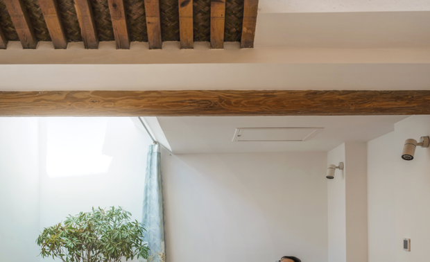 再与另外一开间的隔墙一侧,设计保留了原建筑的木质结构。由于抬高了原有标高的原因, 客厅空间与原有的木梁椽子这些传统木构架更近了,甚至顺着楼梯向上走可以清晰的观看与抚摸这些具有年代感的建筑体量。 整个建筑变成了触摸式的古建博物馆,我甚至有点羡慕能在这里长大的小朋友。现在出生的小朋友,都是在钢筋混凝土的盒子里长大,居住空间被各种工业体系定义成了各种风格,陪在他们左右的装饰的材料也是像瓷砖,墙板这种无机的工业制成品。在我看来,它们都少了点温度,看似定制化很高的居住体验但却和自然切断了联系。