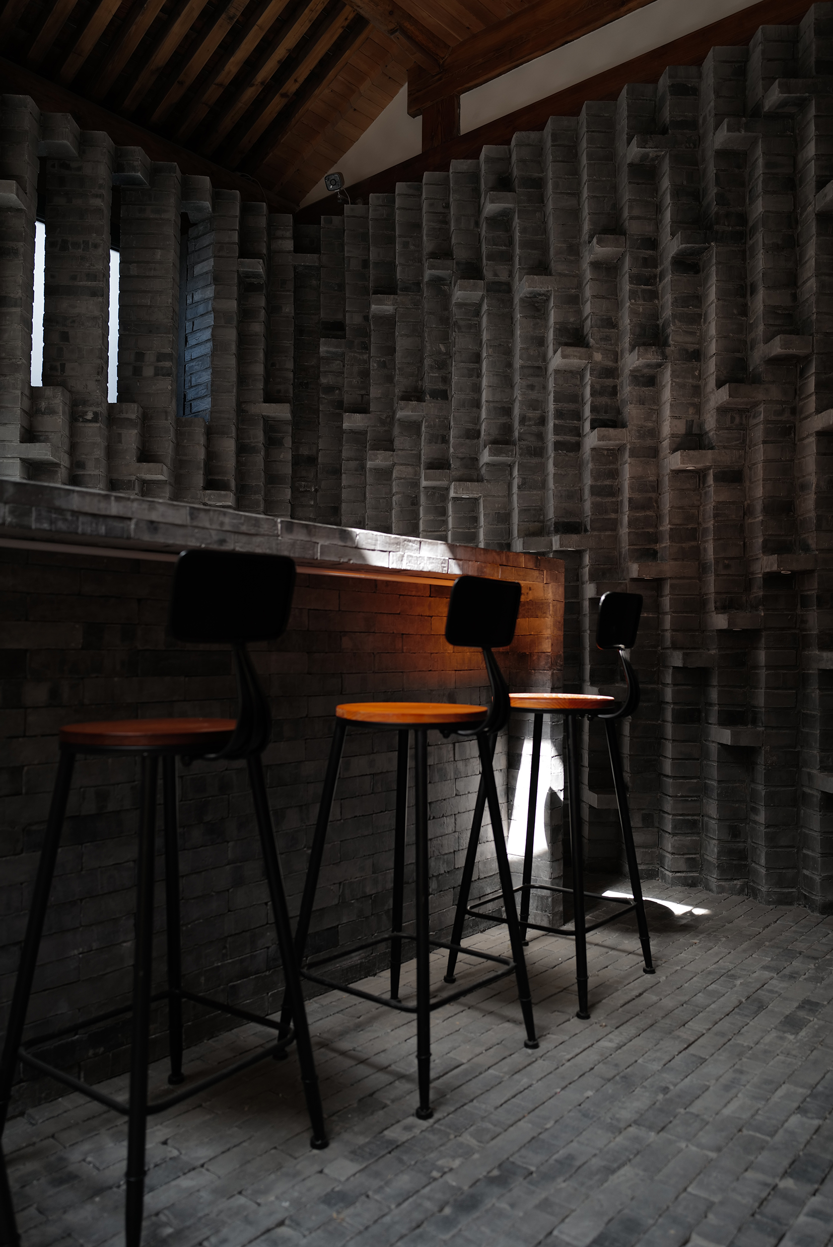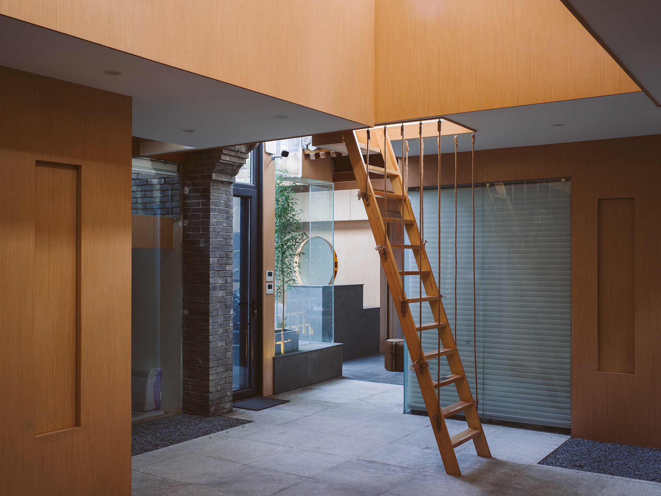 空间意境:待改造建筑是一套标准的一进的四合院,正房,倒座房位于南北两边,东西厢房分列两侧。而特别的是院子在早年间封了起来形成了室内空间。坡屋顶上面做了圈梁,然后在上面支起了木桁架用于支撑起阳光板的屋顶, 结构虽然简单,但却把原本室外的庭院变成了室内空间。 高窗和半透明的阳光板同时保证了通风和采光。 虽然这一举动完全改变了经典四合院的空间结构但却为改造创造了更多的空间可能。项目位于天桥储子营胡同,出于对整体规划和周围邻里的尊重,建筑基本属于原拆原建并且保留了之前的高度。项目在原址上的翻建以及加建,设计最大限度的保留了四合院原有的布局和建筑形式,整个建筑拥有让人难以忽视的亲近感,带有可识别的城市与建筑的历史信息。同时又营造出了新的空间体验。