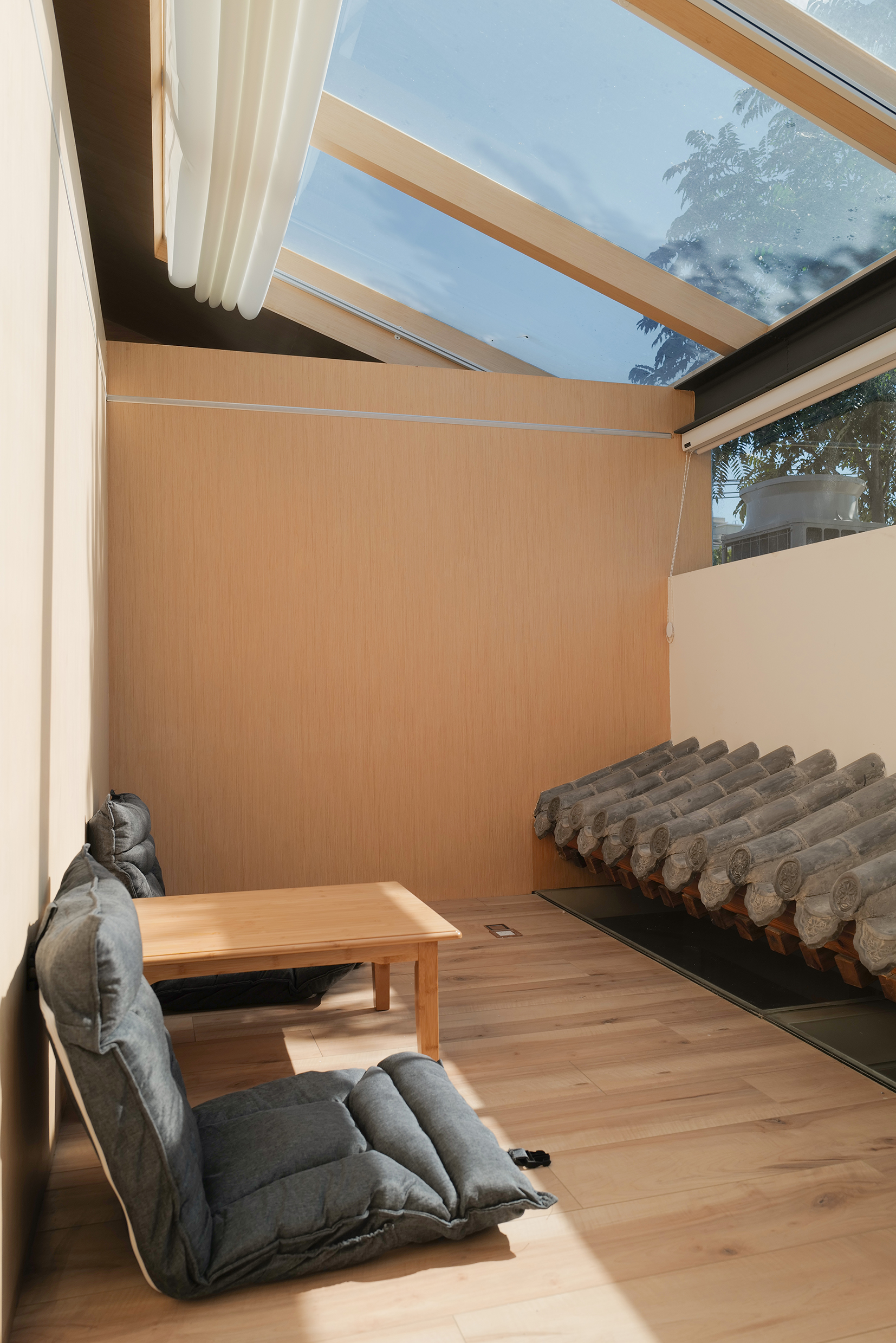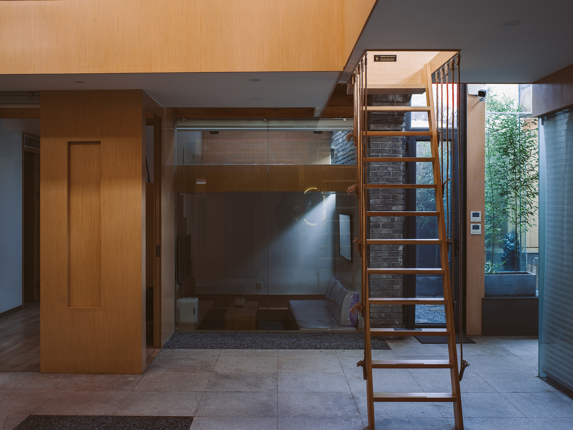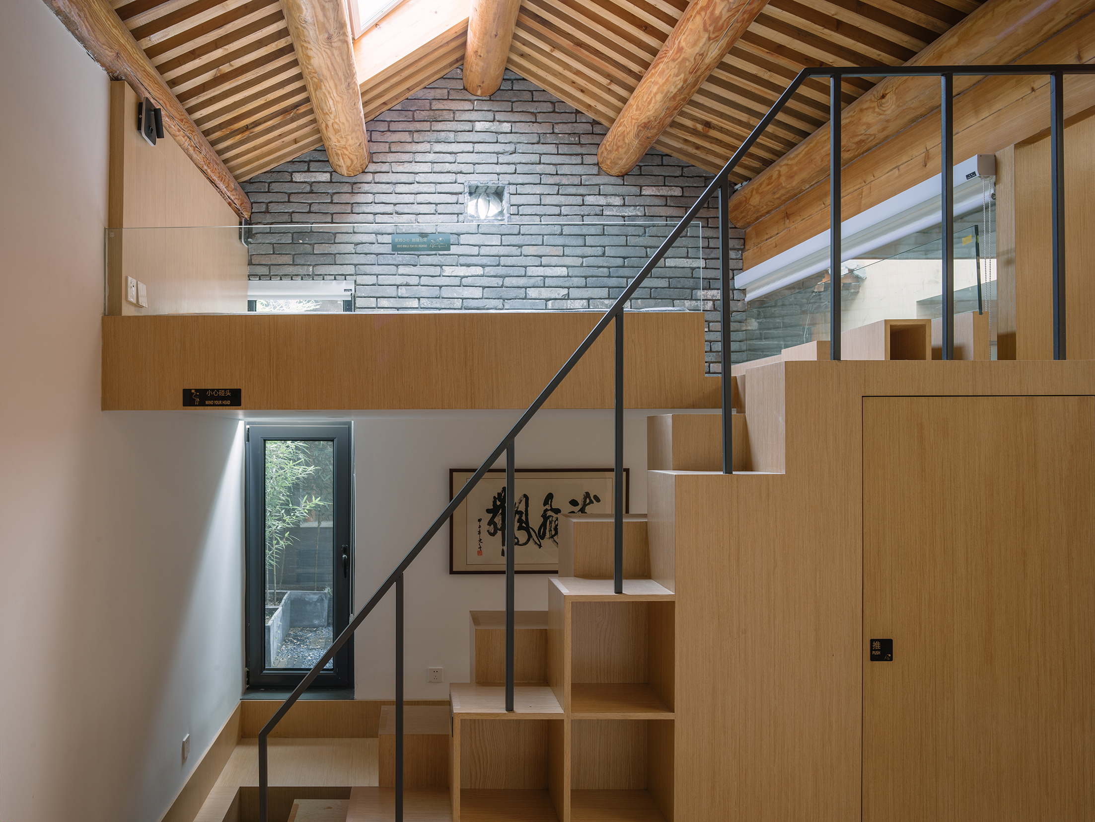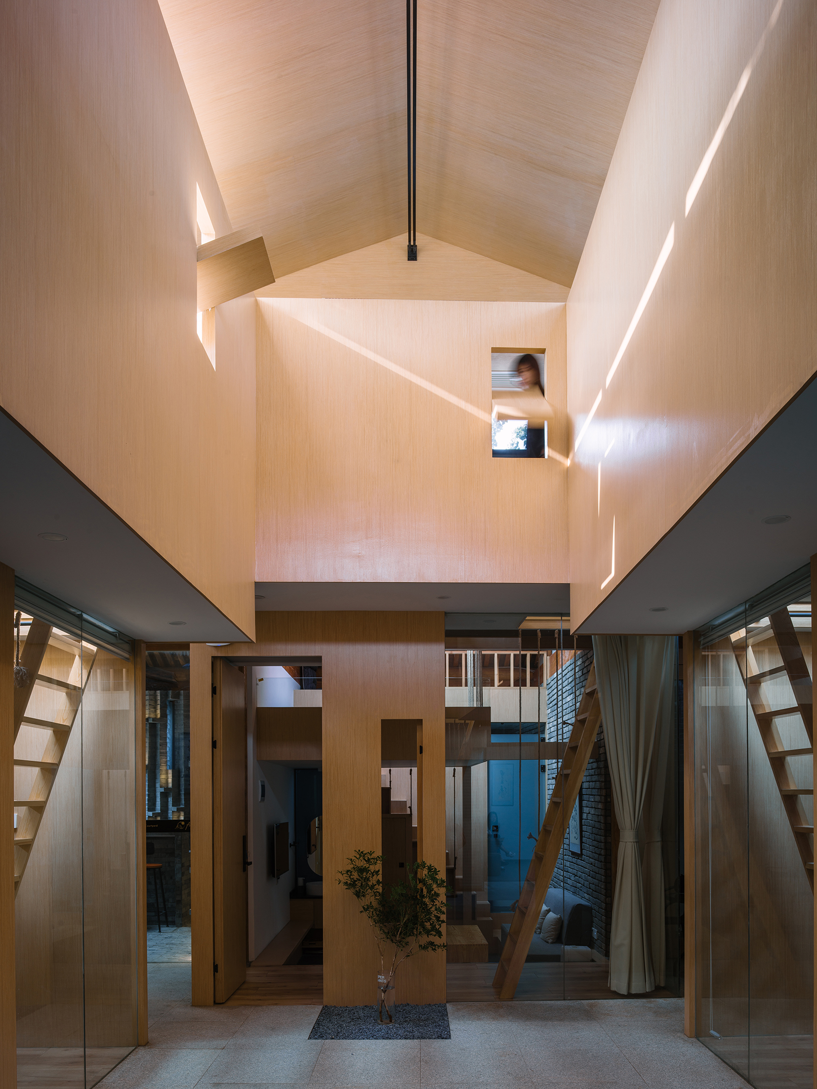 天井向上看去,翻转的窗户好像好像不知去向的通道,阳光透过窗户的形状打在木板上,增加了很多趣味。
