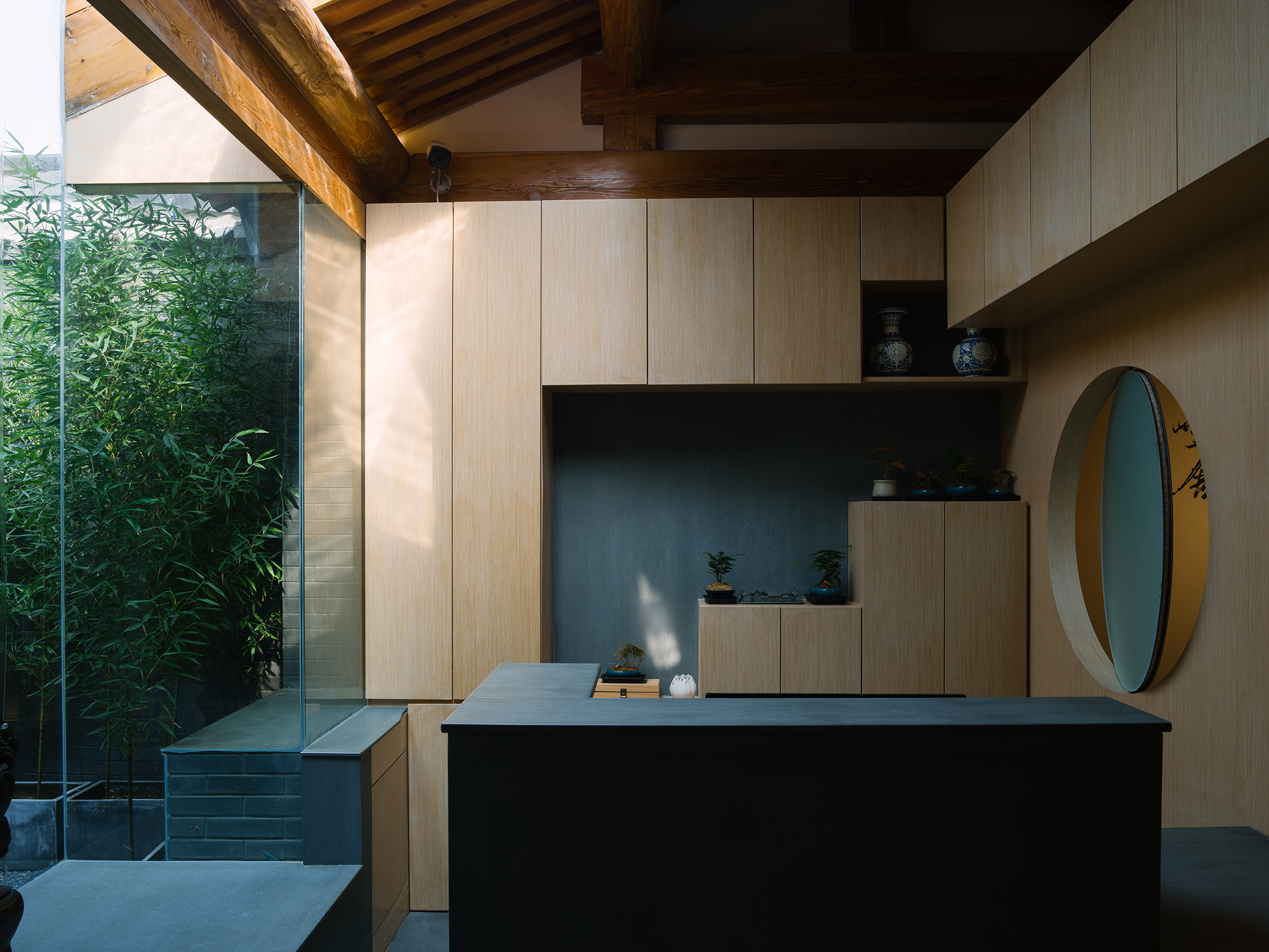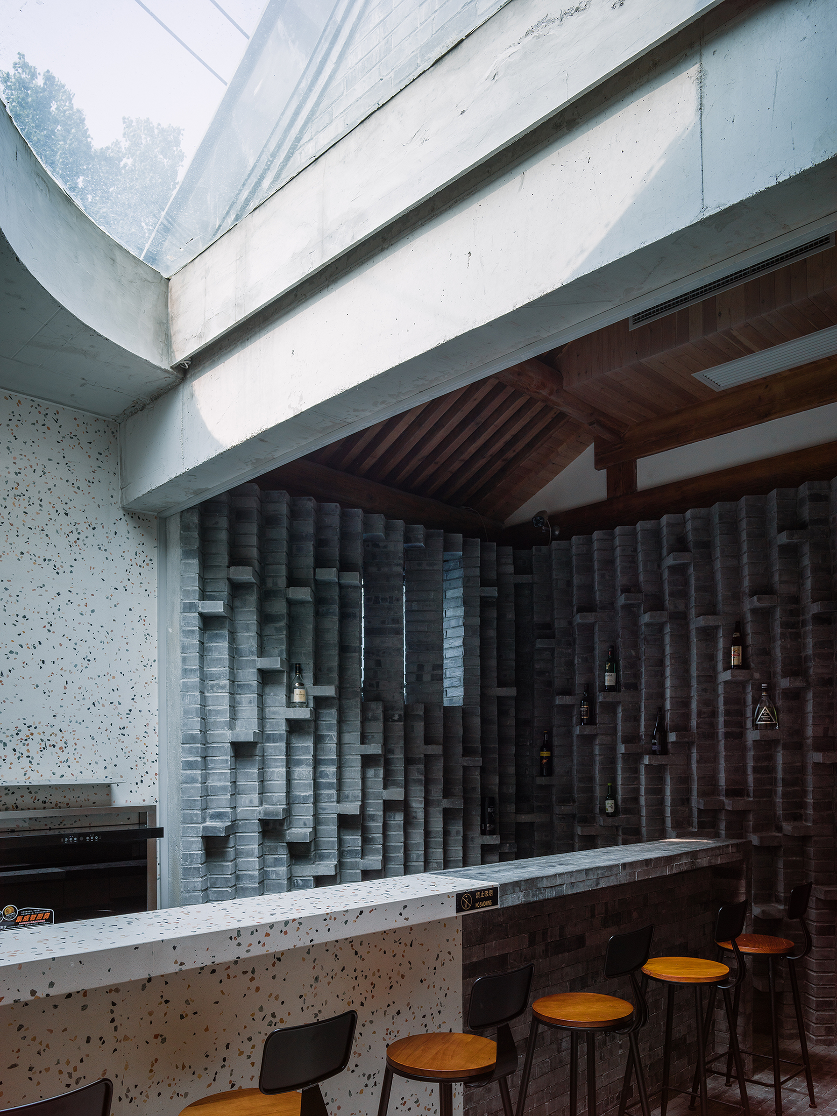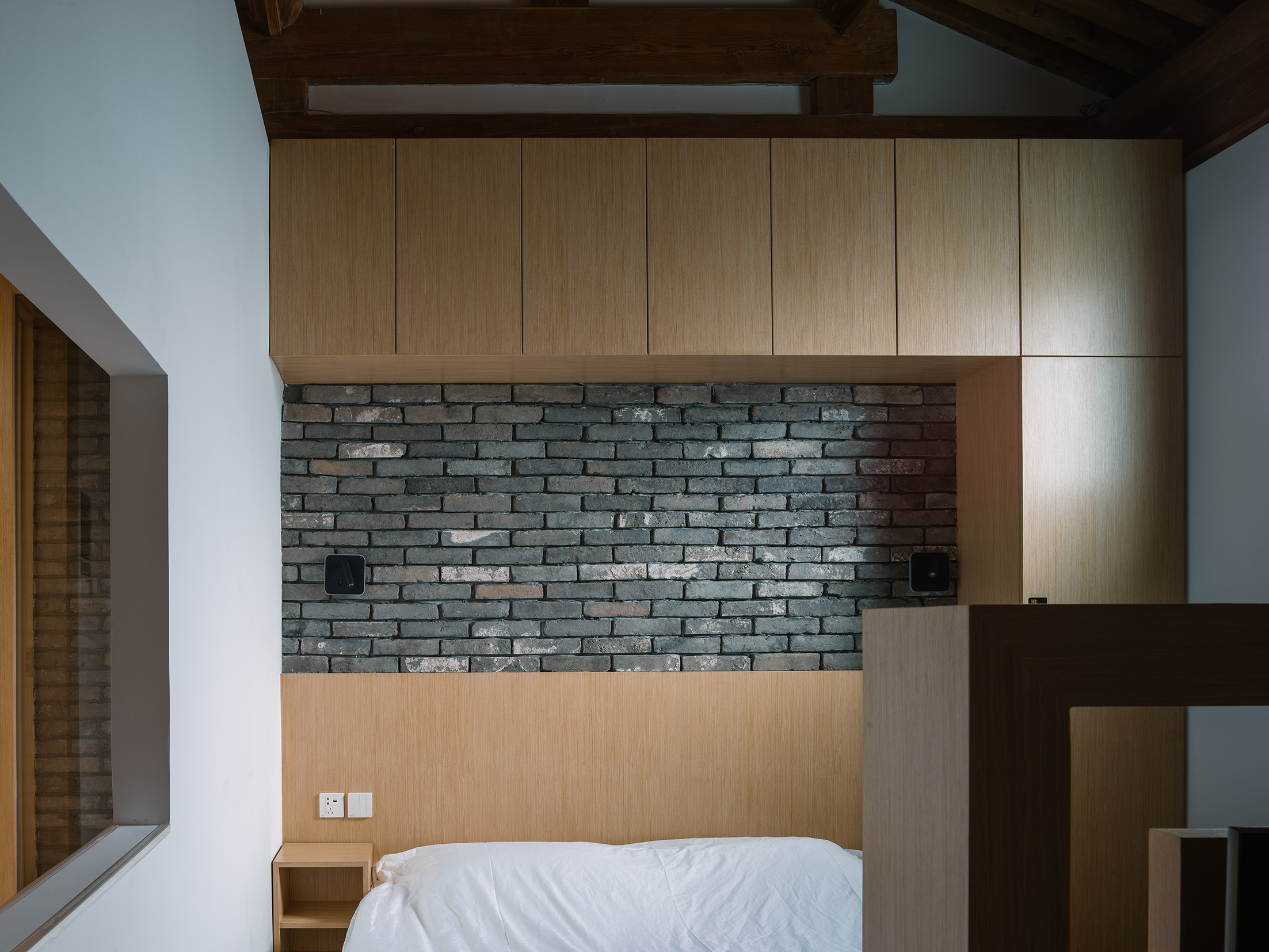 设计选材:这是新老建筑的共存,不同的时代,不同的结构被用来满足人们不同的需求。让居住者在享有现代居住环境的同时更能近距离的,解剖性的感受体验四合院建筑传统的构造形式。在相对局促的空间内把空间再次划分以满足不同功能需求,每个区域也不显得局促。 南北房和东西厢房同样沿用了传统四合院砖木混合四梁八柱的建筑结构形式,而新植入的空间区域则采用钢结构和混凝土等现代结构形式。在原房屋上改造的部分保留原始结构,新建的空间采用现代结构。新建的“鸽子窝”用纯粹的几何形体架于屋顶。与原有的屋顶在视觉上形成了形体的穿插,青砖山墙及瓦当被包裹进室内。屋顶的采光玻璃面加上了半透遮光帘,将日光过滤成更加柔和的光线。这一系列的处理,将室内与室外空间的模糊,现代与传统建筑的对比与相同,明快与温馨氛围的营造,新与旧的关系变得暧昧。悬浮的“鸽子窝”由钢结构搭建,从结构上与砖木结构的建筑主体脱开。 清晰的结构关系让原有的木结构也得以暴露出来。餐厅吧台的位置横跨了正方西侧一间和西耳房两个空间。 设计将新建的耳房和现状正方通过材料进行了视觉上的区分。白色水磨石和青砖将空间一分为二,黑与白,光滑与粗糙,简单与复杂从高度,肌理、立面材质、空间差异化几个不同的方面产生了对比。