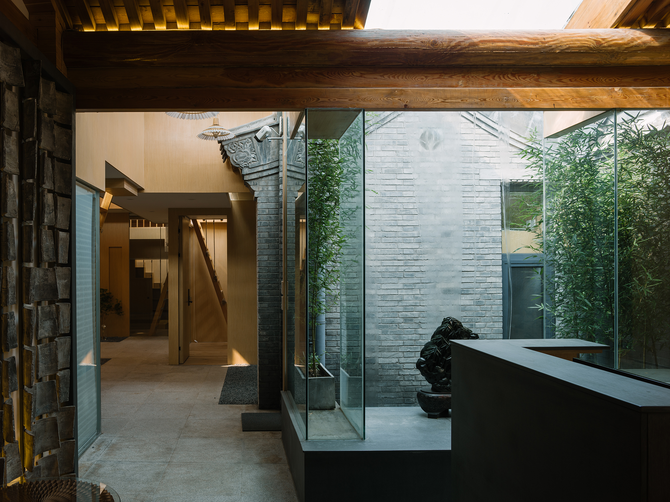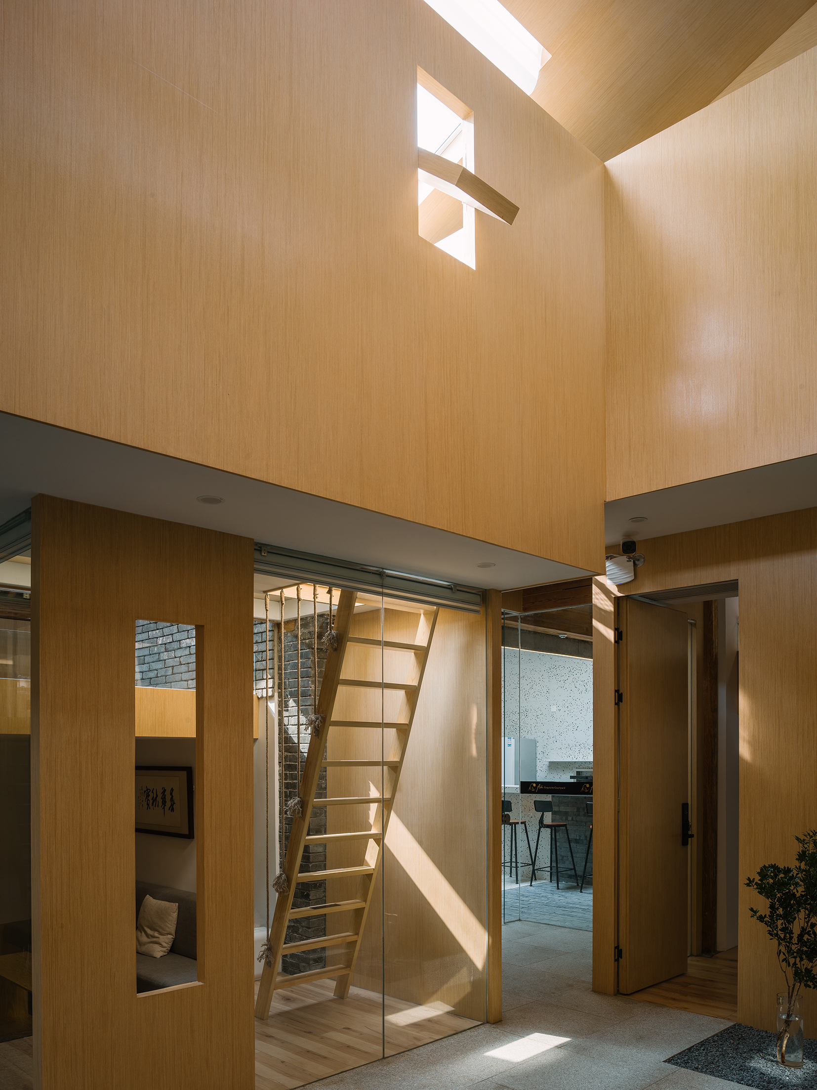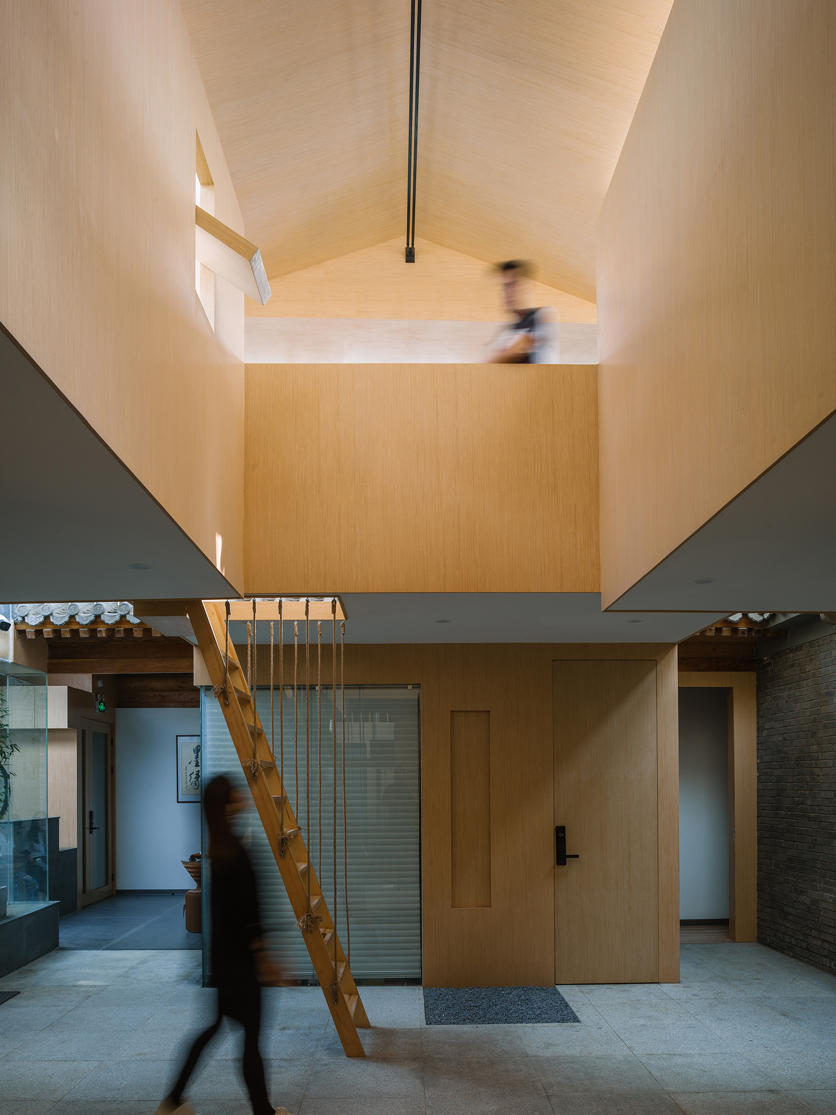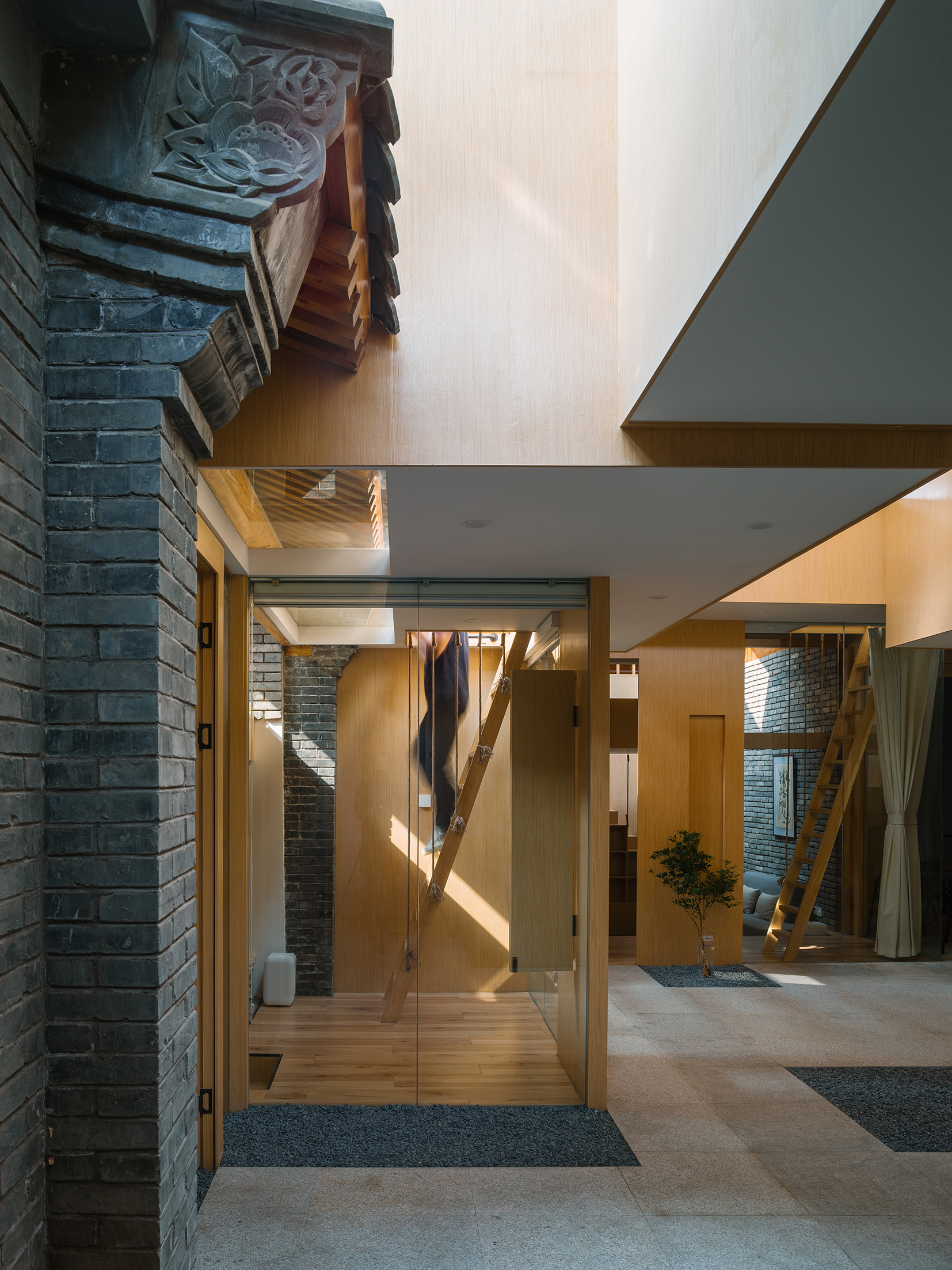 就像是《邪不压正》中李天然和关巧红碰面的地方,北京四合院的屋顶是这城墙内少有的自由,浪漫,能放空一切的场所。被支撑起来的空间像是漂浮于屋檐之上,为庭院带来了有组织的阳光。在不同标高上的空间在保证私密的同时空间上也同样连贯,人们可以产生视线交流,这既增加了温馨感,空间也变得更连通了。 -