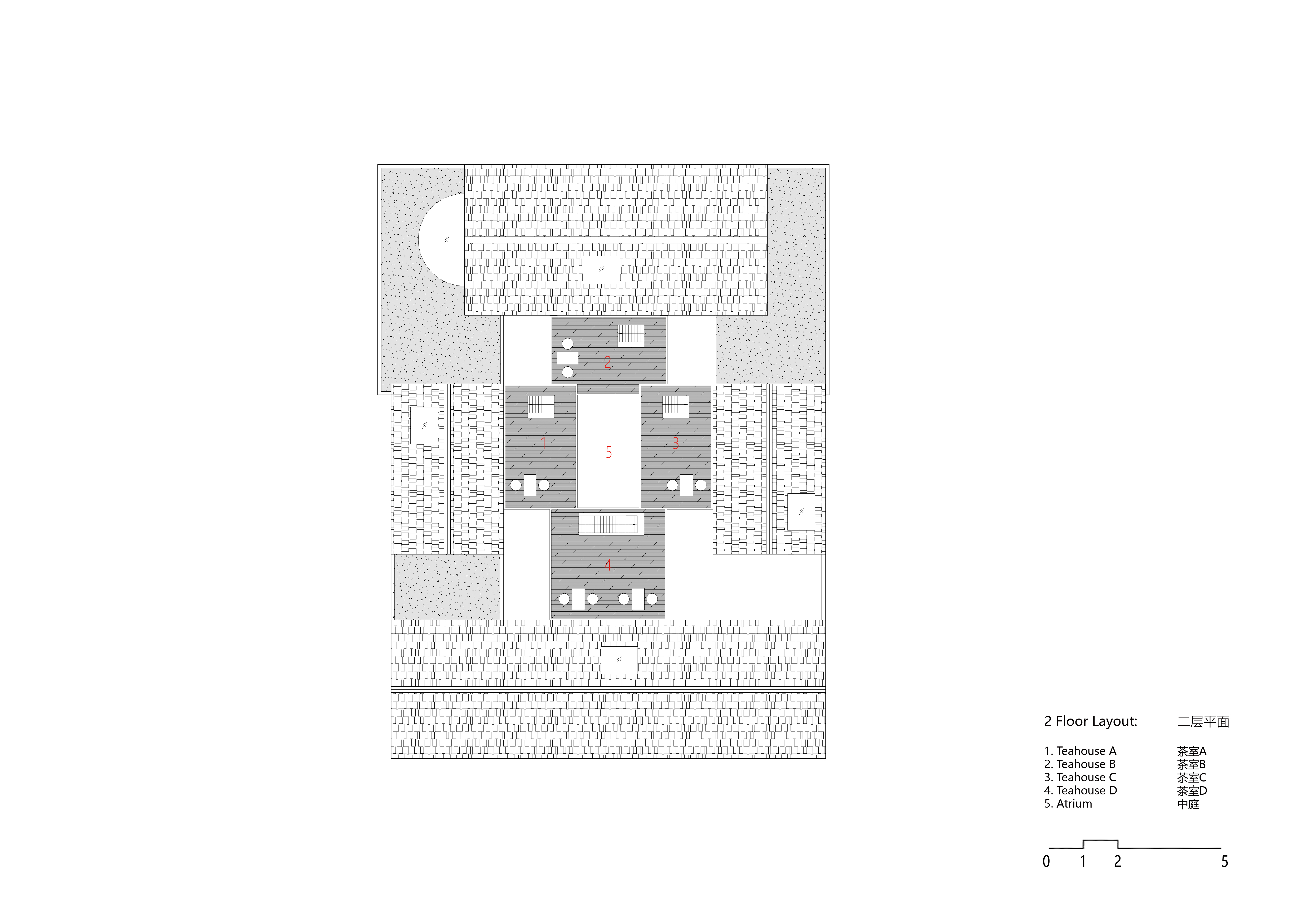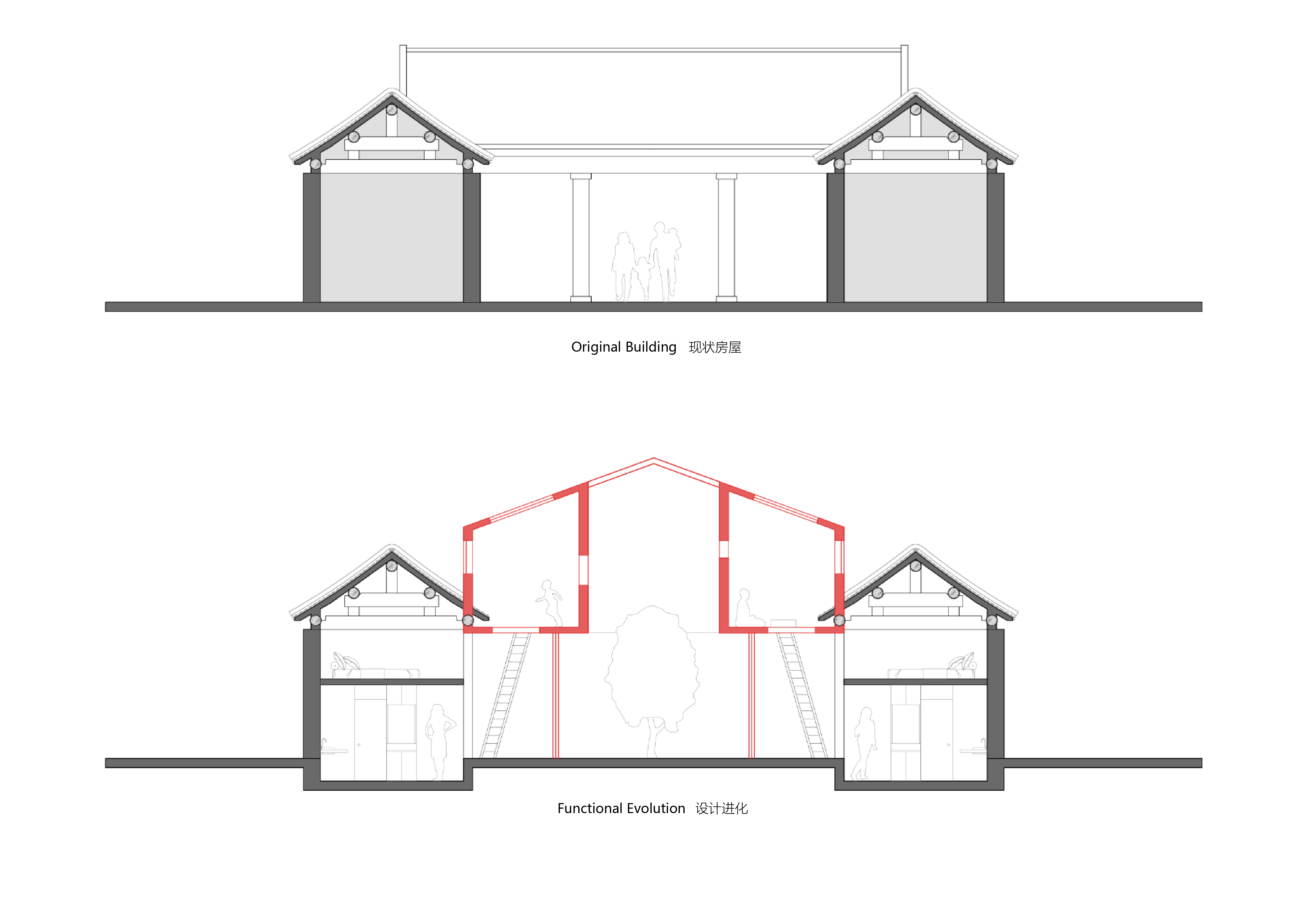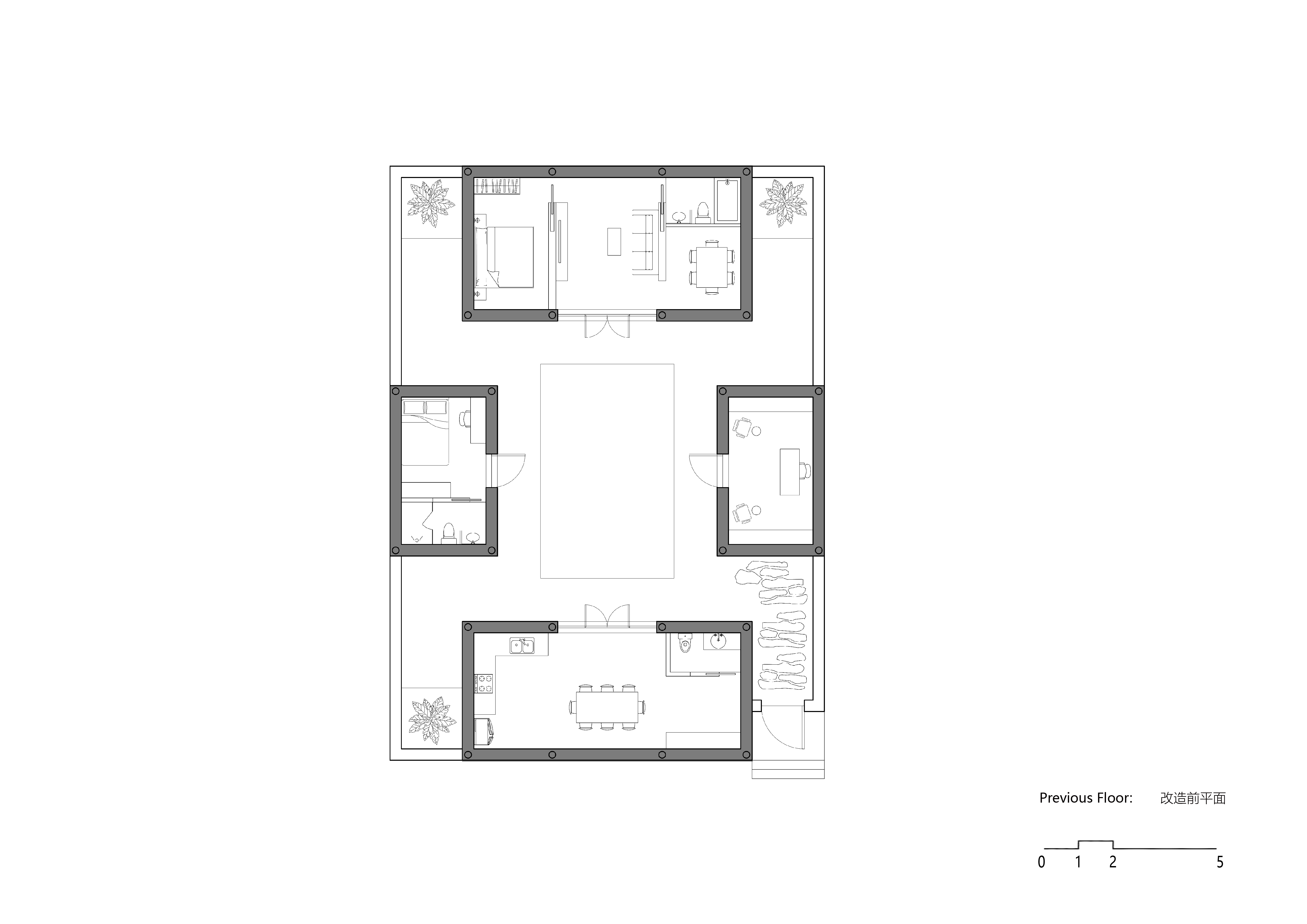空间布局:在相对局促的空间内把空间再次划分以满足不同功能需求,每个区域也不显得局促。 南北房和东西厢房同样沿用了传统四合院砖木混合四梁八柱的建筑结构形式,而新植入的空间区域则采用钢结构和混凝土等现代结构形式。在原房屋上改造的部分保留原始结构,新建的空间采用现代结构。
