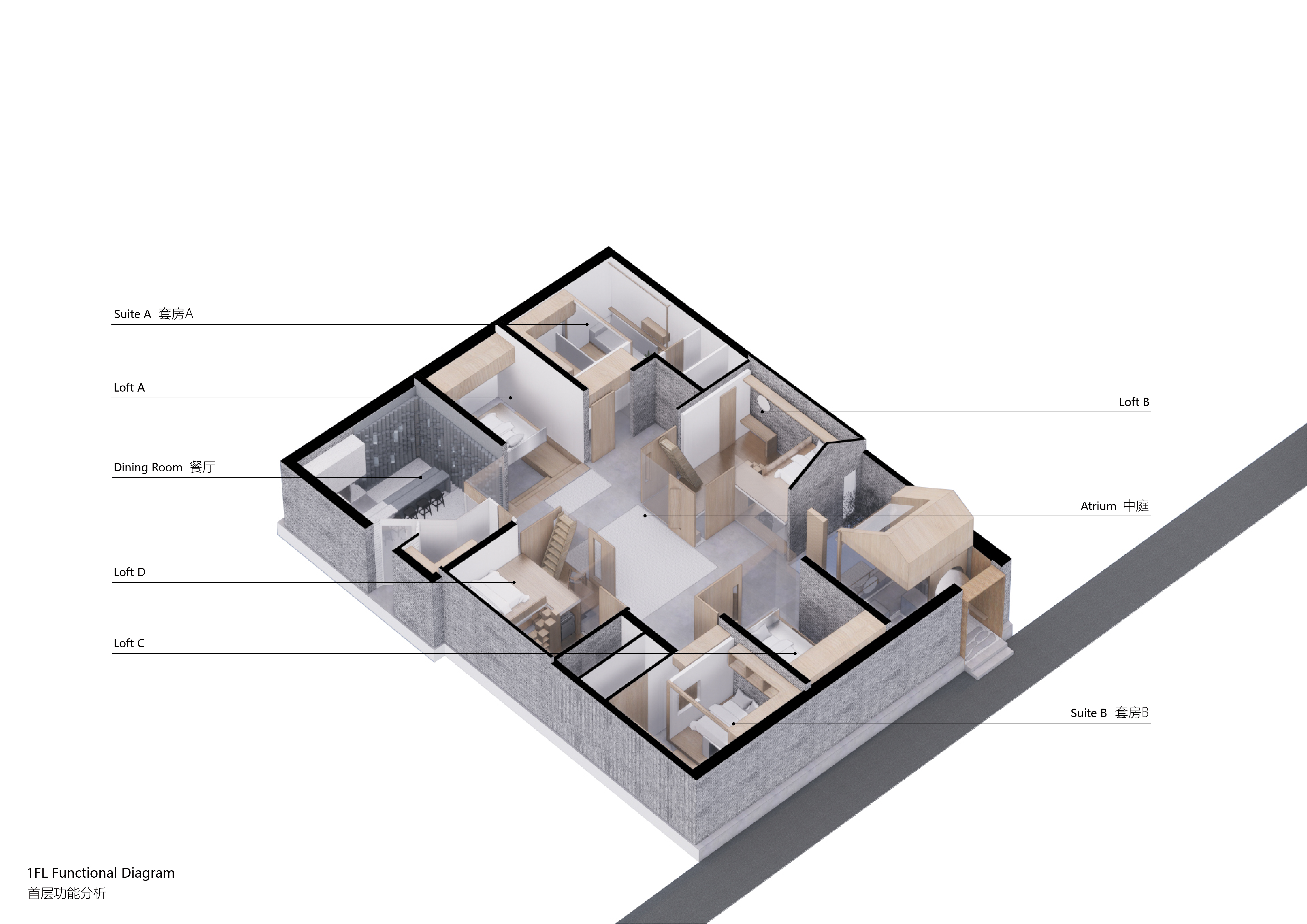 项目定位:北京的四合院是北京最典型的北方民居形式,经历了八百多年发展,最终形成了四合院严格的空间聚落。而这种严格的空间序列是古代家庭社会等级秩序反应,无论是从几进几跨的王府大院还是单进的寒门小户,正厢分明,中轴对称的布局和建筑的结构形式都已定制了非常明确严格的制式。 解放前后,四合院开始向杂院的方向演进,大府宅被拆成了单进院落,甚至在独院内东西厢房和南北房都住进了不同的人家,原来等级森严的阶梯式住宅逐渐变成了“社会性“住宅,没有了等级的结缔,同样生活在大杂院内的不同人家共享同样一个院子和一条胡同,这些公共空间确实拉近了居民的距离,但同样也剥夺了居民间的隐私,甚至很多基本的生活都不能保障。无论是供大家族生活的整进院落还是被割裂成小间的大杂院,北京的四合院都已然不符合当代居民的生活状态。就现代人而言,对于邻里关系的需求已经产生了变化。对于曾经大杂院中的居民,每个家庭的私密性比起公共社交属性更被大家需要。共享空间应避免造成被动式的社交造成住户负担。项目是业主和设计师一道对北京四合院新的居住模式的探讨。虽然项目面积不大,但业主希望项目仍然有能力同时承载自己和朋友们同时居住,甚至多余的房间还可以对外长期出租。 如同老友记那样的“群居”生活,需要公共的客厅空间,大家可以一起活动用餐,但又有自己的生活单元。