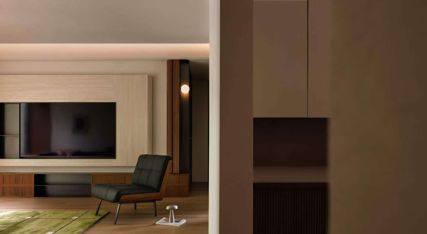 以半通透墙体划分空间层次,木饰面与软质家具柔化质感,线性灯光勾勒轮廓,让客厅在分隔中保持视觉的连贯与通透。
