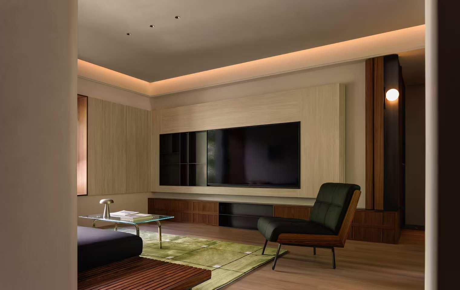 空间意境:首先是把自然绿意和室内空间焊死了——大落地窗直接框住窗外的绿树,不搞花哨的隔断,让室外的自然景色变成室内的“活背景”。其次是材质混搭玩出了新花样,暖调木饰面配冷感玻璃、金属,再铺块肌理感的绿色地毯,硬软材质撞在一起不违和,反而衬得空间又温柔又有质感。还有灯光和软装的巧思,摒弃了刺眼的主灯,用柔和的氛围灯和艺术灯具营造层次感,小摆件和抱枕选得也特别搭,把轻奢和自然揉得恰到好处,打破了传统轻奢风的冰冷感,让空间有了烟火气。