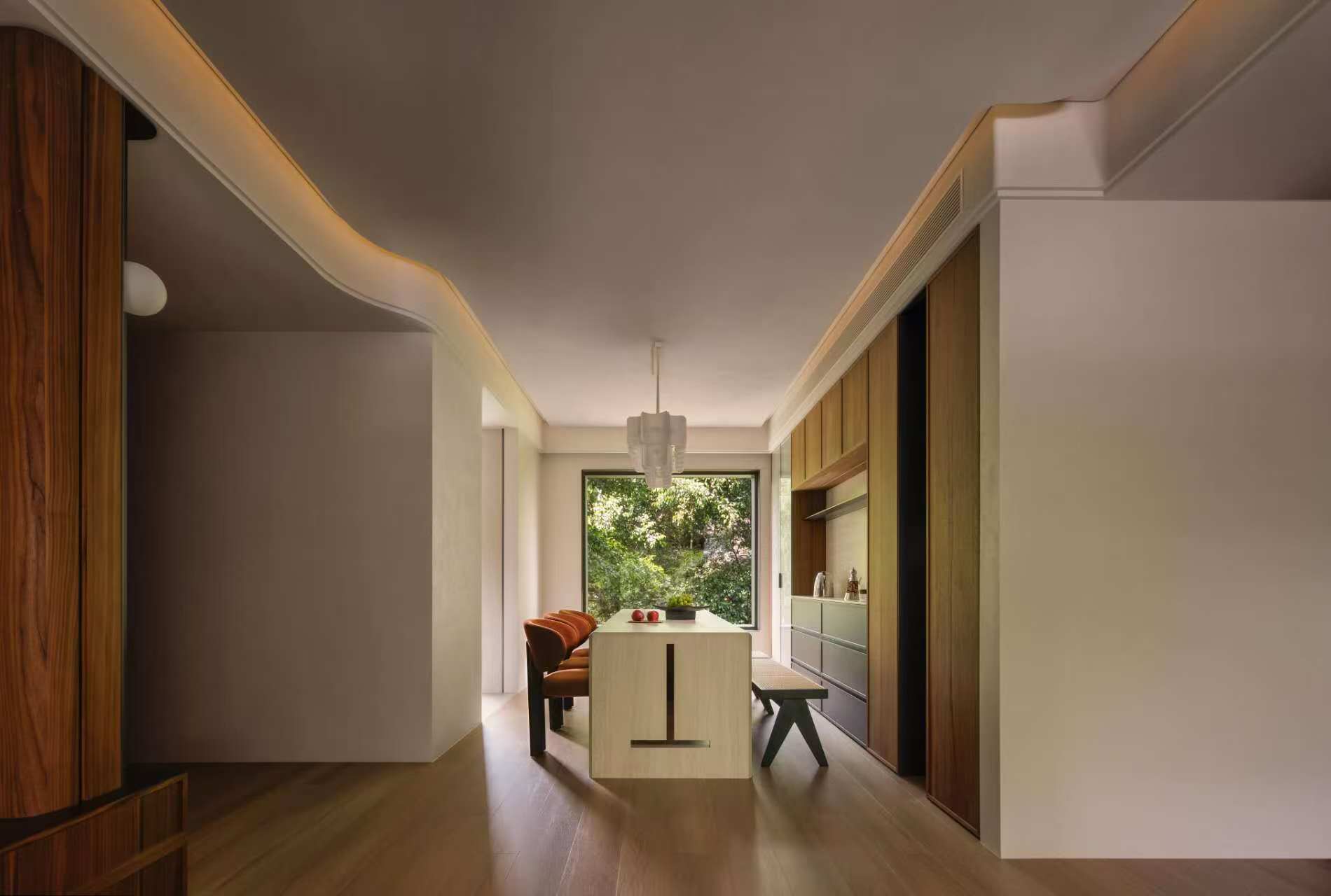 以线性灯光勾勒廊道韵律,木饰面与简约柜体造秩序感,端景窗引绿意入内,让过道成为串联空间的诗意过渡带。