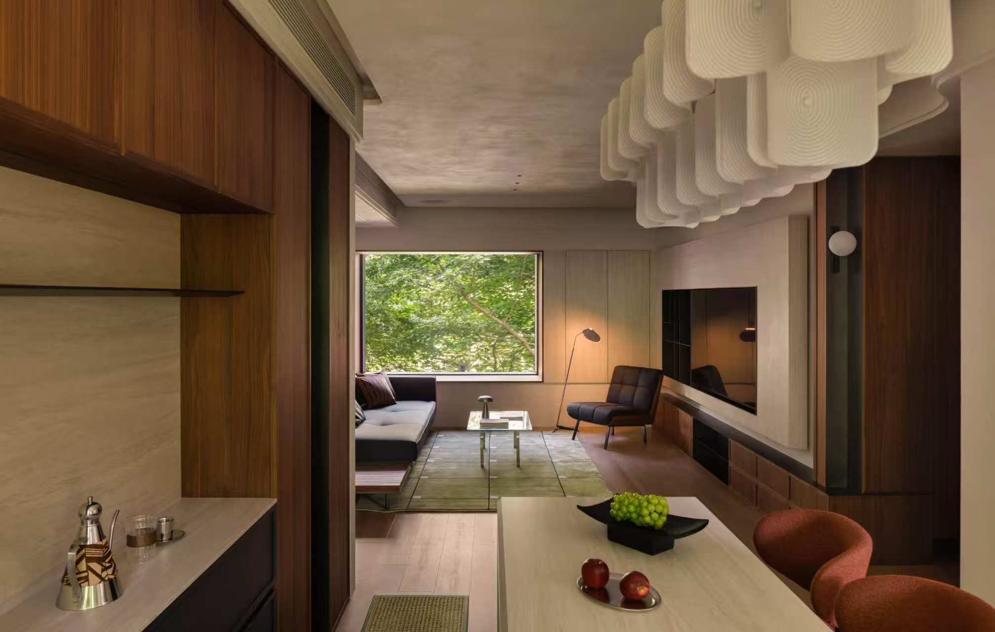 以窗为框引自然绿意入内,木质肌理与软质家具平衡质感,分层灯光营造静谧氛围,打造藏于都市的自然栖居空间。