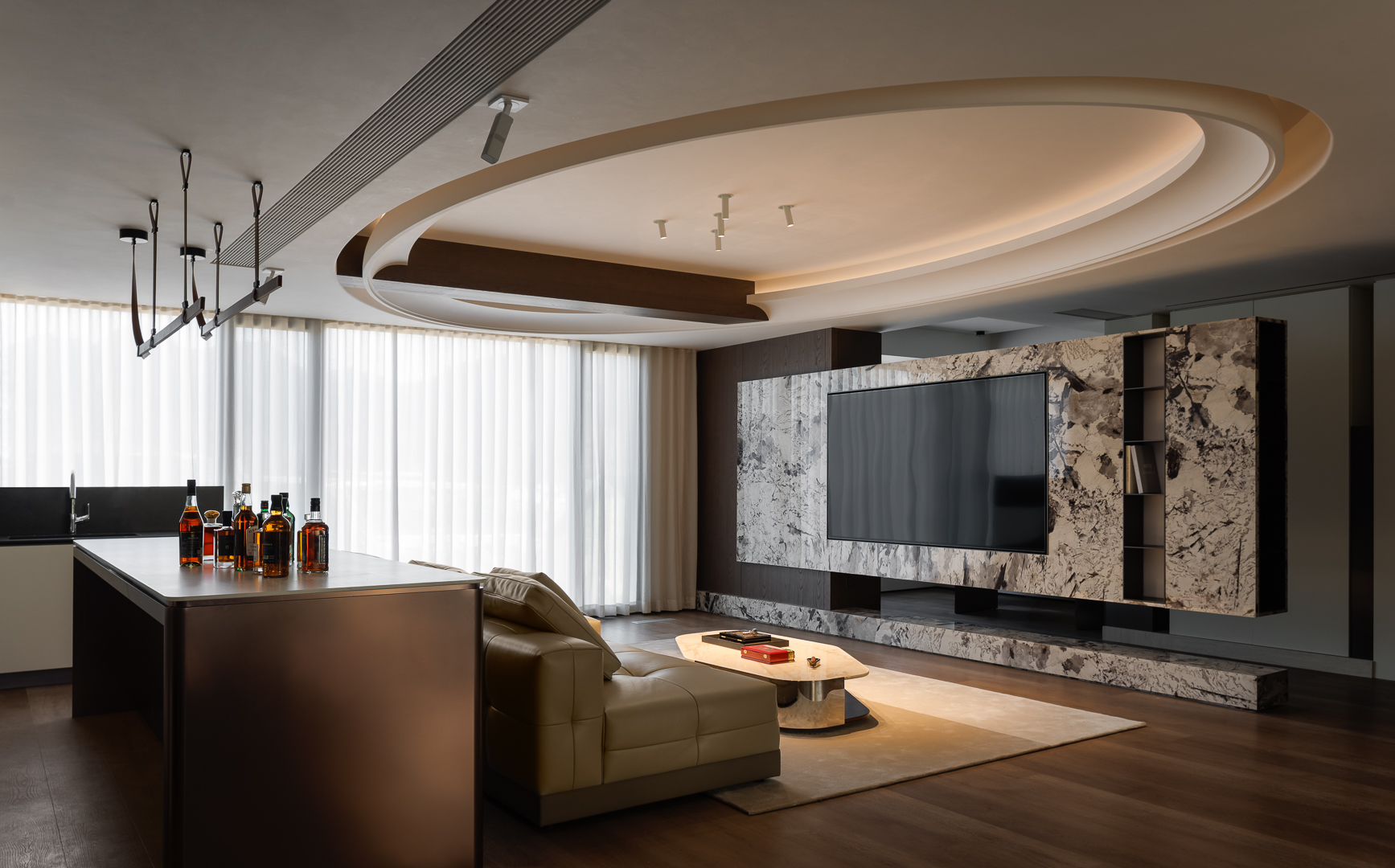 以环形悬浮吊顶打造视觉焦点,大理石背景墙糅合金属质感,吧台与客厅相融,勾勒出轻奢且具互动性的现代起居空间。