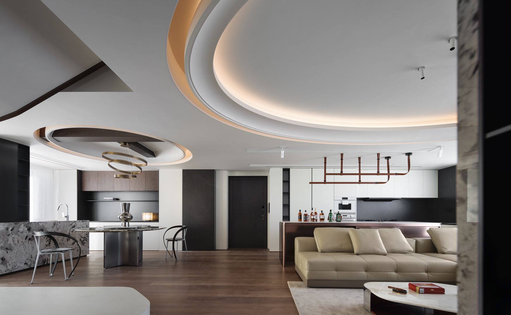 以多层环形吊顶构建空间韵律,餐厨客无界相融,金属线条与柔质家具碰撞,打造轻奢且具流动感的现代居住核心区。
