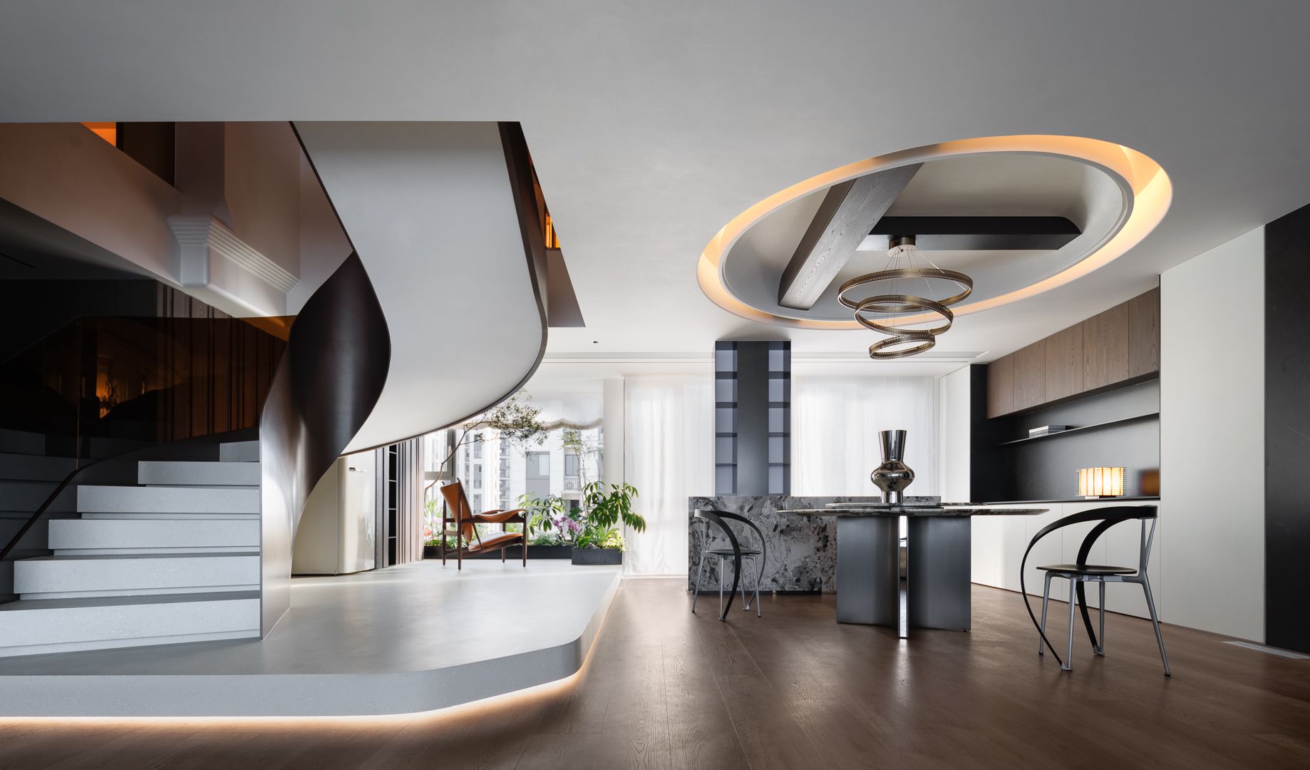 以环形叠级吊顶塑空间层次感,旋梯与餐厨区相融消弭边界,柔质皮质沙发中和冷硬材质,打造轻奢通透的现代起居场域。