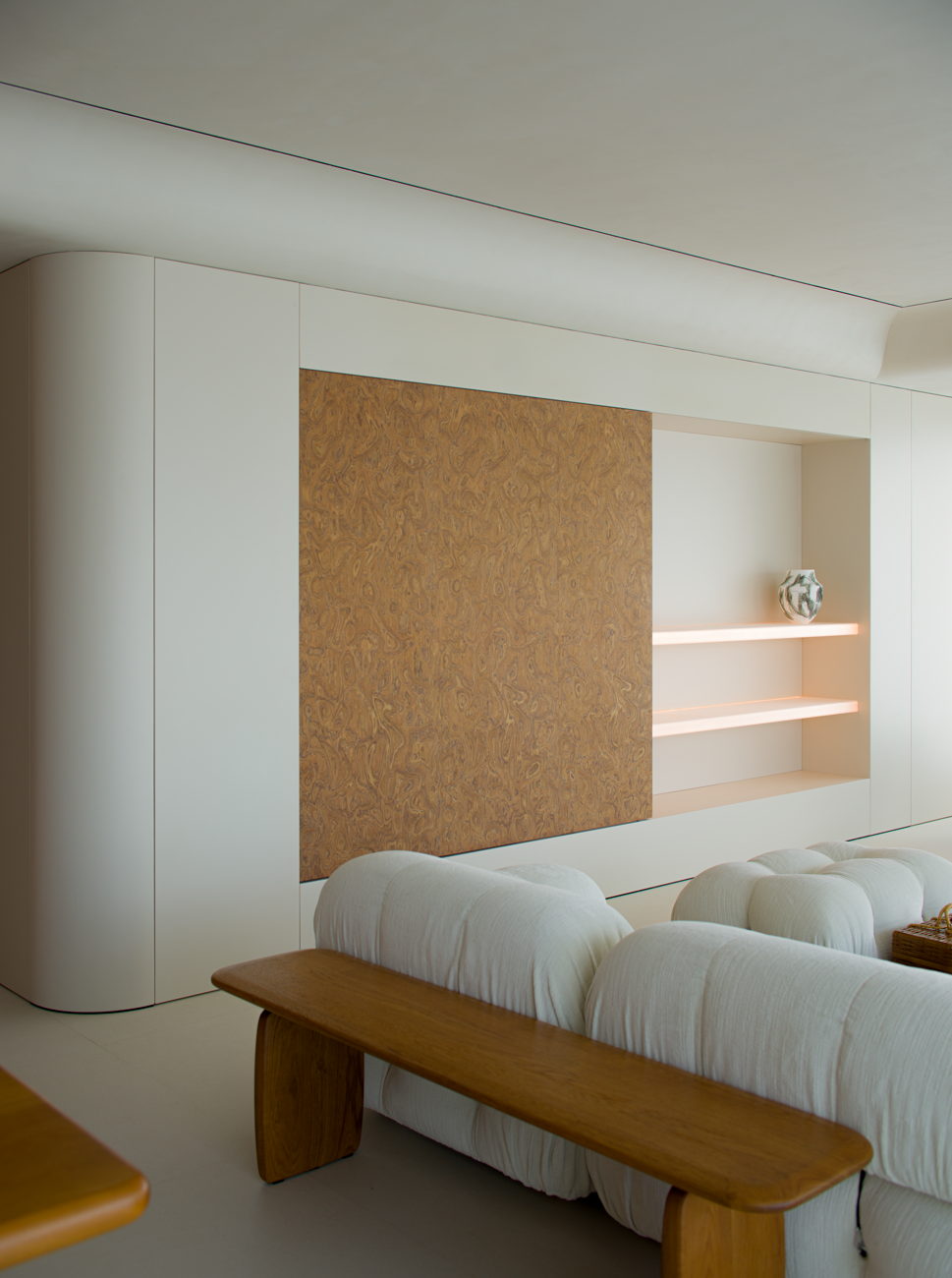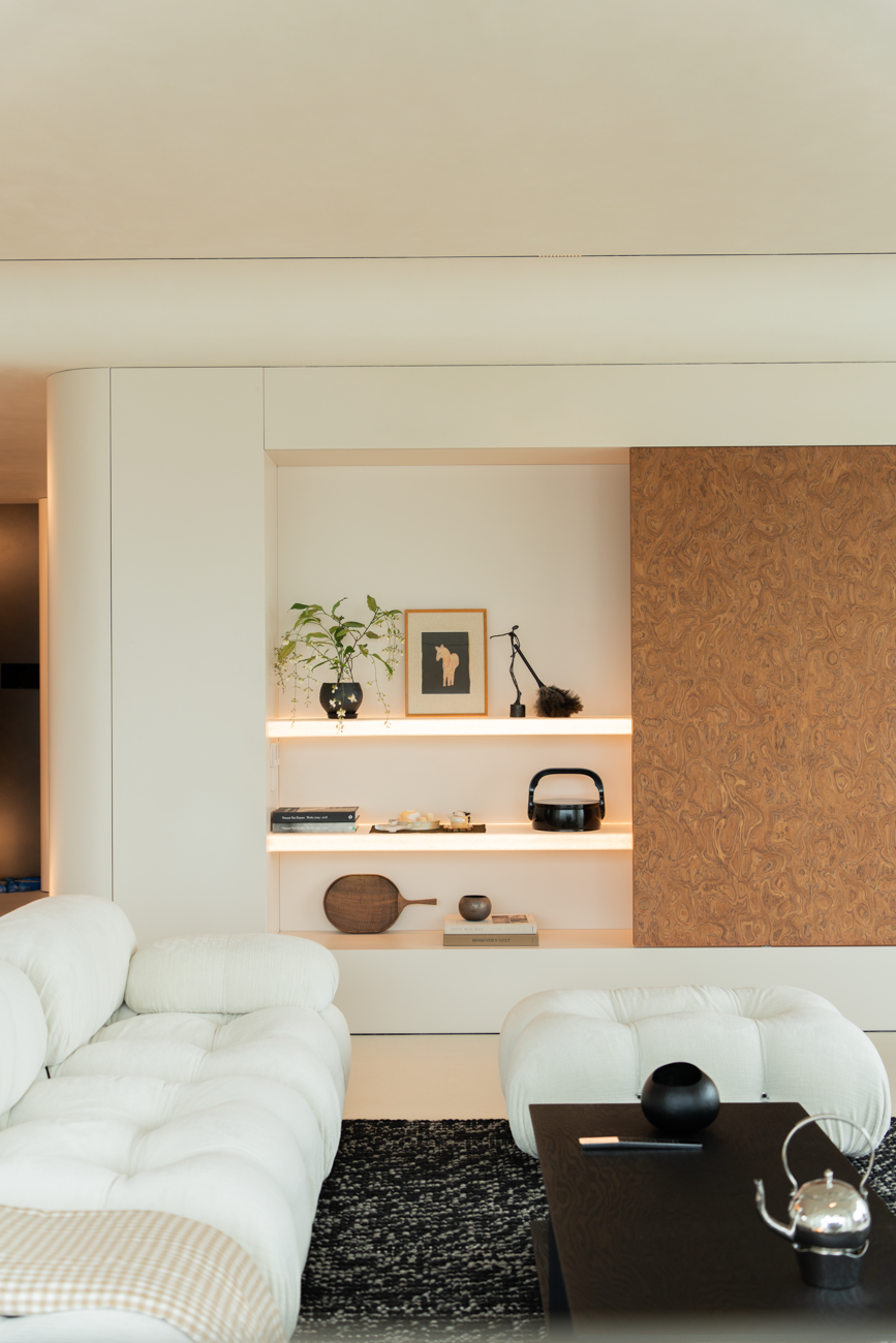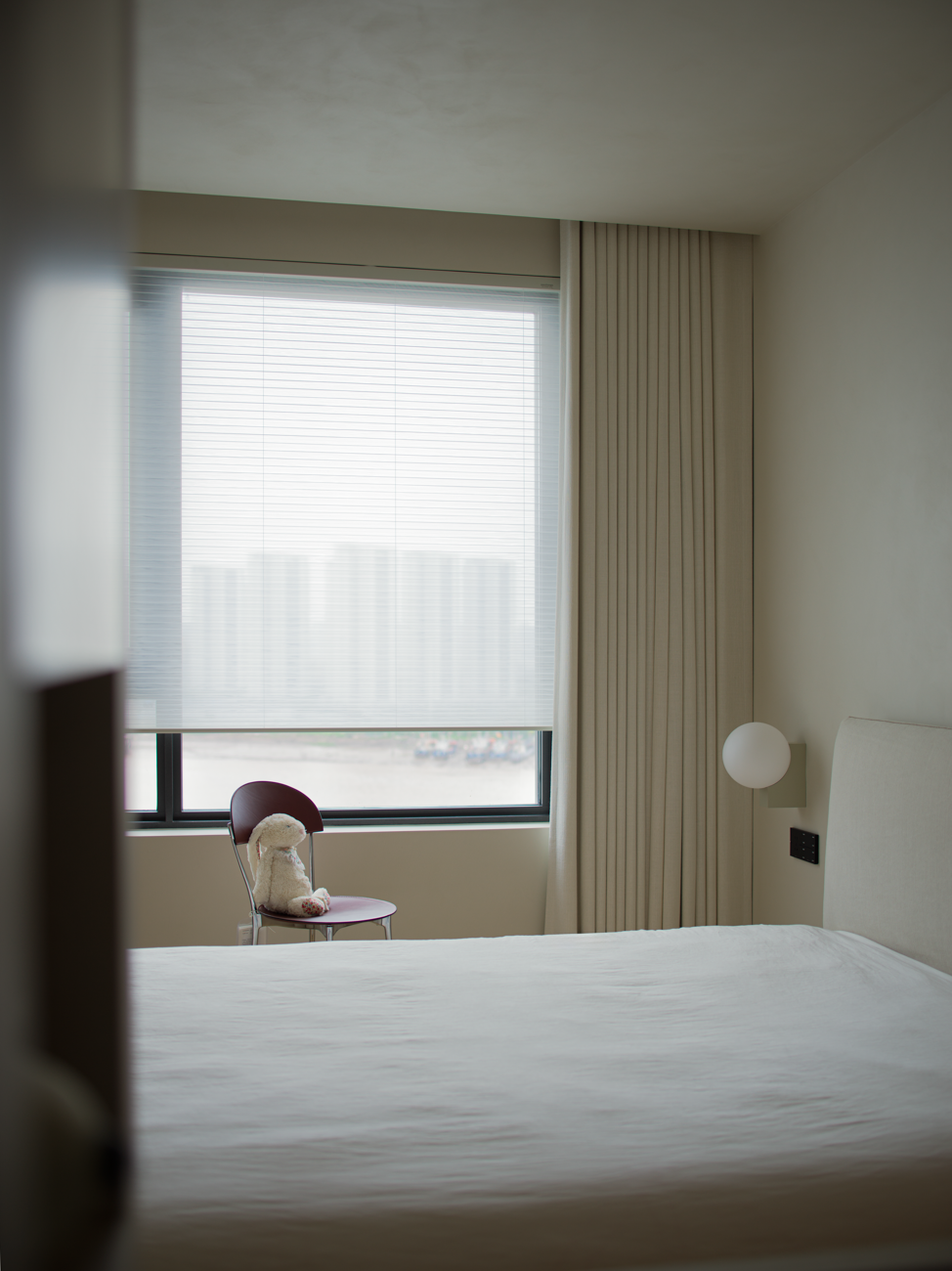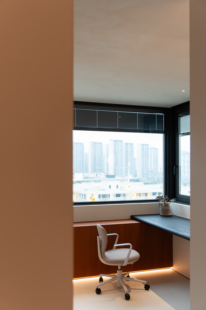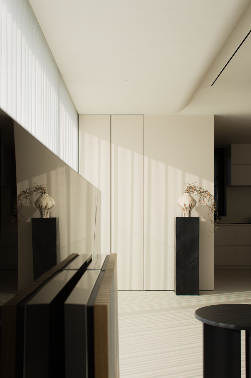 空间意境:当江风穿堂而过,日月光影在地面游移,空间便成为了链接内心世界与外在自然的媒介。大面落地窗将江景徐徐引入,却不刻意强调存在。设计克制地使用极简的笔法勾勒空间轮廓,让白墙与原木成为自然的画框。这种留白,实则是为心灵腾出关照自然的空间,在江景永恒的流动中,感受生活最本质的美好。呼应这种韵律感,弧形元素如同倾泻的水流由天花板向下延伸,通过墙面的转角,到弧形的餐桌与玄关柜,最后汇聚成云朵造型的沙发。这种流动感与窗外的江水产生神奇的共鸣,形成内外一致的呼吸节奏。针对入户直对窗景的视线穿透问题,设计师以一道悬浮式多功能柜体作为过渡媒介。这组柜体既化解了视线的一览无余,又巧妙融入入户收纳与餐厅酒水吧的双重功能,特别在柜体上下嵌入定制的亚克力导光板,模拟自然阳光映射入室的画面,在虚实间构筑起轻盈的悬浮感与温暖感。空间摒弃了为迎合儿童喜好而使用鲜艳色彩的常规做法,始终坚持白与原木的基础色调。这种色彩策略赋予空间持久的包容性,既能承载当下的生活,也可通过软装的变化适应未来的需求,让空间真正成为随时间生长的背景。以可移动的木窗巧妙解决采光与通风难题,是面对空间较深的次卧做出的回应。木窗在平时打开,让光线深入卫生间区域,同时产生开阔感;需要时关闭,保障使用隐私。