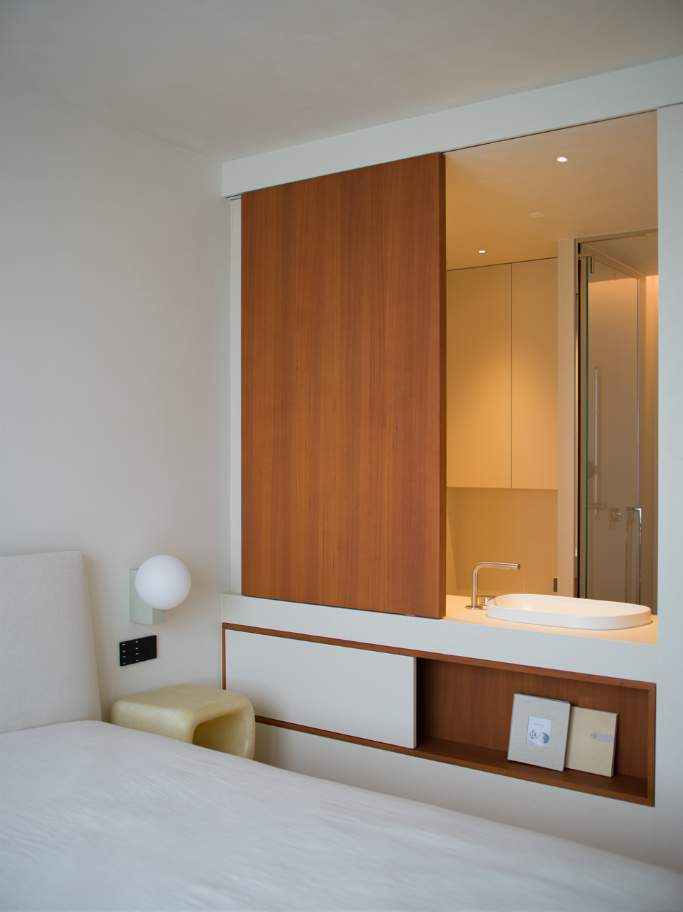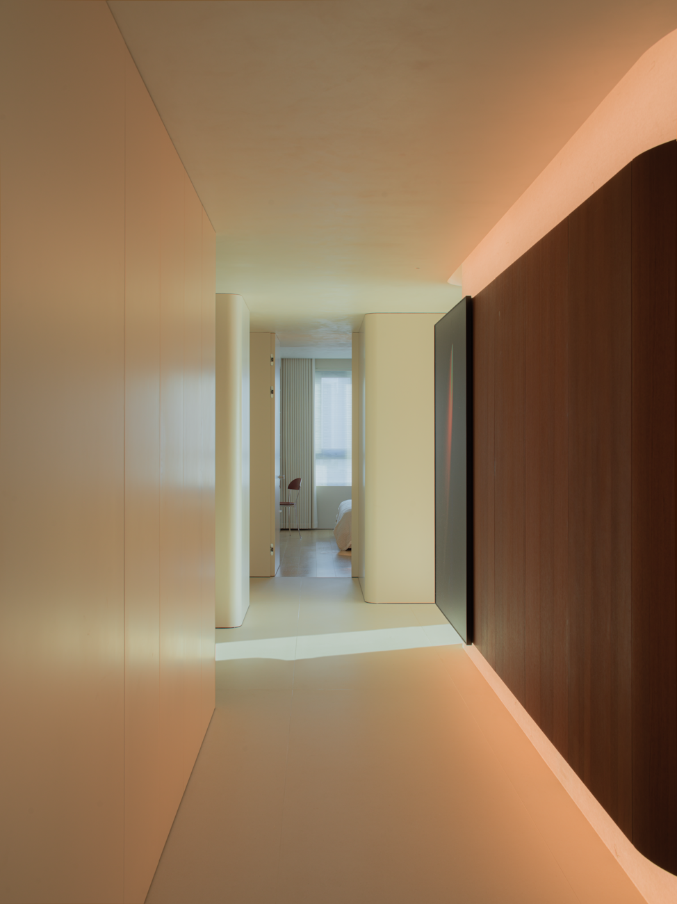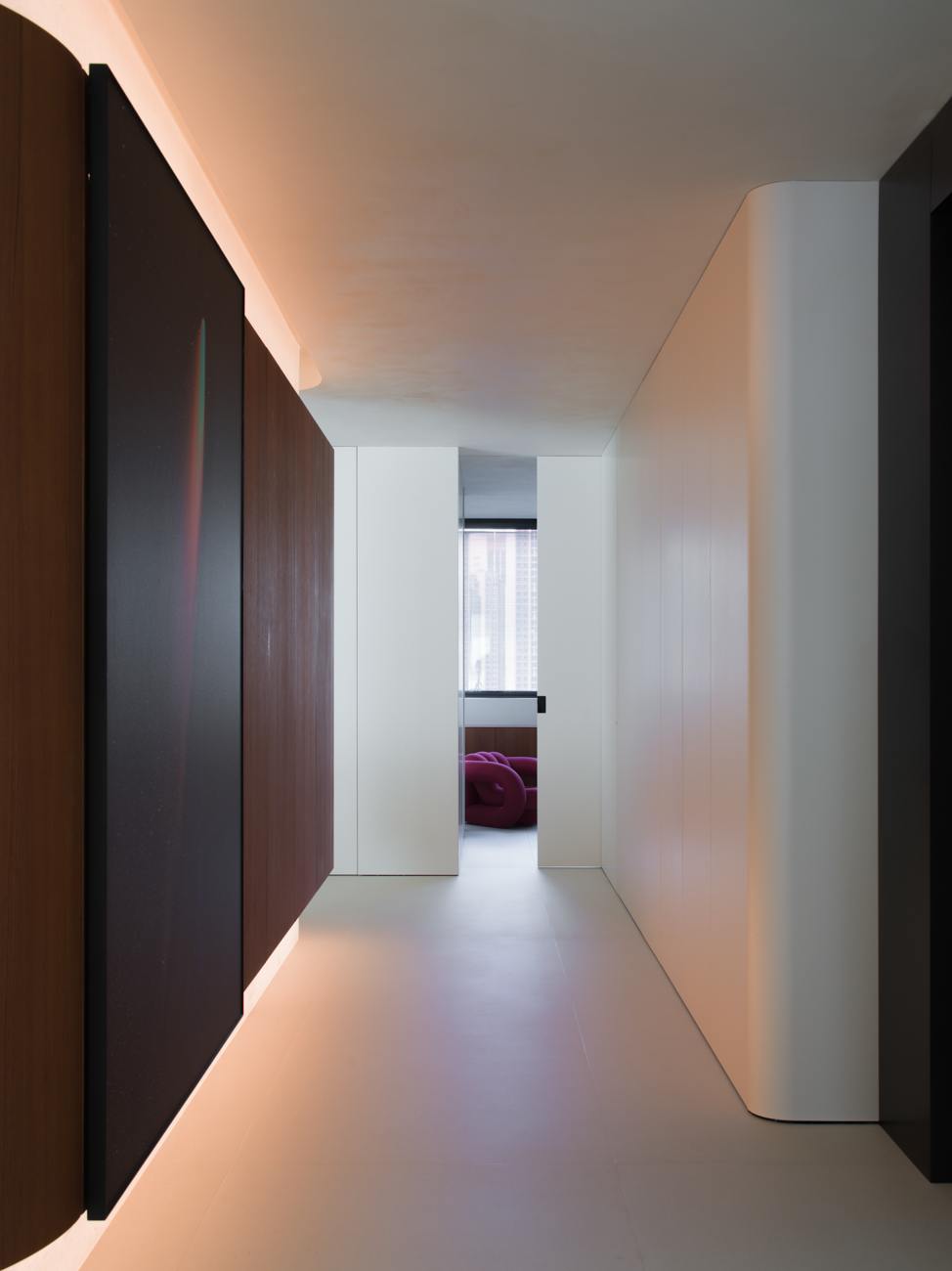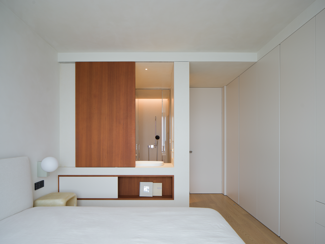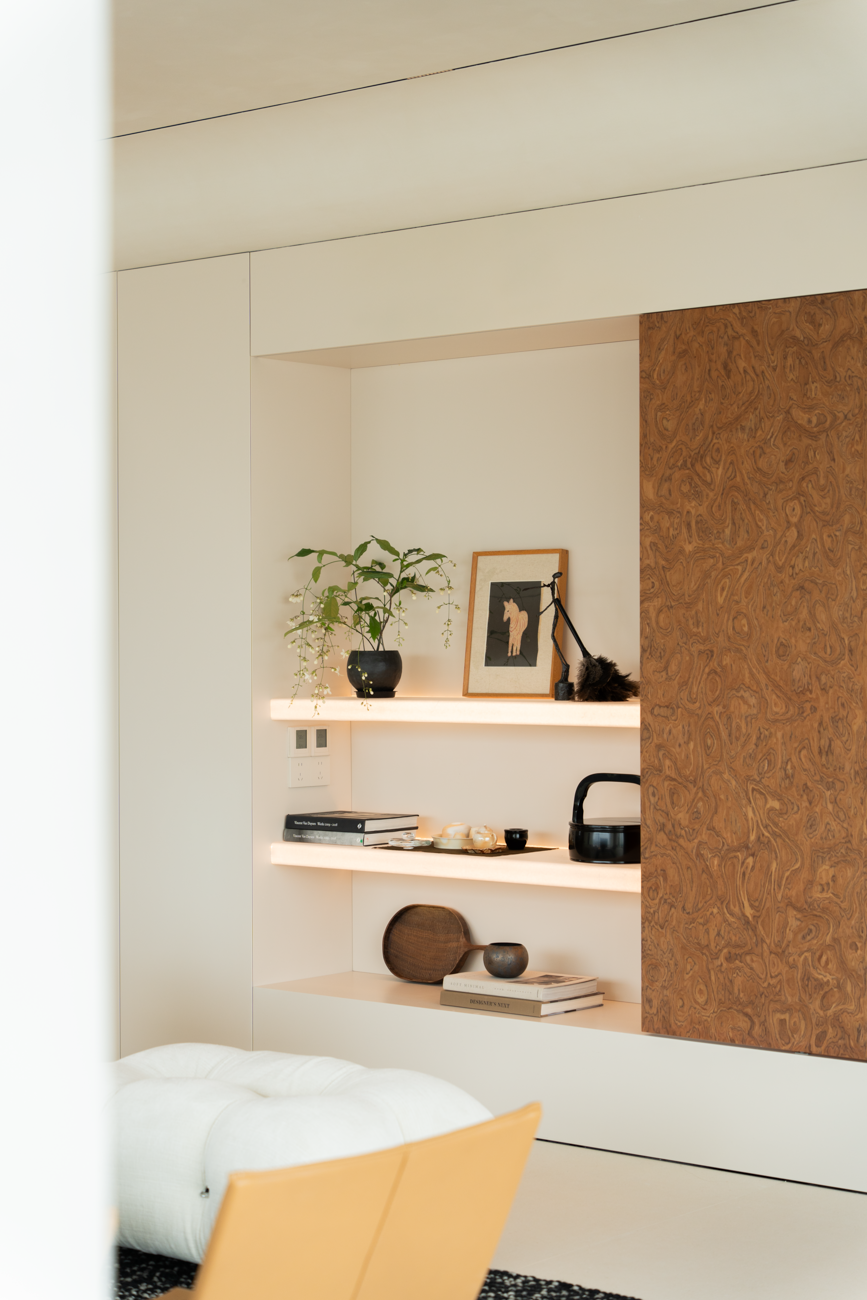 空间意境:当江风穿堂而过,日月光影在地面游移,空间便成为了链接内心世界与外在自然的媒介。大面落地窗将江景徐徐引入,却不刻意强调存在。设计克制地使用极简的笔法勾勒空间轮廓,让白墙与原木成为自然的画框。这种留白,实则是为心灵腾出关照自然的空间,在江景永恒的流动中,感受生活最本质的美好。呼应这种韵律感,弧形元素如同倾泻的水流由天花板向下延伸,通过墙面的转角,到弧形的餐桌与玄关柜,最后汇聚成云朵造型的沙发。这种流动感与窗外的江水产生神奇的共鸣,形成内外一致的呼吸节奏。针对入户直对窗景的视线穿透问题,设计师以一道悬浮式多功能柜体作为过渡媒介。这组柜体既化解了视线的一览无余,又巧妙融入入户收纳与餐厅酒水吧的双重功能,特别在柜体上下嵌入定制的亚克力导光板,模拟自然阳光映射入室的画面,在虚实间构筑起轻盈的悬浮感与温暖感。空间摒弃了为迎合儿童喜好而使用鲜艳色彩的常规做法,始终坚持白与原木的基础色调。这种色彩策略赋予空间持久的包容性,既能承载当下的生活,也可通过软装的变化适应未来的需求,让空间真正成为随时间生长的背景。以可移动的木窗巧妙解决采光与通风难题,是面对空间较深的次卧做出的回应。木窗在平时打开,让光线深入卫生间区域,同时产生开阔感;需要时关闭,保障使用隐私。