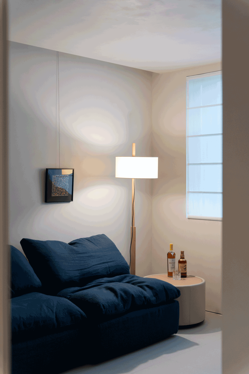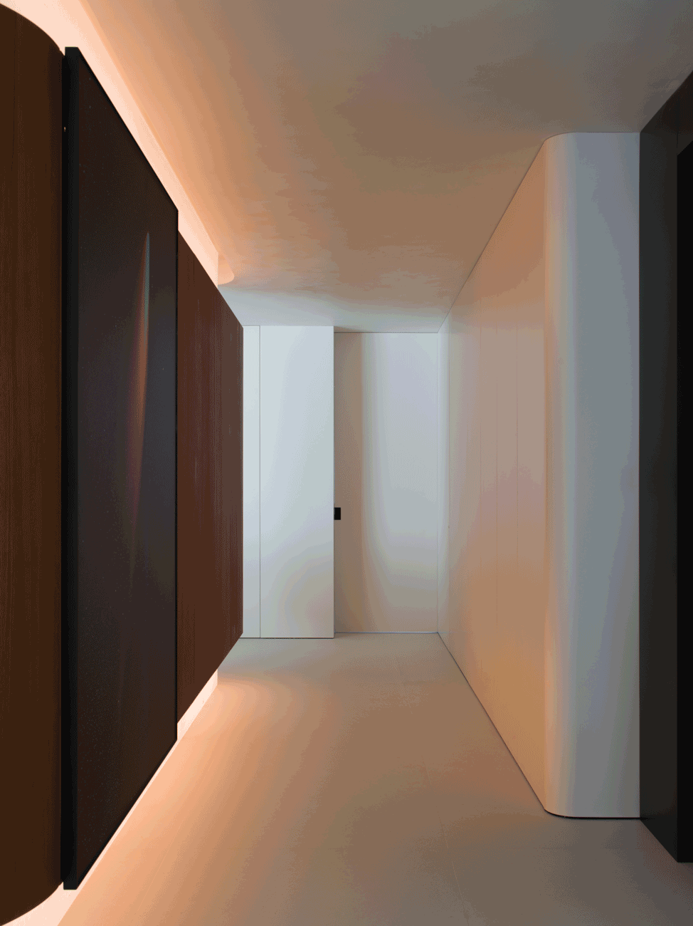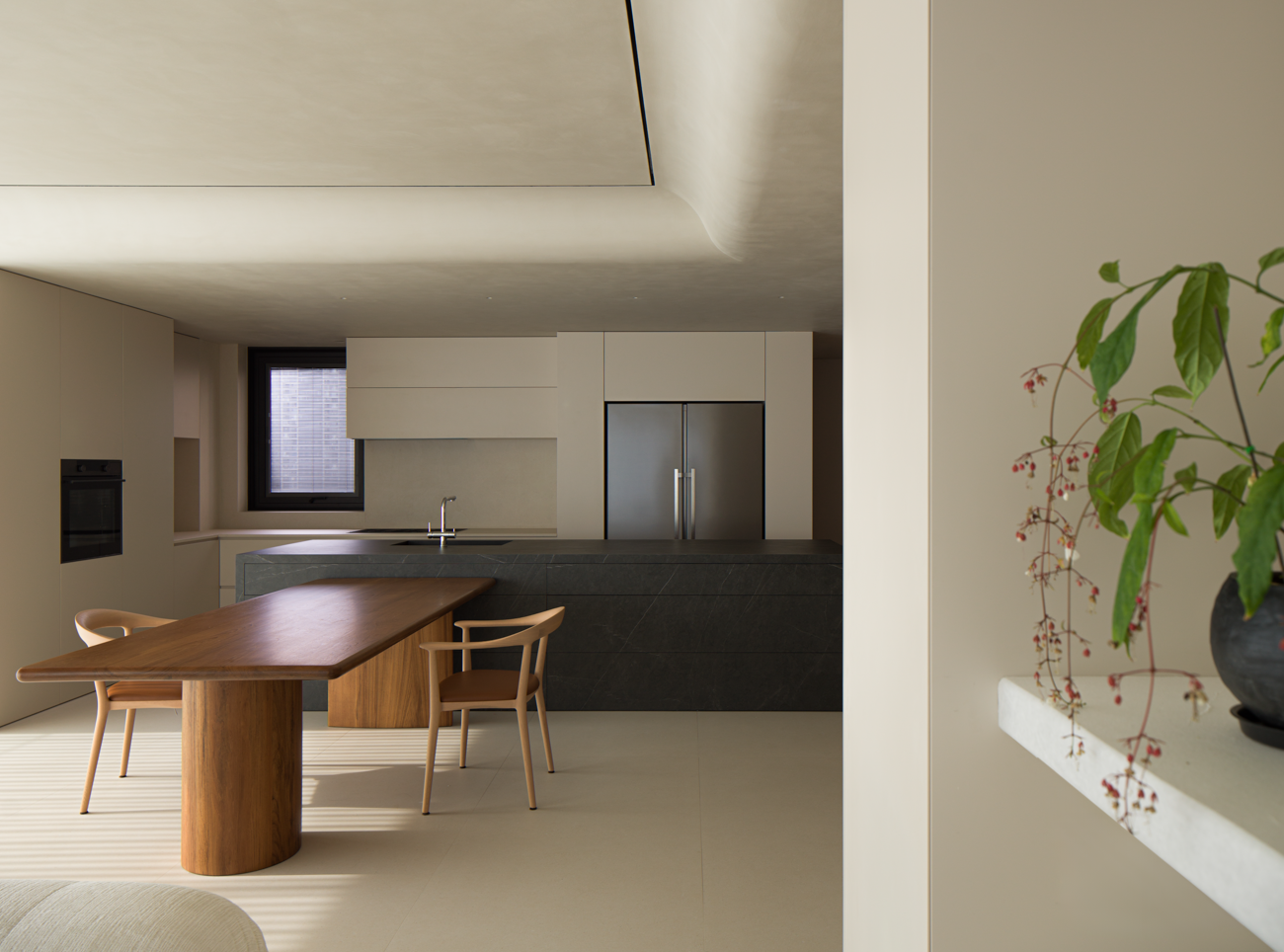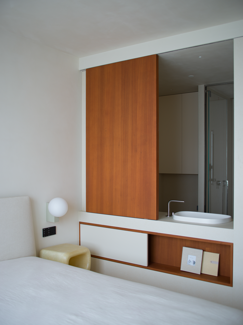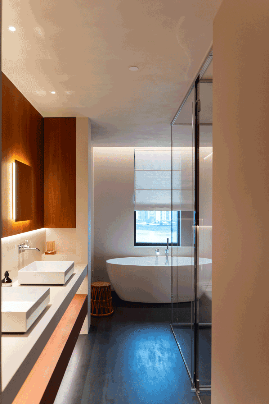 空间意境:当江风穿堂而过,日月光影在地面游移,空间便成为了链接内心世界与外在自然的媒介。大面落地窗将江景徐徐引入,却不刻意强调存在。设计克制地使用极简的笔法勾勒空间轮廓,让白墙与原木成为自然的画框。这种留白,实则是为心灵腾出关照自然的空间,在江景永恒的流动中,感受生活最本质的美好。呼应这种韵律感,弧形元素如同倾泻的水流由天花板向下延伸,通过墙面的转角,到弧形的餐桌与玄关柜,最后汇聚成云朵造型的沙发。这种流动感与窗外的江水产生神奇的共鸣,形成内外一致的呼吸节奏。针对入户直对窗景的视线穿透问题,设计师以一道悬浮式多功能柜体作为过渡媒介。这组柜体既化解了视线的一览无余,又巧妙融入入户收纳与餐厅酒水吧的双重功能,特别在柜体上下嵌入定制的亚克力导光板,模拟自然阳光映射入室的画面,在虚实间构筑起轻盈的悬浮感与温暖感。空间摒弃了为迎合儿童喜好而使用鲜艳色彩的常规做法,始终坚持白与原木的基础色调。这种色彩策略赋予空间持久的包容性,既能承载当下的生活,也可通过软装的变化适应未来的需求,让空间真正成为随时间生长的背景。以可移动的木窗巧妙解决采光与通风难题,是面对空间较深的次卧做出的回应。木窗在平时打开,让光线深入卫生间区域,同时产生开阔感;需要时关闭,保障使用隐私。