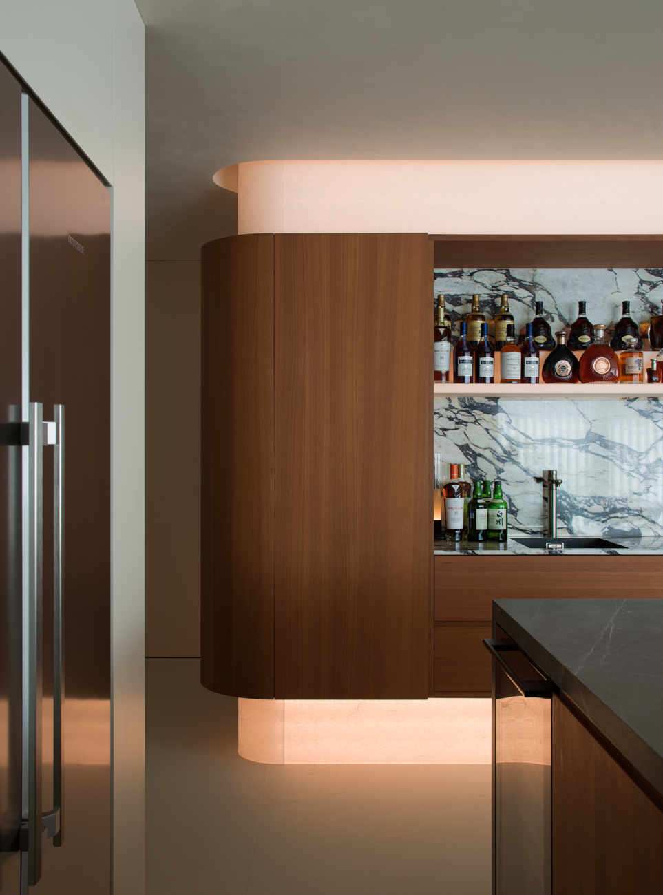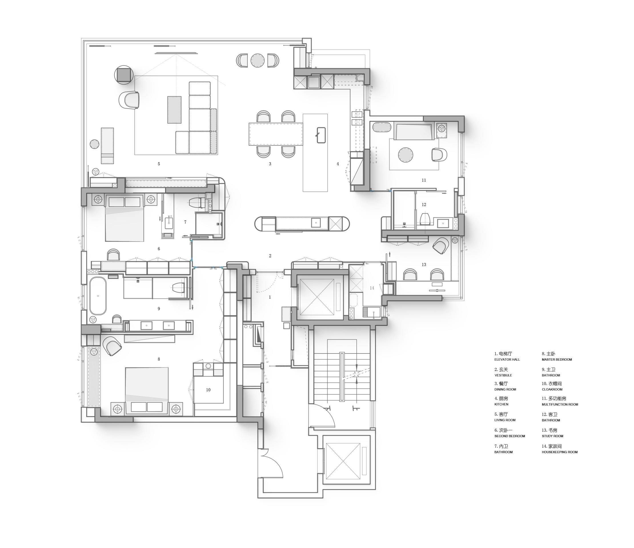 空间布局:在并入L型阳台后,面对原始结构中显著的梁高落差带来的视觉割裂感,设计通过弧形的天花过渡予以视觉弥合,巧妙地将生硬的梁柱结构转化为流动的韵律感。遵循动线流畅、互不干扰的布局原则,明确划分公共与私密区域。公区以江景视野作为中心,保持敞开式的交互关系,给予家庭成员最大程度的自由交际;而私密区域则保持着相对独立,保证场景明度的同时容纳个人的需求。