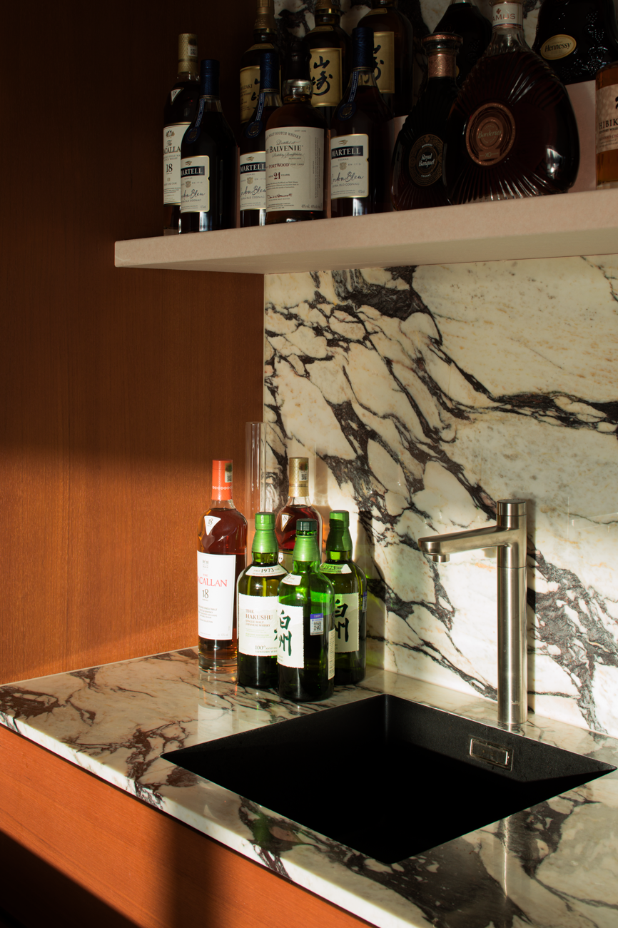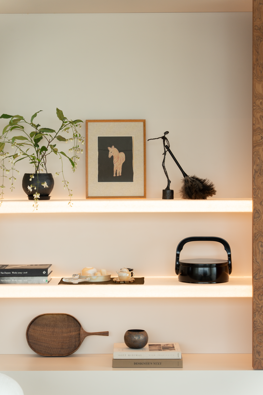 设计选材:木饰面、岩板、艺术漆通过软装的变化适应未来的需求,让空间真正成为随时间生长的背景