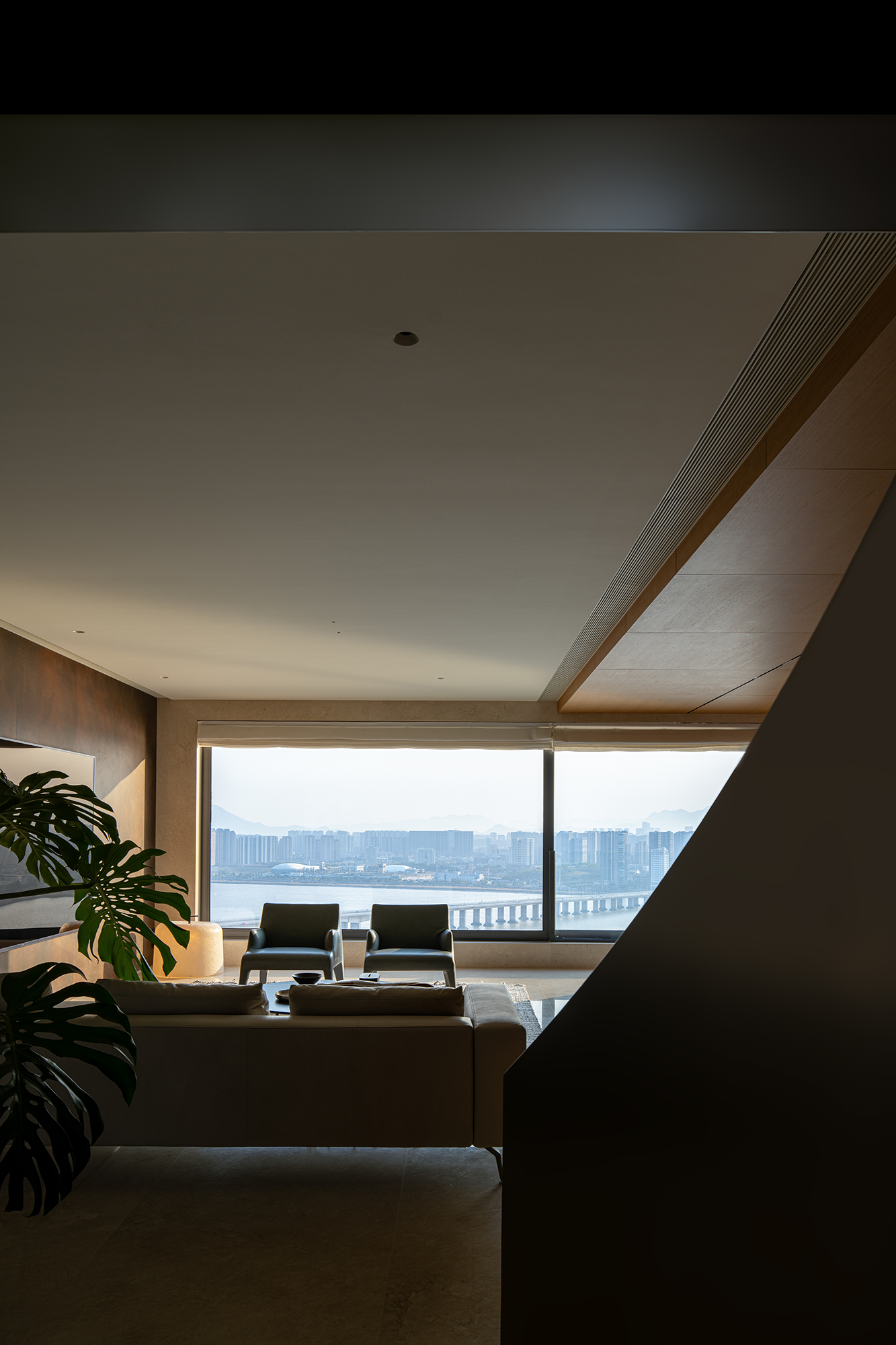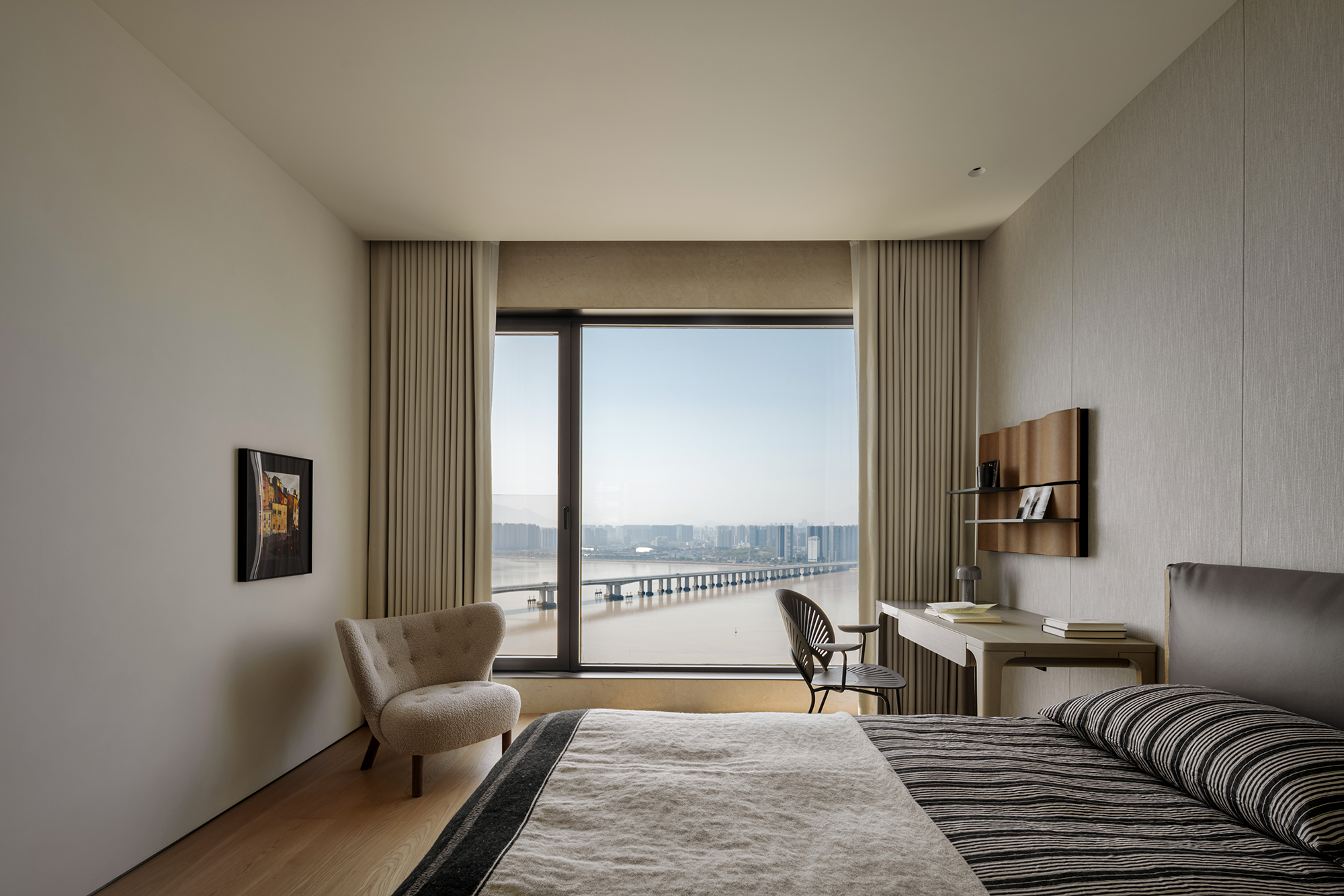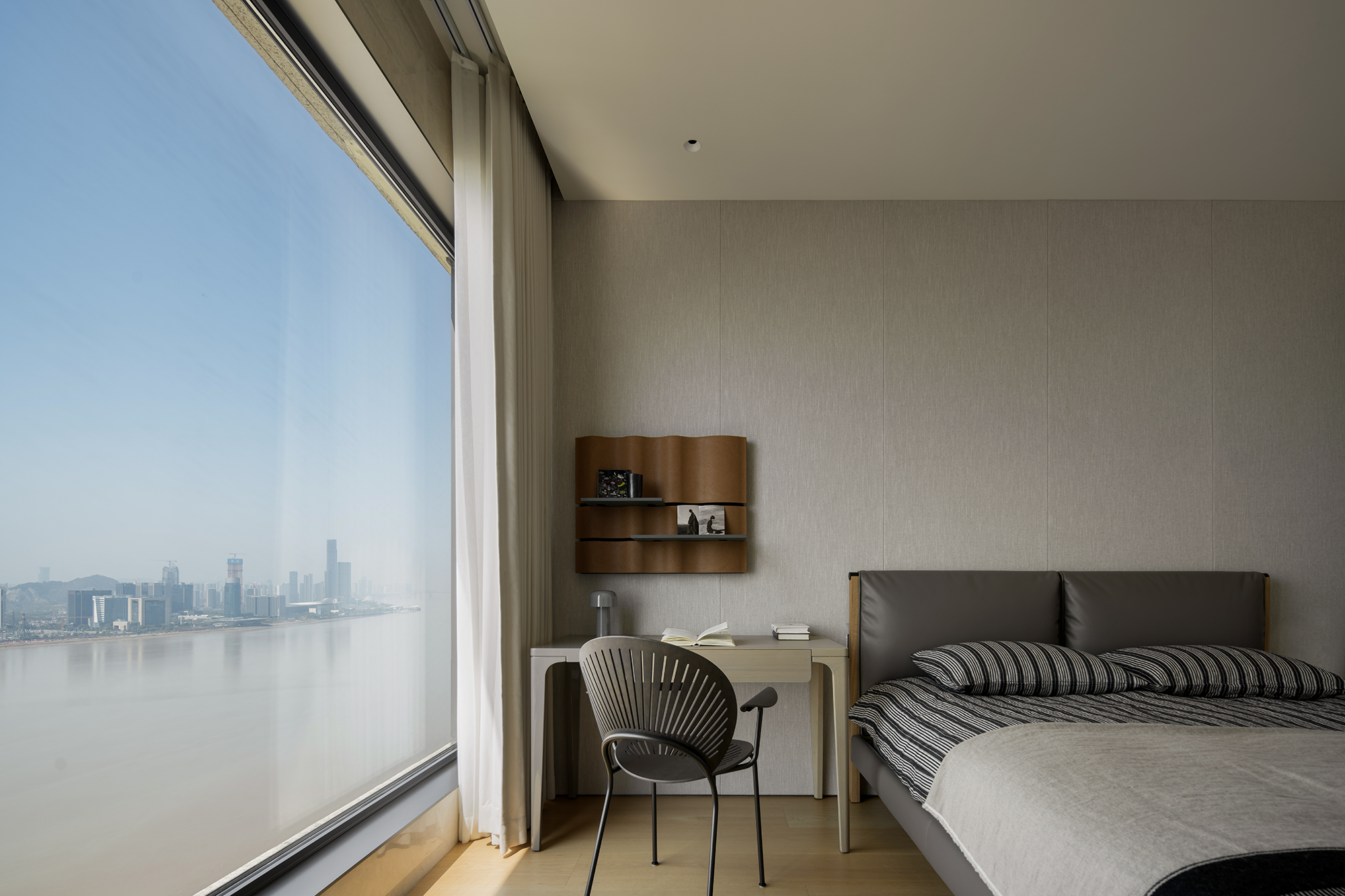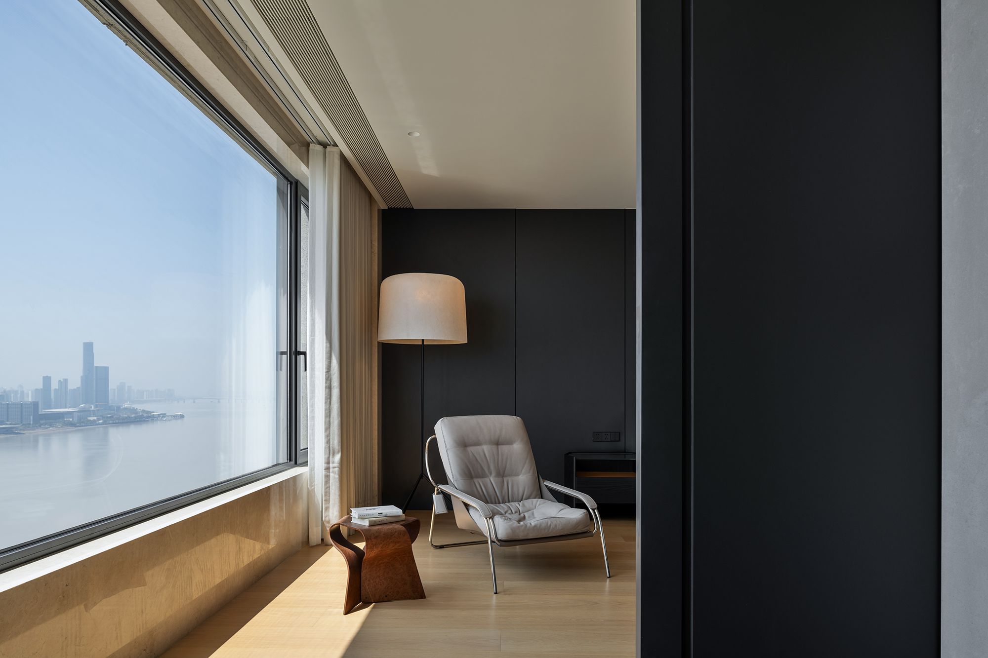 空间意境:流动的江水映入内部构造,动静协同,进一步顺延了环境与现代栖居的脉络关系。橡木与金属板建构理性关系,木饰面作为清晰的介质,从立面循序铺展至顶面,界定分区范围,暗示隐藏的动线。空间在横向界面上尽可能采取极大幅度的自由,组织流畅的块面关系和生活动线,依循江景衍生出流动且开阔的布局。沙发摆放以景色为参考主线,配合大面积极窄窗,制造界限的模糊,增强人与环境的觉察力,同时也造就了这个可生长的有机空间。无论是自由的立面,还是空间的秩序,都保持着局部与整体的克制与平衡。餐厅位于北面,充足的采光聚合了一处独立场域,通过空间材质结构的承转,使得功能空间似个别存在的,游离穿梭互不影响。二层起居室延续了公共区的主旨,作为家庭成员私密且共享的空间,牵引人与人慢慢靠近、亲密,同时确保每个空间都能与江景素面相迎。雅黑饰面构成主卧整体框架,适度削弱了光线的反射,使光感不过分明亮,创造出清静淡然的氛围。无过多繁杂修饰,着重考量环境本身的存在感,留存自然的温度。低纯度的肌理描摹着空间骨架,灰色作底,回归理性的叙事方式。房间入门正对窗景,每一次开门都能深受广阔江景的感官回馈,释放无限的空间感与自由度。