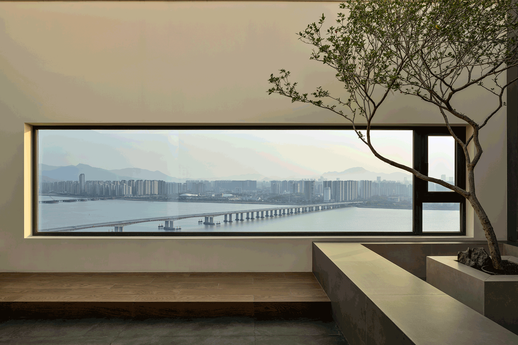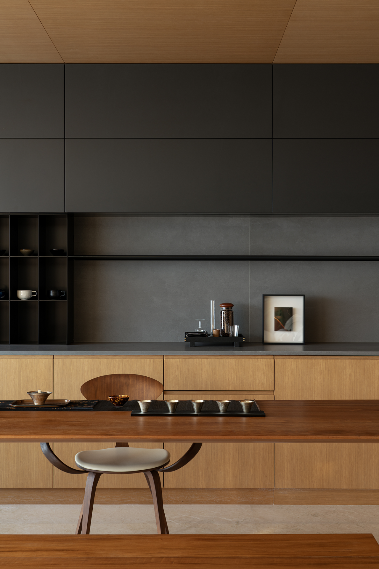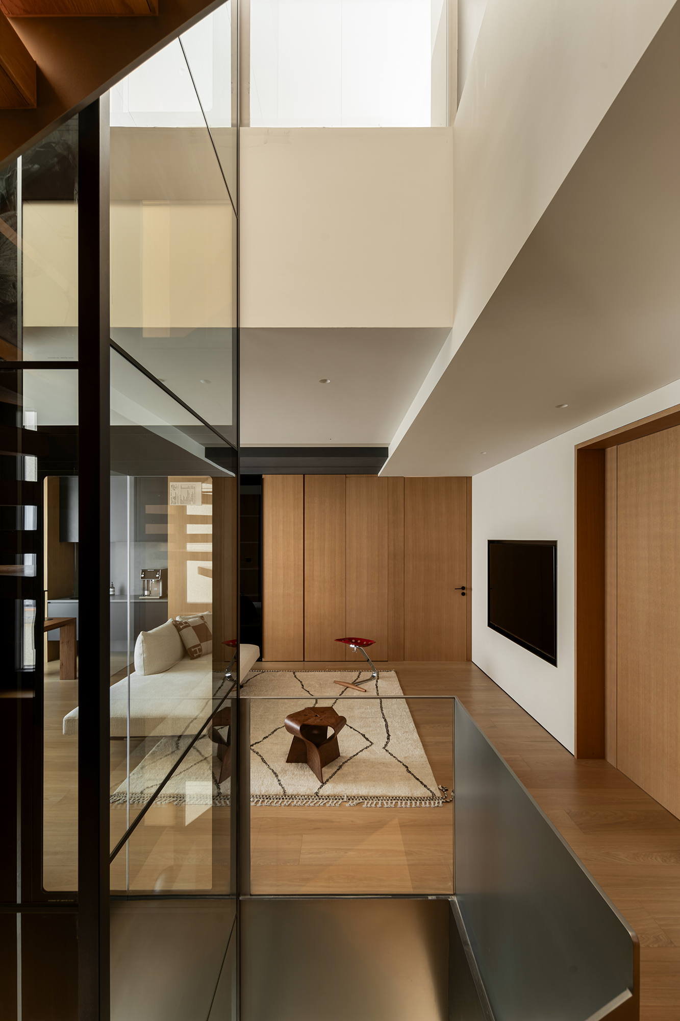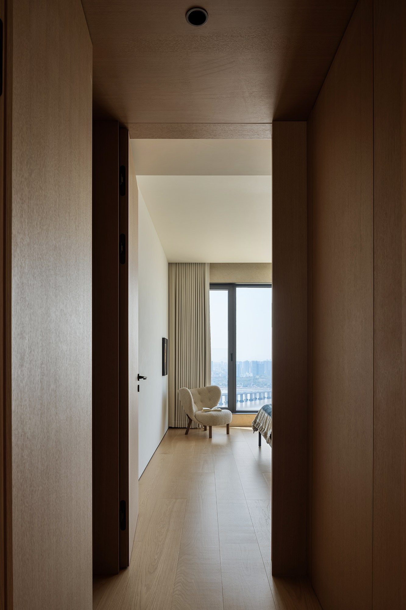 空间意境:流动的江水映入内部构造,动静协同,进一步顺延了环境与现代栖居的脉络关系。橡木与金属板建构理性关系,木饰面作为清晰的介质,从立面循序铺展至顶面,界定分区范围,暗示隐藏的动线。空间在横向界面上尽可能采取极大幅度的自由,组织流畅的块面关系和生活动线,依循江景衍生出流动且开阔的布局。沙发摆放以景色为参考主线,配合大面积极窄窗,制造界限的模糊,增强人与环境的觉察力,同时也造就了这个可生长的有机空间。无论是自由的立面,还是空间的秩序,都保持着局部与整体的克制与平衡。餐厅位于北面,充足的采光聚合了一处独立场域,通过空间材质结构的承转,使得功能空间似个别存在的,游离穿梭互不影响。二层起居室延续了公共区的主旨,作为家庭成员私密且共享的空间,牵引人与人慢慢靠近、亲密,同时确保每个空间都能与江景素面相迎。雅黑饰面构成主卧整体框架,适度削弱了光线的反射,使光感不过分明亮,创造出清静淡然的氛围。无过多繁杂修饰,着重考量环境本身的存在感,留存自然的温度。低纯度的肌理描摹着空间骨架,灰色作底,回归理性的叙事方式。房间入门正对窗景,每一次开门都能深受广阔江景的感官回馈,释放无限的空间感与自由度。