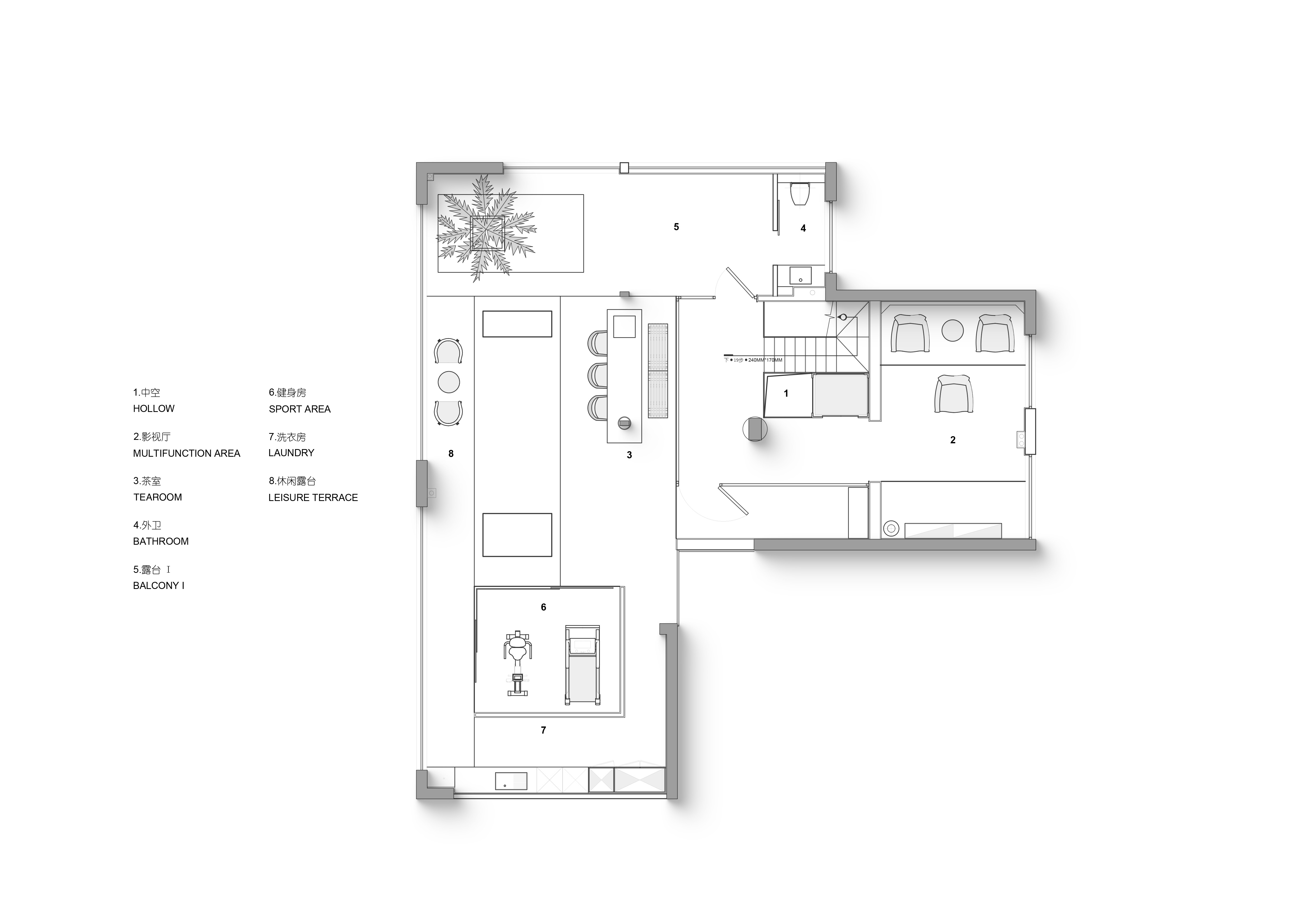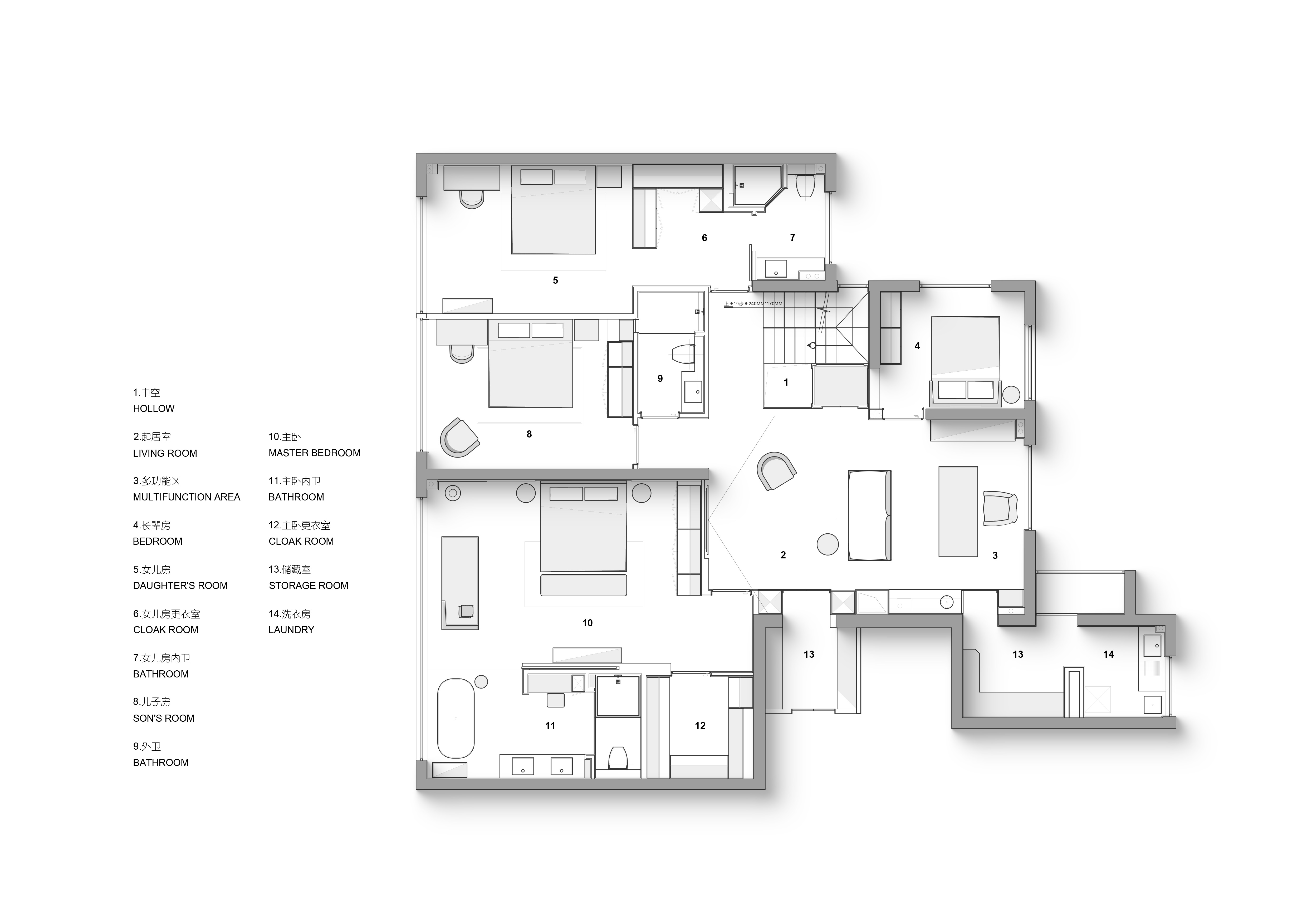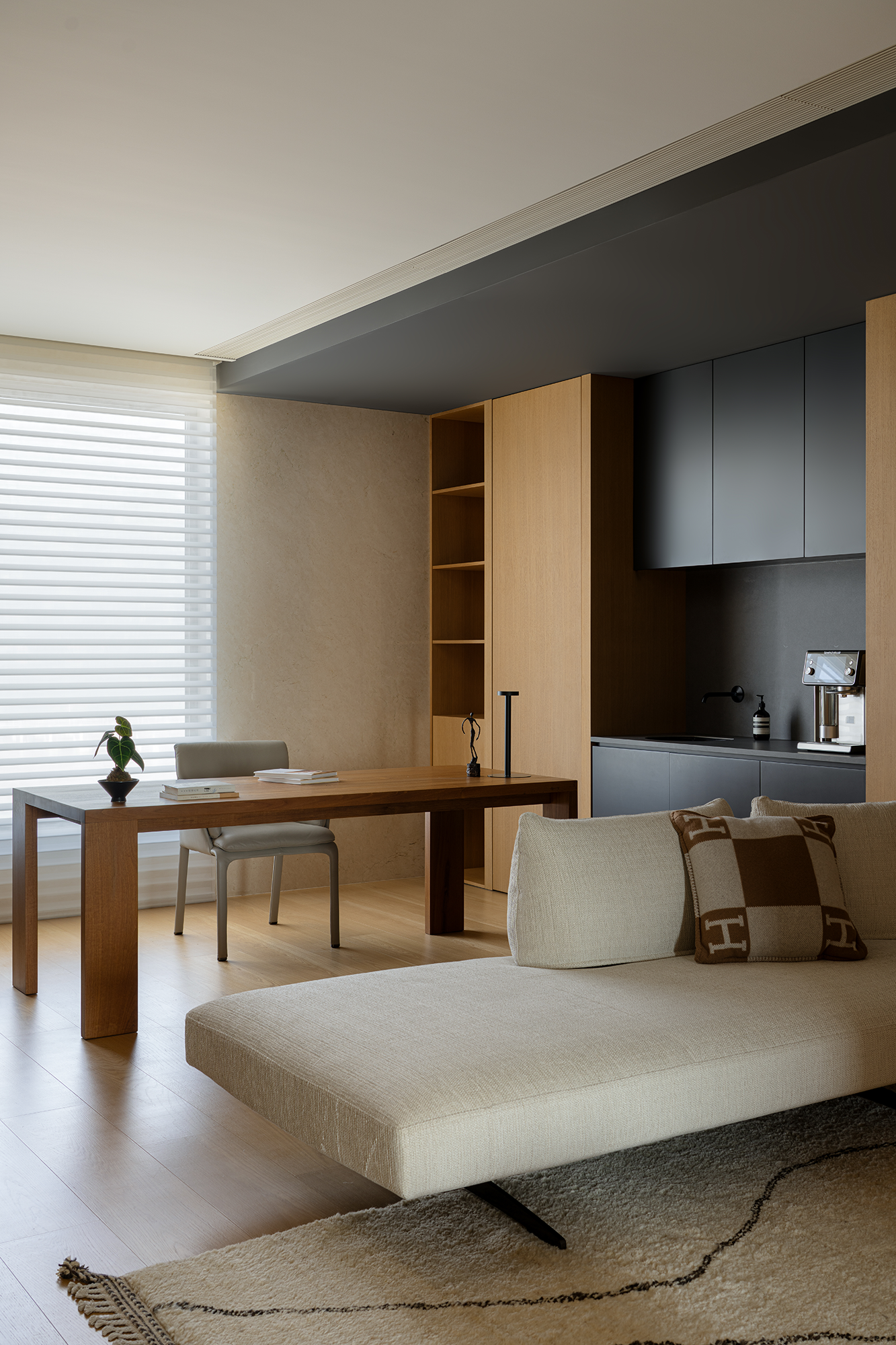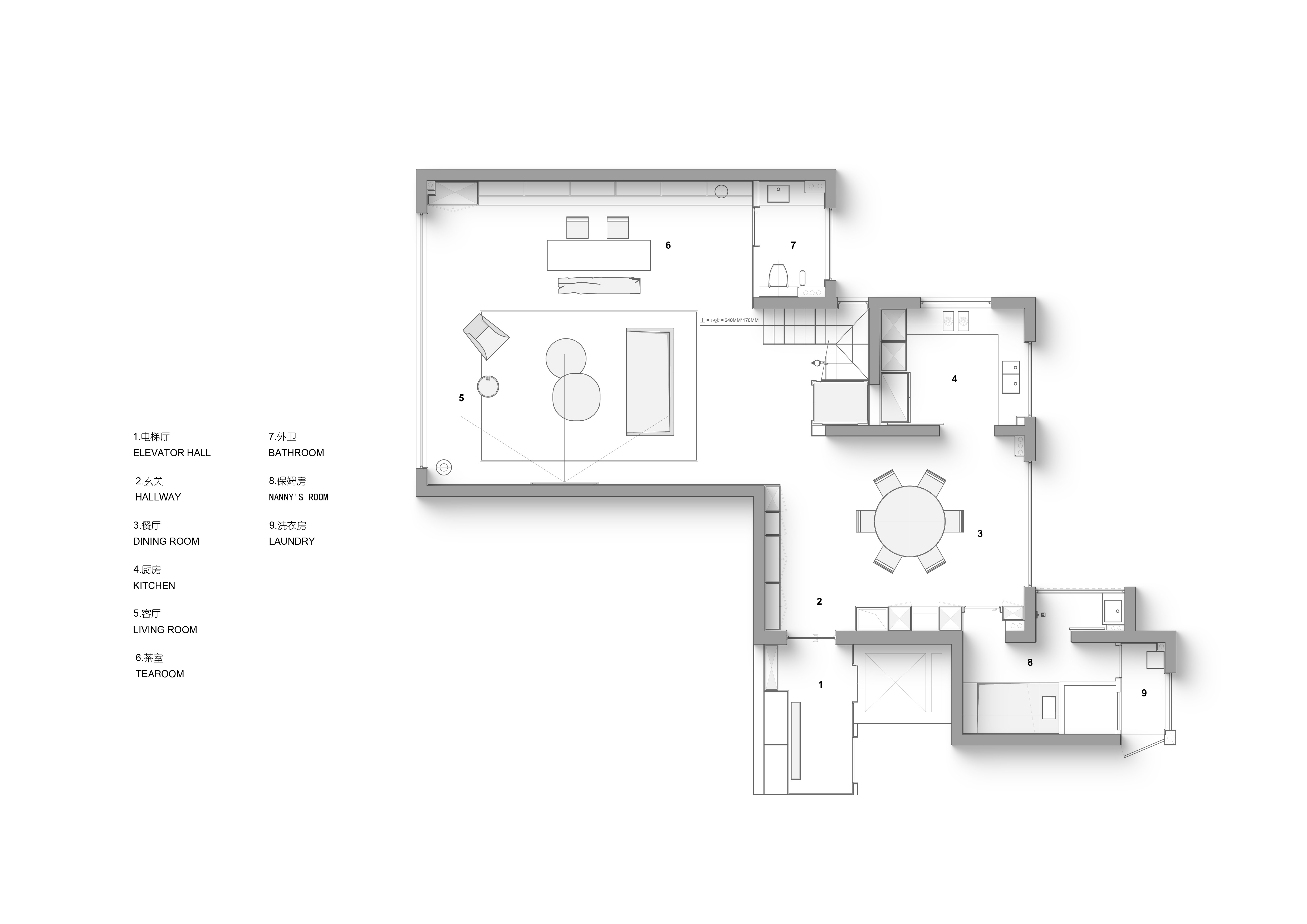 空间意境:流动的江水映入内部构造,动静协同,进一步顺延了环境与现代栖居的脉络关系。橡木与金属板建构理性关系,木饰面作为清晰的介质,从立面循序铺展至顶面,界定分区范围,暗示隐藏的动线。空间在横向界面上尽可能采取极大幅度的自由,组织流畅的块面关系和生活动线,依循江景衍生出流动且开阔的布局。沙发摆放以景色为参考主线,配合大面积极窄窗,制造界限的模糊,增强人与环境的觉察力,同时也造就了这个可生长的有机空间。无论是自由的立面,还是空间的秩序,都保持着局部与整体的克制与平衡。餐厅位于北面,充足的采光聚合了一处独立场域,通过空间材质结构的承转,使得功能空间似个别存在的,游离穿梭互不影响。二层起居室延续了公共区的主旨,作为家庭成员私密且共享的空间,牵引人与人慢慢靠近、亲密,同时确保每个空间都能与江景素面相迎。雅黑饰面构成主卧整体框架,适度削弱了光线的反射,使光感不过分明亮,创造出清静淡然的氛围。无过多繁杂修饰,着重考量环境本身的存在感,留存自然的温度。低纯度的肌理描摹着空间骨架,灰色作底,回归理性的叙事方式。房间入门正对窗景,每一次开门都能深受广阔江景的感官回馈,释放无限的空间感与自由度。