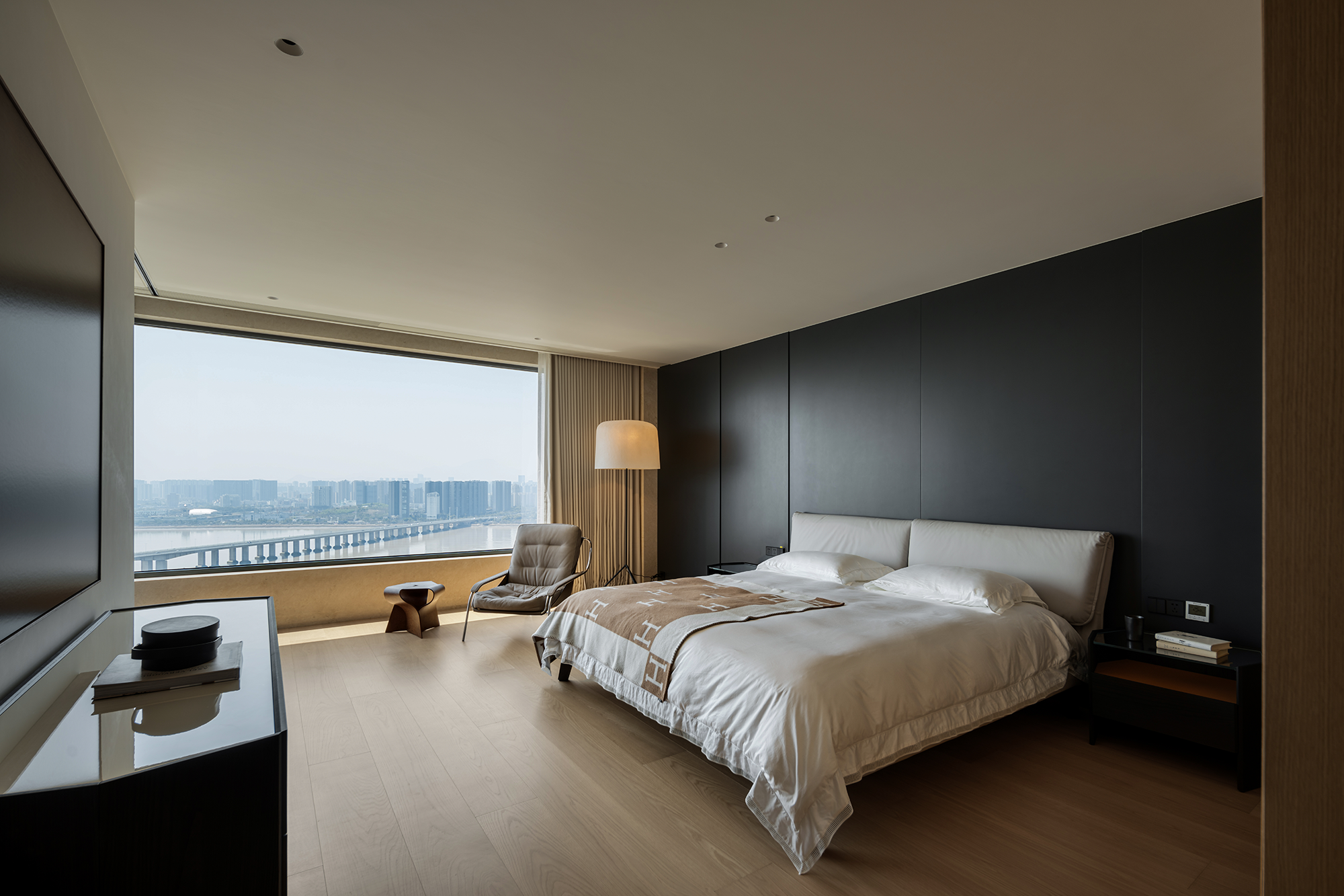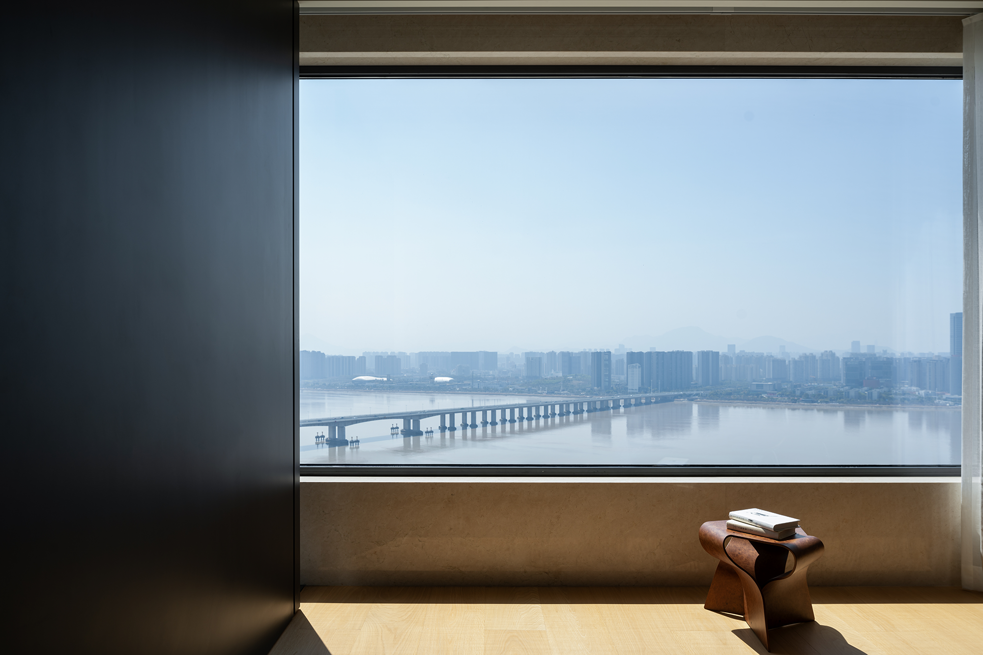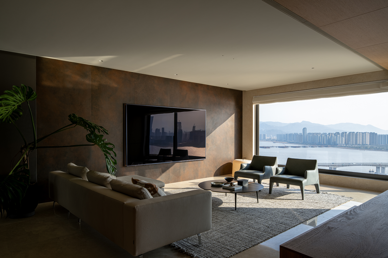项目定位:本案位于温州瓯江畔,以视野为尺度丈量着身处之地,目之所及,城际与江界线一览无余,无形中拓展域宽。设计希望在构建现代生活方式的基础上,借助材质结构的关系处理,优化具有质感的场景呼应,去获得隐性的情绪与价值回馈,诠释新贵主义的真实内核。