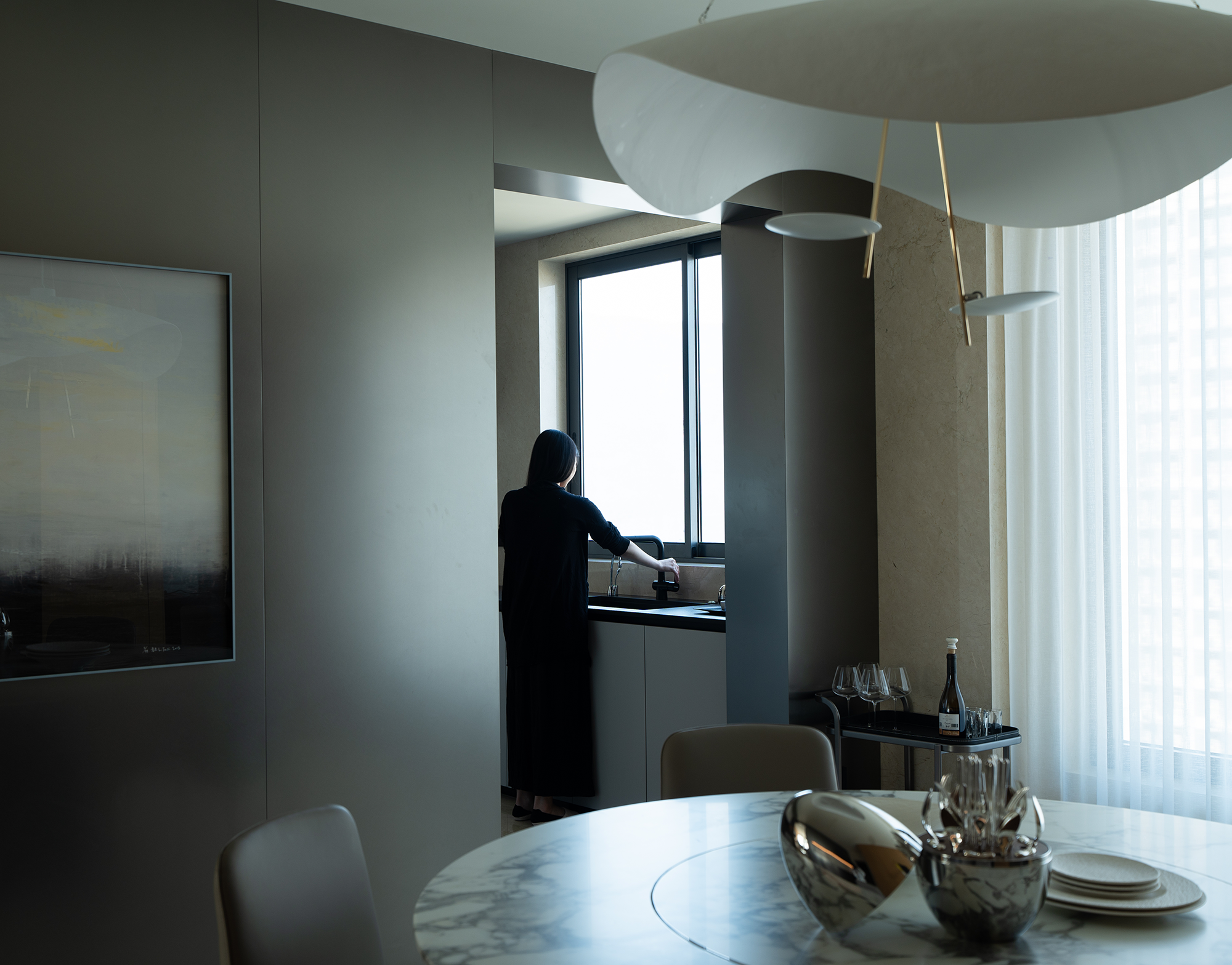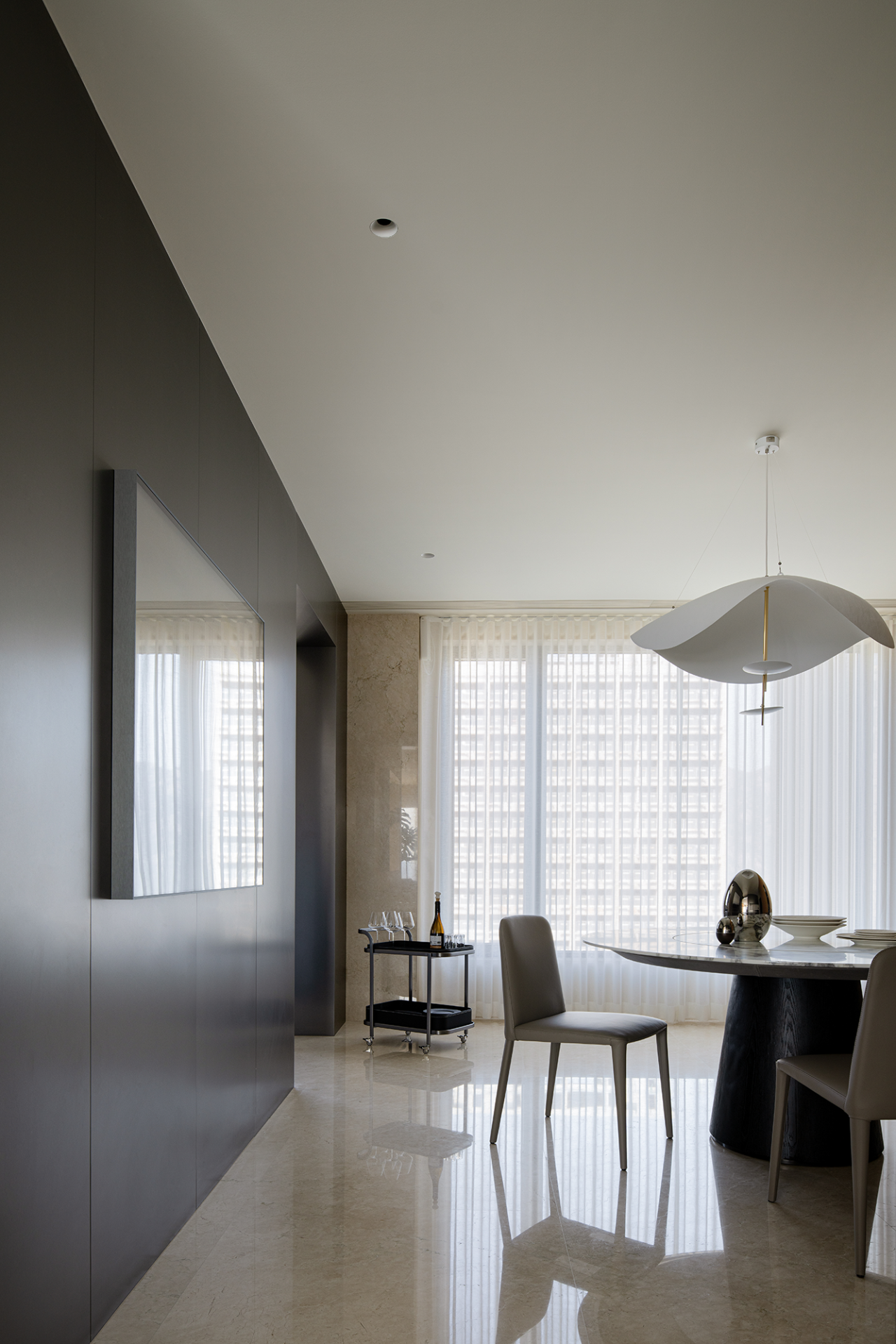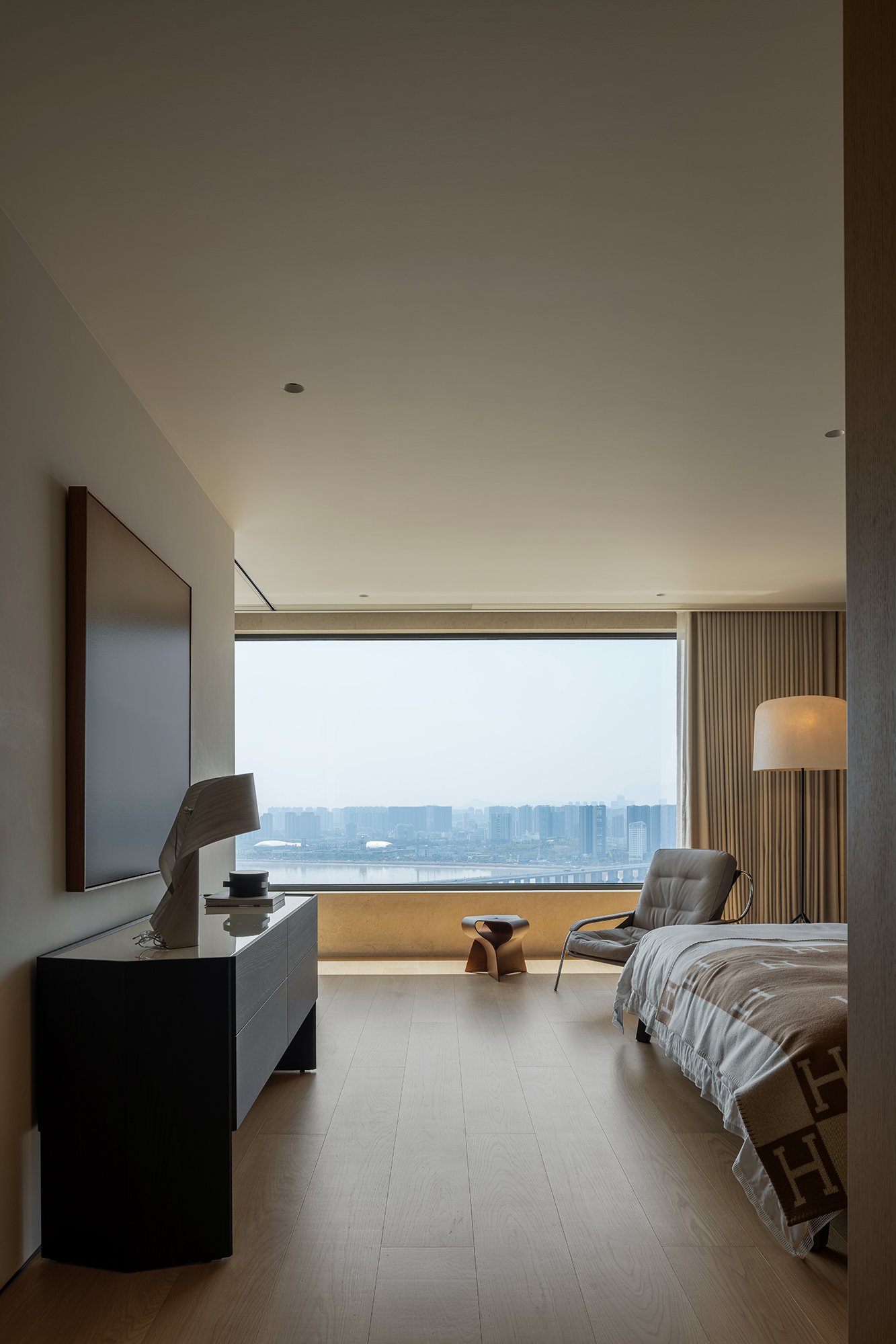 项目定位:本案位于温州瓯江畔,以视野为尺度丈量着身处之地,目之所及,城际与江界线一览无余,无形中拓展域宽。设计希望在构建现代生活方式的基础上,借助材质结构的关系处理,优化具有质感的场景呼应,去获得隐性的情绪与价值回馈,诠释新贵主义的真实内核。