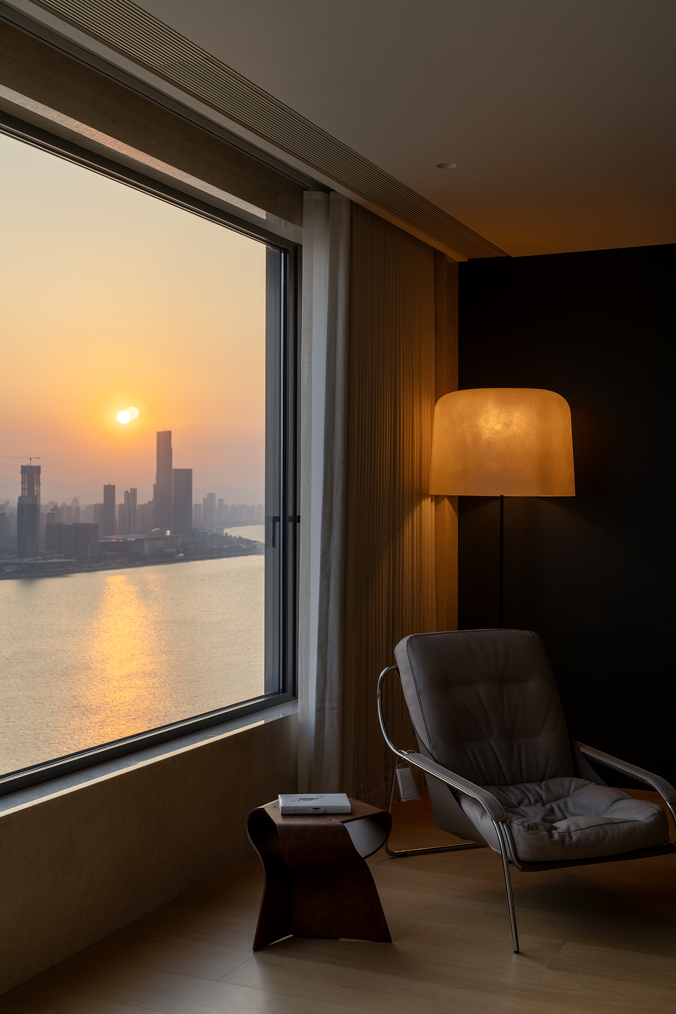 空间布局:设计致力打破内外界限,让自然与时间能够真正流入到空间内部,极简之上构建另一层深度的内容,去探讨设计更本质的意义。空间在横向界面上尽可能采取极大幅度的自由,组织流畅的块面关系和生活动线,依循江景衍生出流动且开阔的布局。引光穿透电梯井,深度考量界面的视角、层级的高度以及生活的轨迹,打破固化空间的物理容器,引导整个三层结构体主动参与到生活方式与居住品质的优化中。南北纵横,穿梭于顺畅的动线,紧密贴合居住者日常习惯。辅以高饱和度的柔和感,细节中丰盈一抹腔调,为这处私人领域增加更真实的温度。落日余晖向室内铺展,落入一层浓郁质感的金色笼罩。至此,自然的变化与内部场景完成了呼应,清晰且同步地共享着同一个时空,而室内空间也不再只是单一封闭的形态。每一处转角、每一寸活动,都在呼应着这场无形的生命流动,创造一个游目骋怀的现代都市生活环境,回馈当代栖居真正的稀缺与价值。