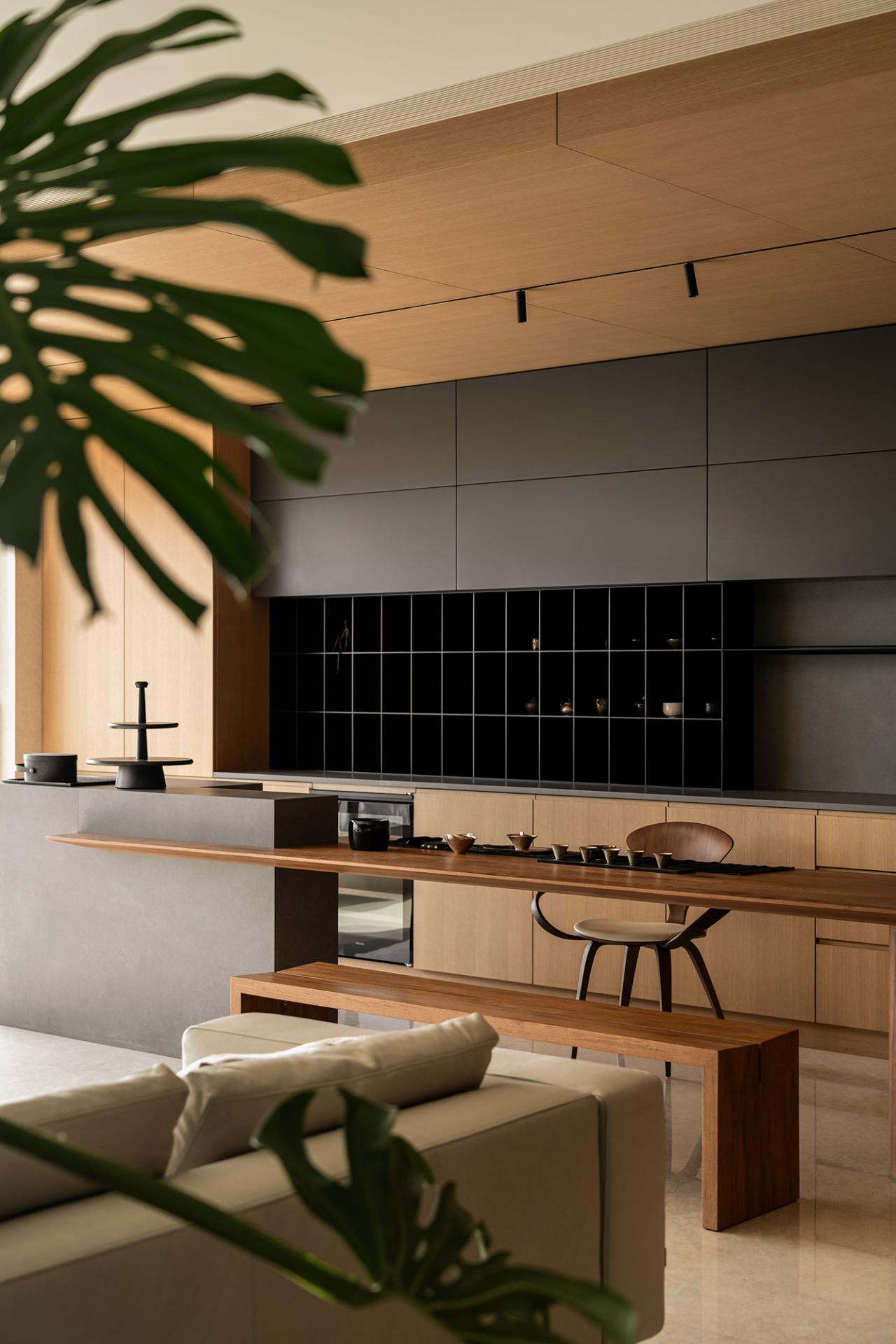 设计选材:玻璃、金属、橡木、岩板共同搭建起结构与细致的材质工艺,不仅仅彰显着外在的表现形式,同步深化了空间内在的肌理质感。