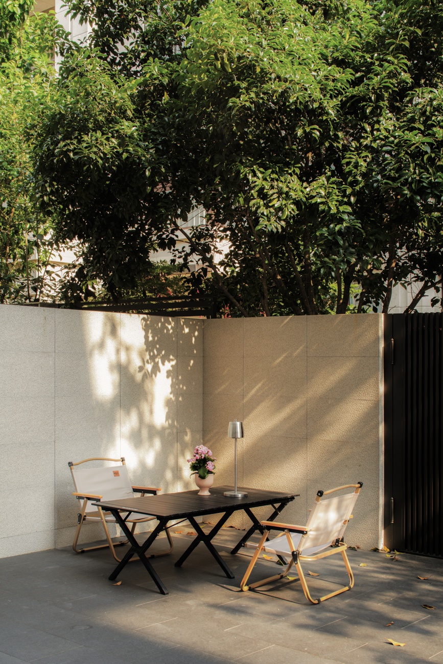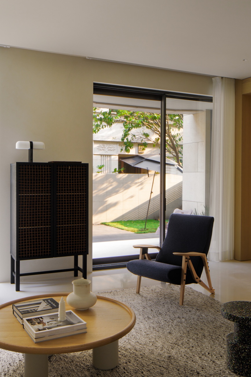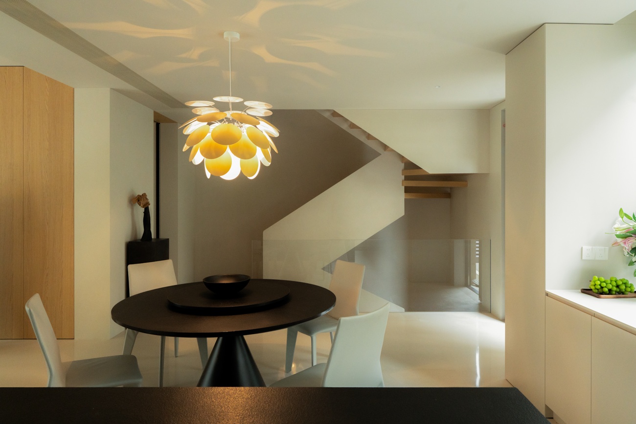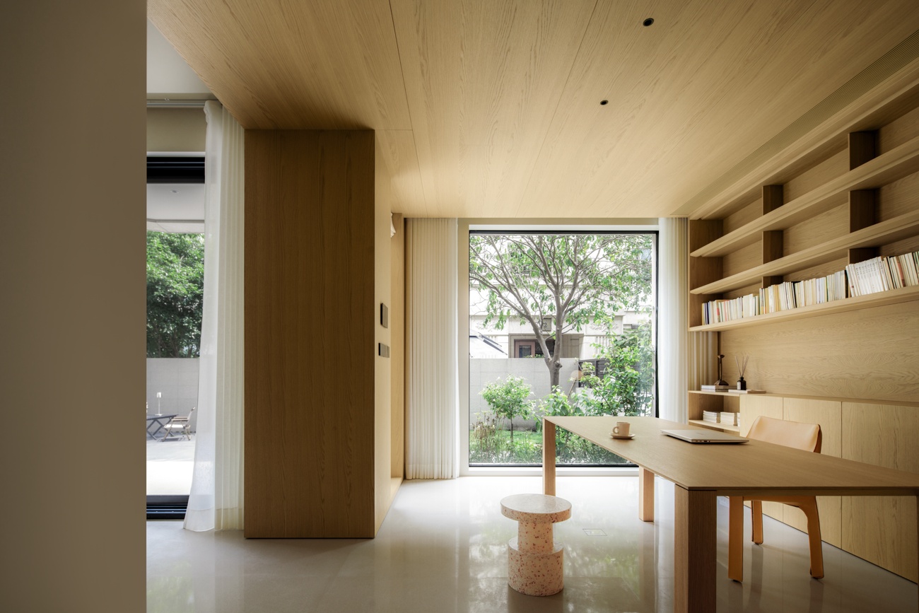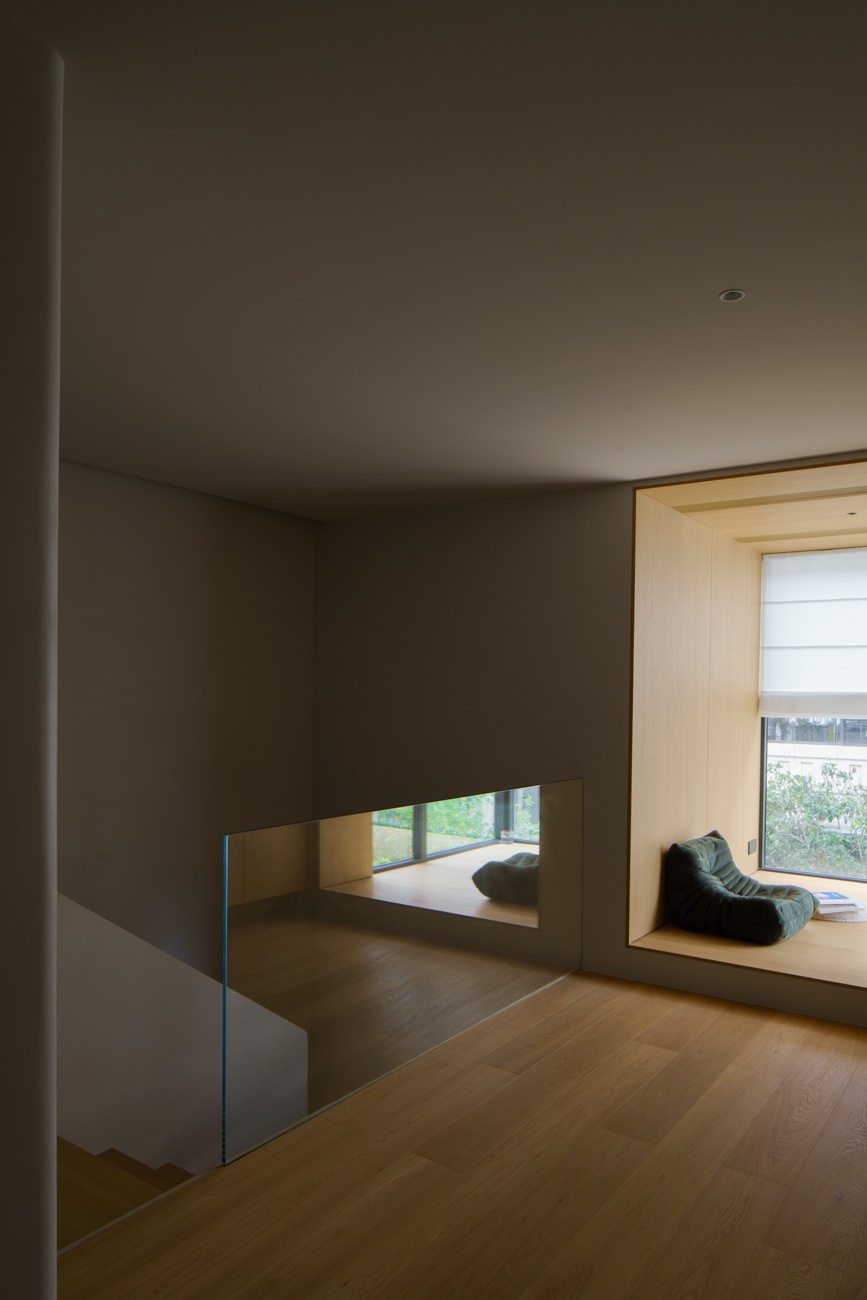 空间意境:一层作为公共核心区,设计希望最大化利用室外的庭院风景,通过大面积落地窗与玻璃移门系统,有效拆解了室内外的物理隔阂,使庭院葱郁的景致得以无缝渗透、融入室内。自此,空间、人、自然三者间达成无声而深刻的共鸣。设计中尽可能摒弃了多余的装饰与阻隔,以极其克制的态度,寻求场景构建的精准平衡。客厅沙发后方,开放式茶室以材质转换实现对区域的软性分隔,从墙面延伸至天花,均覆以温润的原木色饰面,营造出一种被自然材质包裹的沉浸氛围,在保障功能分区独立性的同时,完整维系了视觉的通透感与窗外景观的连续性。随着木质踏步的悬空楼梯向上延伸,理性的公区属性逐渐向温馨的私密空间过渡,自然延伸出木地板达成对情绪感知的划分,从而明晰功能区域间的界限。在楼梯转角设置一节向上的踏步,巧妙地形成一处相对独立的角落,两面落地窗为此地提供丰沛的照度,树梢的绿意笼罩,形成自然的切面,一张懒人沙发完成对这处特殊角落的最后勾勒。如此,一个仅供一人消遣的阅读场景便构建完成。当空间不再强迫人扮演社会角色时,真正的居住自由才正式开始。