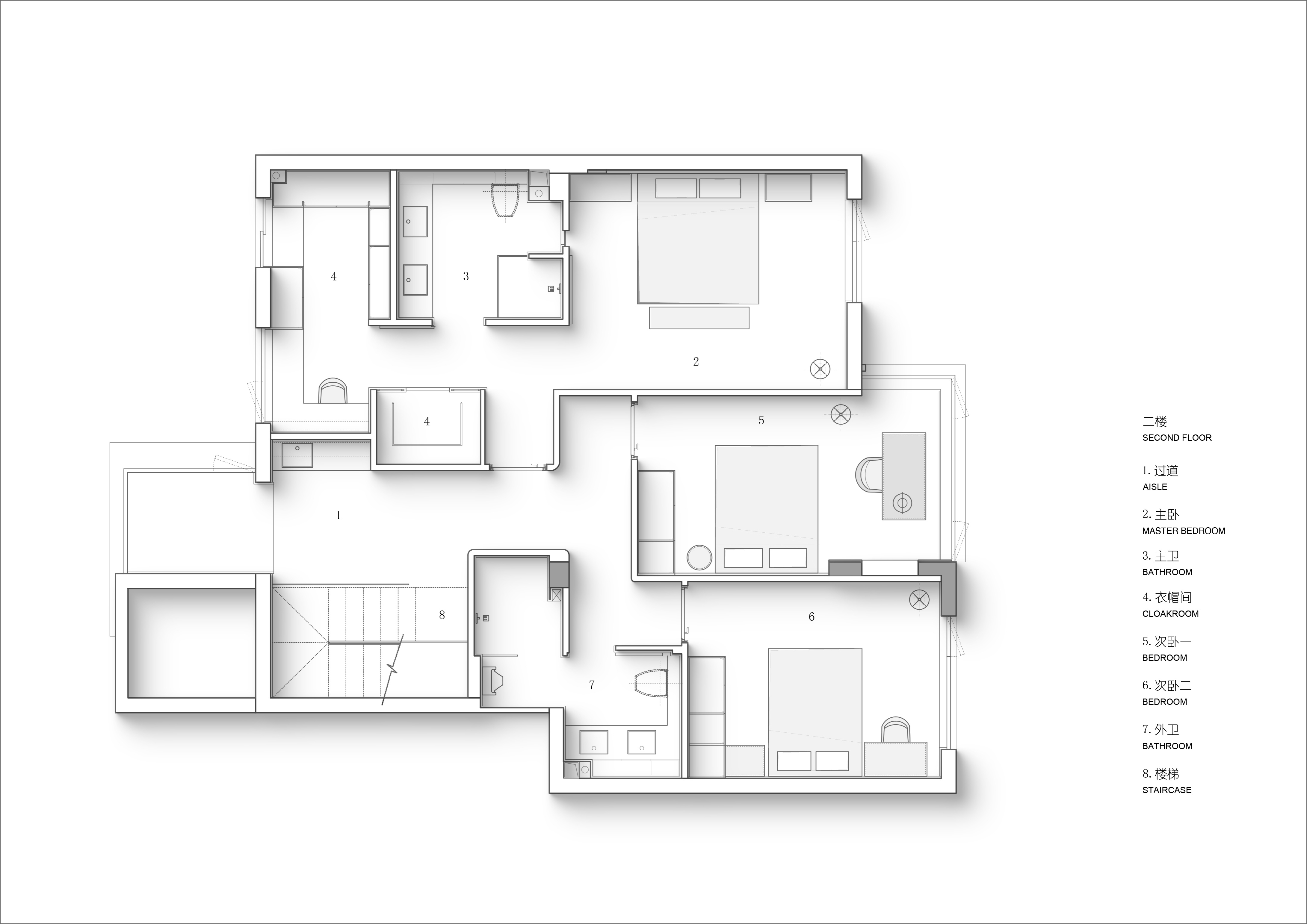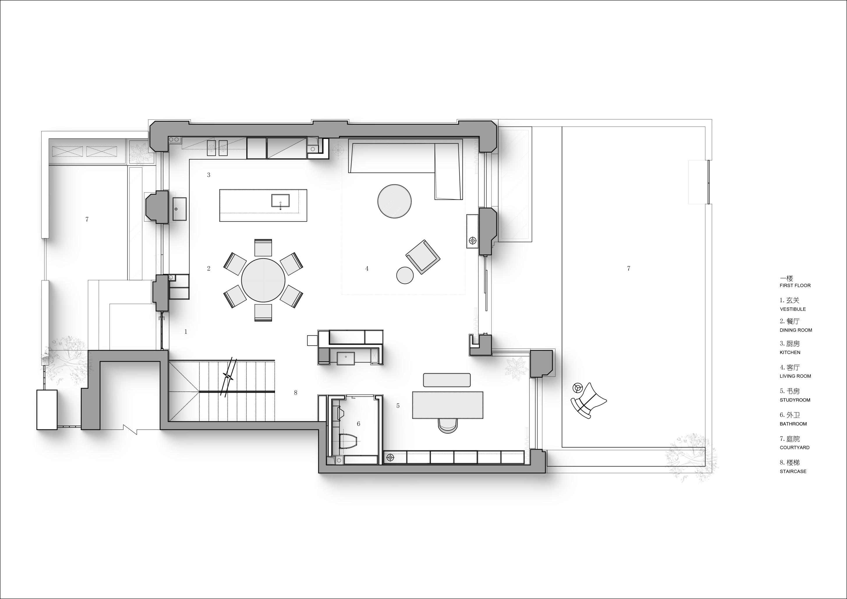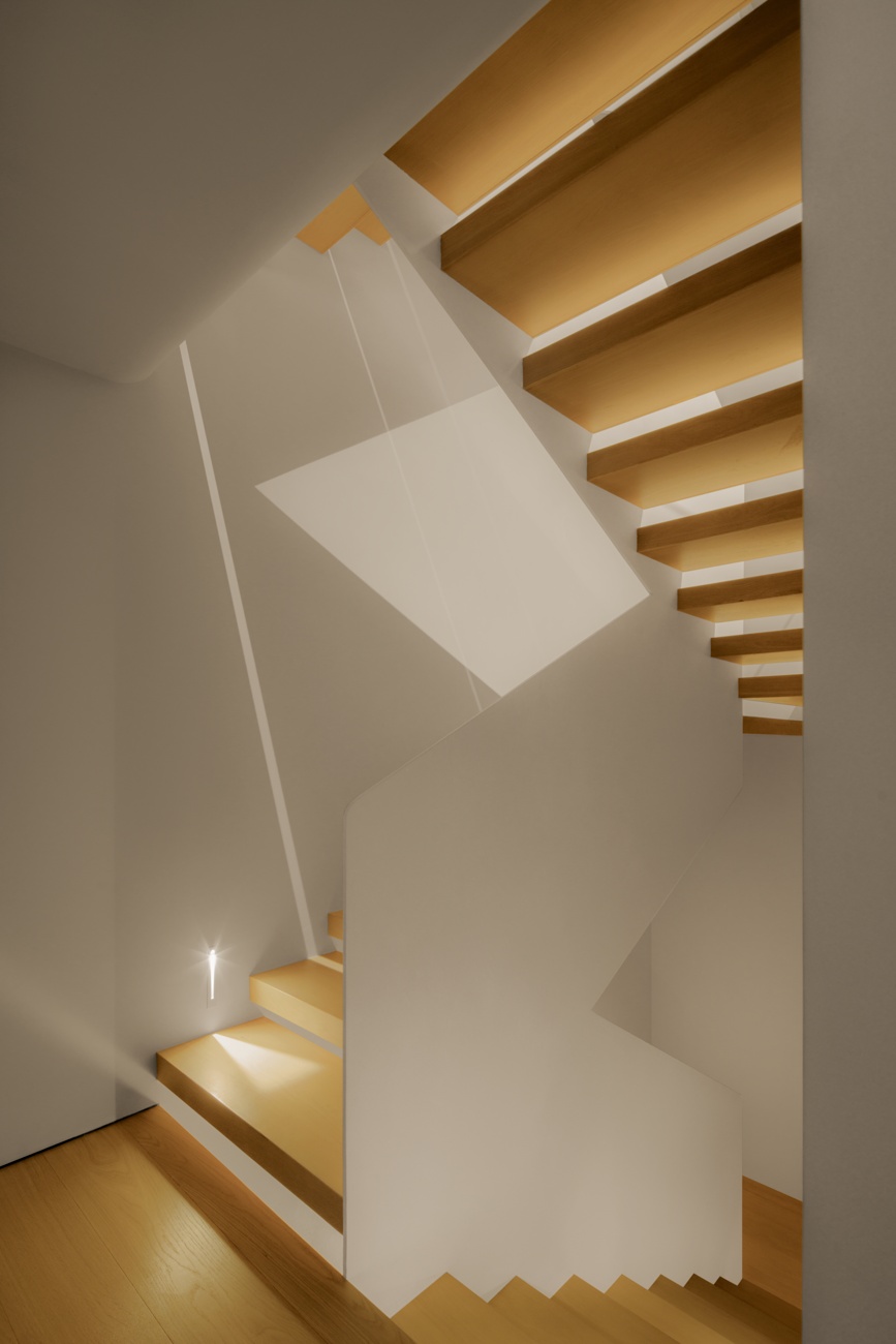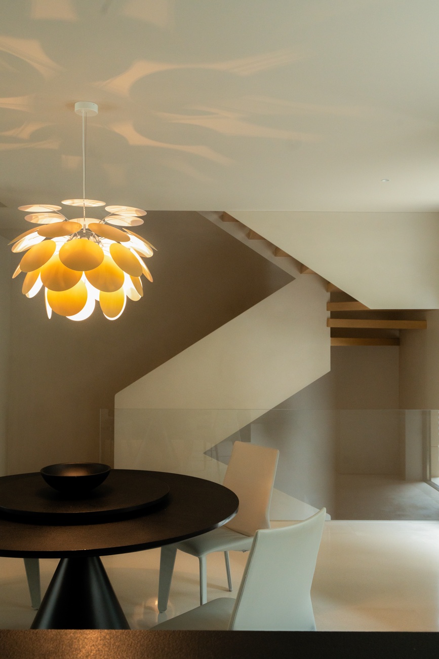 空间意境:一层作为公共核心区,设计希望最大化利用室外的庭院风景,通过大面积落地窗与玻璃移门系统,有效拆解了室内外的物理隔阂,使庭院葱郁的景致得以无缝渗透、融入室内。自此,空间、人、自然三者间达成无声而深刻的共鸣。设计中尽可能摒弃了多余的装饰与阻隔,以极其克制的态度,寻求场景构建的精准平衡。客厅沙发后方,开放式茶室以材质转换实现对区域的软性分隔,从墙面延伸至天花,均覆以温润的原木色饰面,营造出一种被自然材质包裹的沉浸氛围,在保障功能分区独立性的同时,完整维系了视觉的通透感与窗外景观的连续性。随着木质踏步的悬空楼梯向上延伸,理性的公区属性逐渐向温馨的私密空间过渡,自然延伸出木地板达成对情绪感知的划分,从而明晰功能区域间的界限。在楼梯转角设置一节向上的踏步,巧妙地形成一处相对独立的角落,两面落地窗为此地提供丰沛的照度,树梢的绿意笼罩,形成自然的切面,一张懒人沙发完成对这处特殊角落的最后勾勒。如此,一个仅供一人消遣的阅读场景便构建完成。当空间不再强迫人扮演社会角色时,真正的居住自由才正式开始。