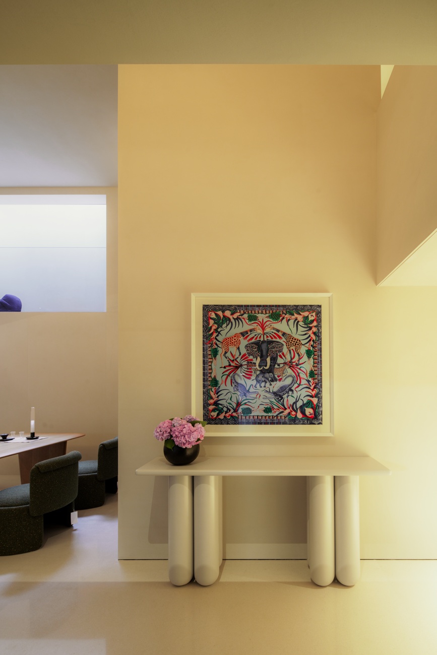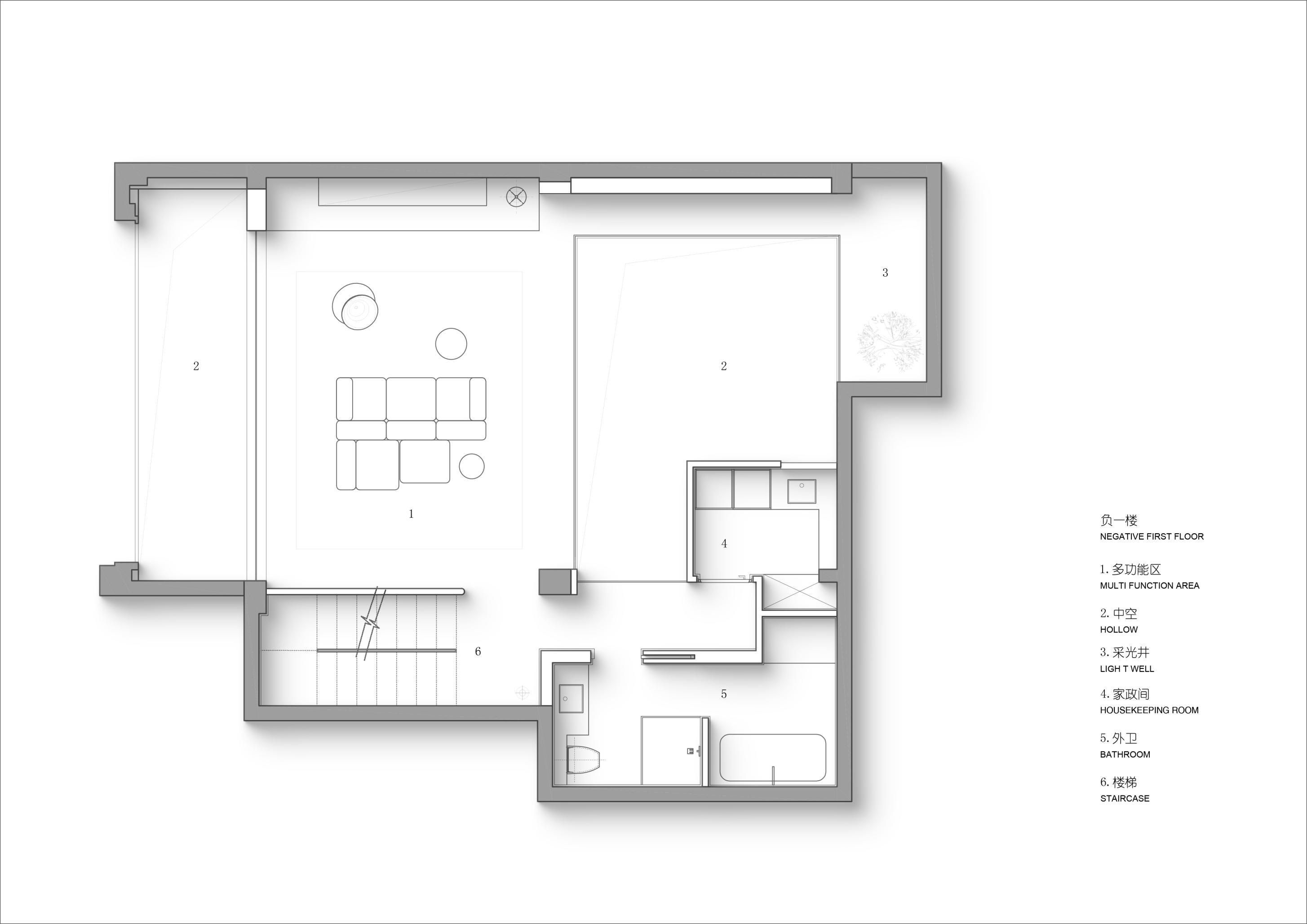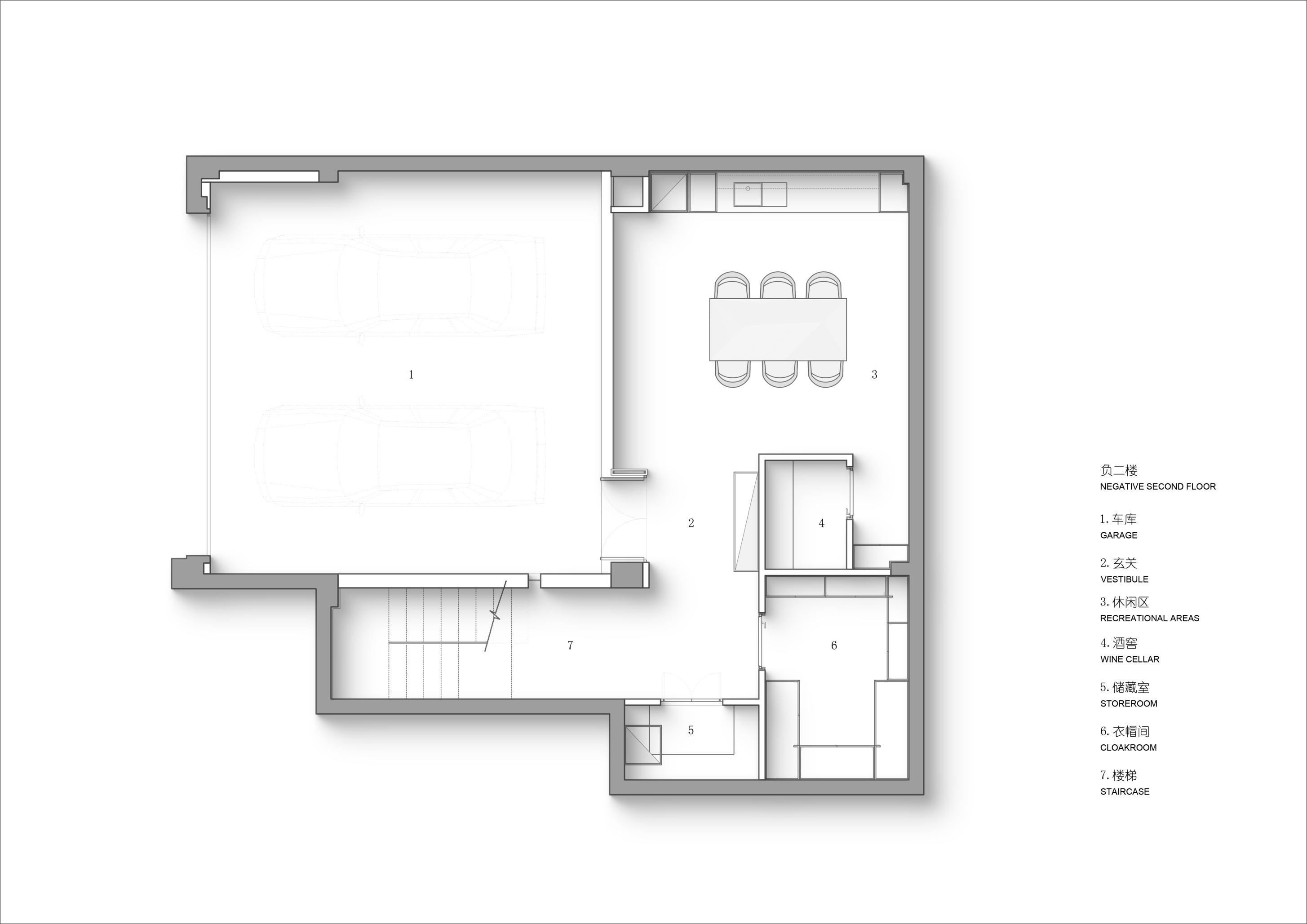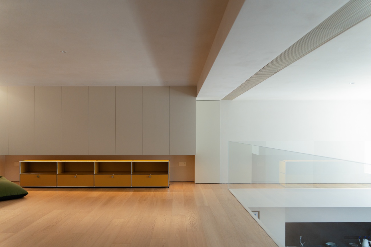 空间布局:夹层侧面采用通透玻璃,自下而上形成清晰的几何层次,同时引入一层的自然天光,带来向上的呼吸感。负一层设置酒柜与长桌,同时满足吃茶与喝酒的功能,但在座椅的选择上更倾向于营造“温柔的包裹感”,通过休闲沙发的置入,完成对生活本身自由性的解读。得益于地下空间的优越层高,我们得以通过夹层空间的引入,为场景赋予层次感与艺术性。