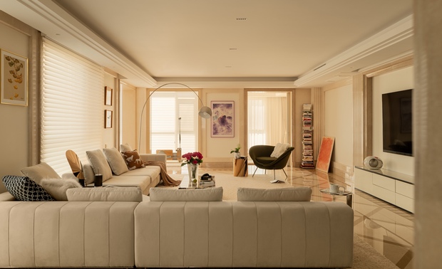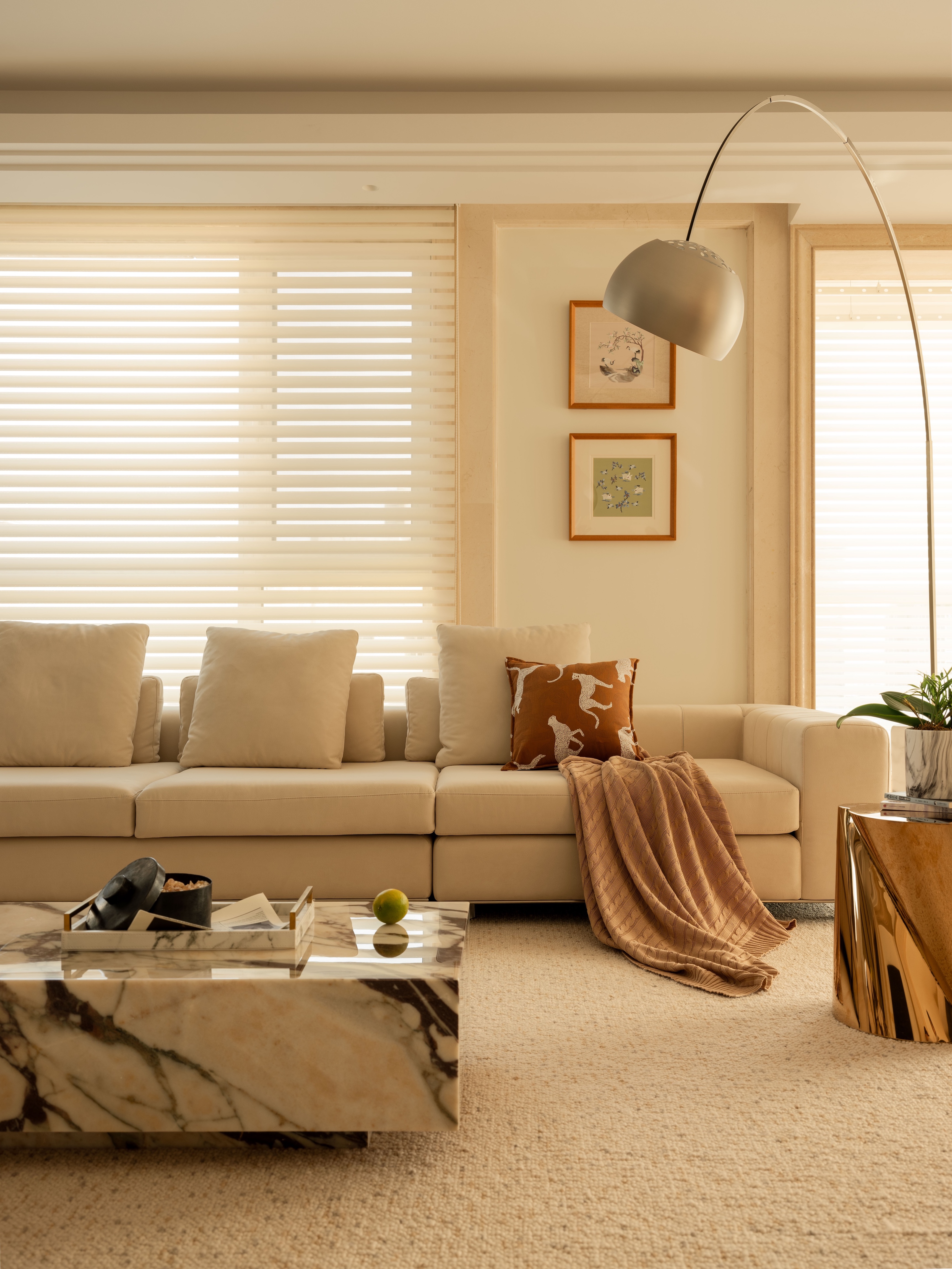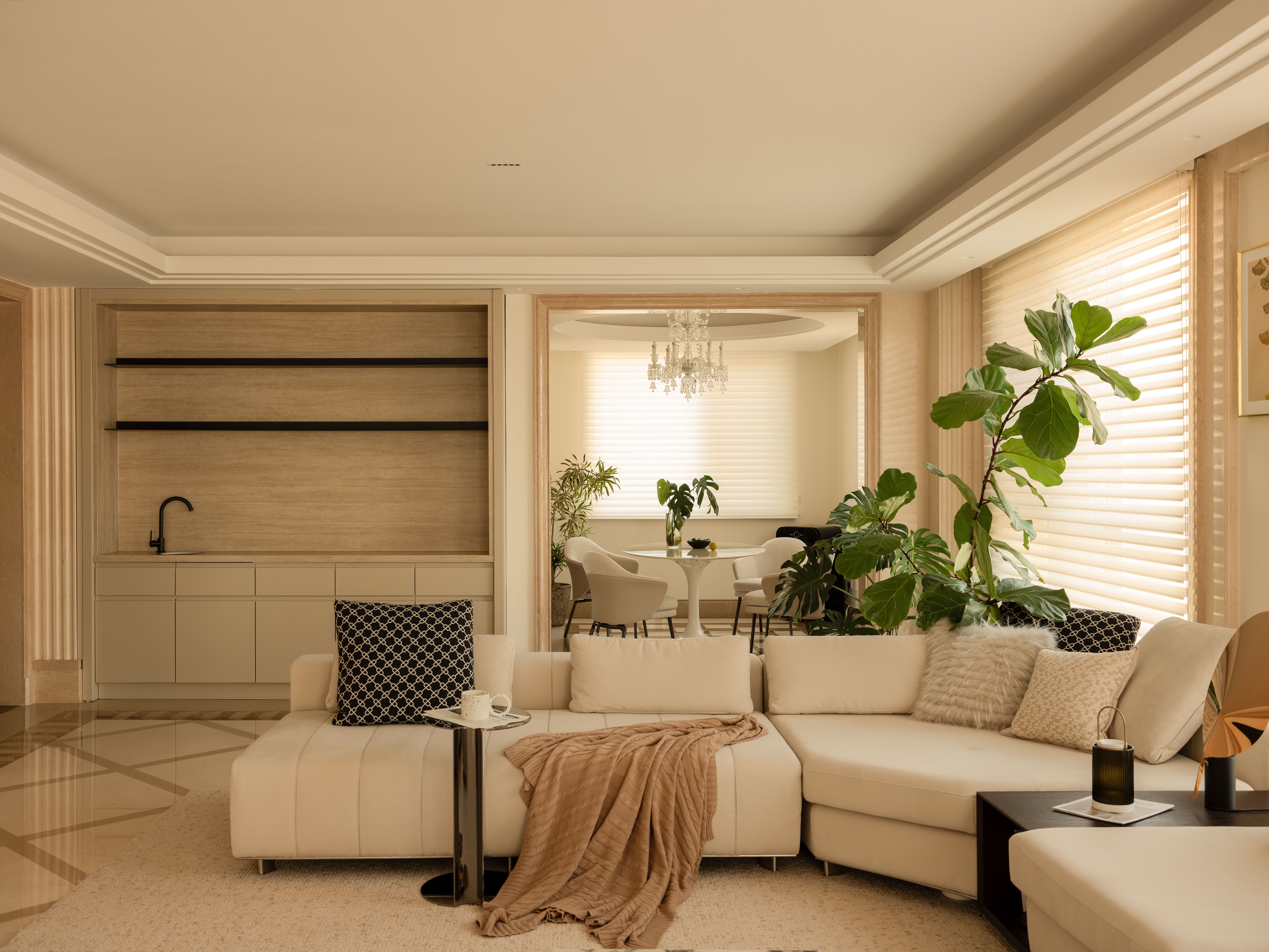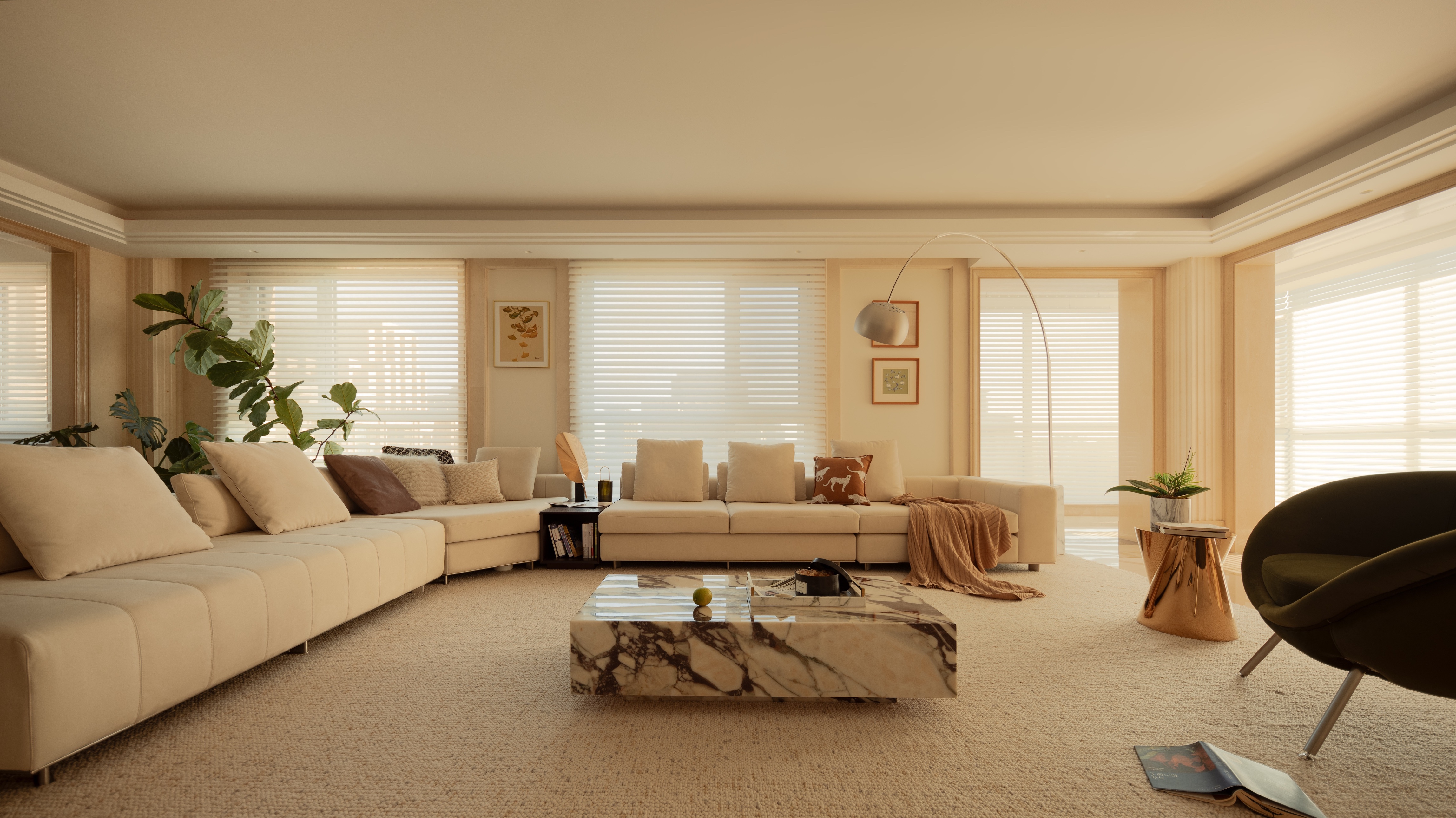 空间意境:家具、装饰和配色等方面入手,以实现时尚又不失稳重;娇柔的法式线条与沉稳的意大利沙发也会擦出迷人的火花;电视背景墙以及整面墙柜体的颜色是我们在设计沟通时博弈成功的结果,客户可能更倾向于和墙面同色的电视背景墙以及柜体,但是黑色的背景墙以及柜体在这个空间中无疑是加分项,使客厅整体的氛围更沉稳、优雅有层次;沙发旁边的单椅选择了客户喜欢的元宝椅,最后我们选择了flos的钓鱼灯为空间提升气质。