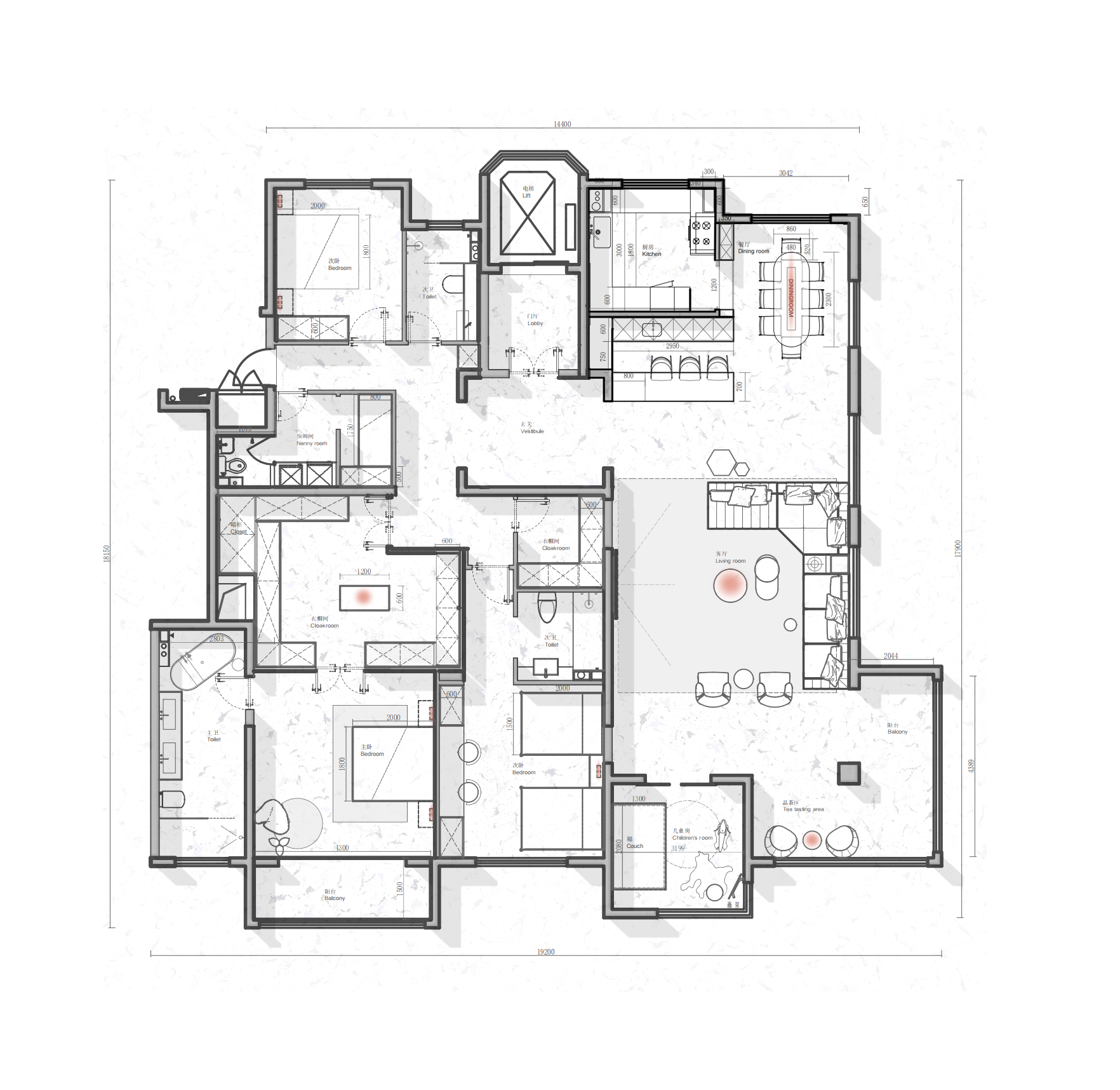设计选材:主卧的设计,我们在原有的户型上改动还是比较大的,原始户型打开主卧室的门之后 是一个狭窄的小走廊,走廊两边各有一个小衣帽间,之后才能来到主卧室;对于一个四千万的豪宅来说这个衣帽间未免显得有些小气了,我们的设计将两个小衣帽间的墙壁拆除,使之和走廊融合在一起,形成一个大气的主卧衣帽间;