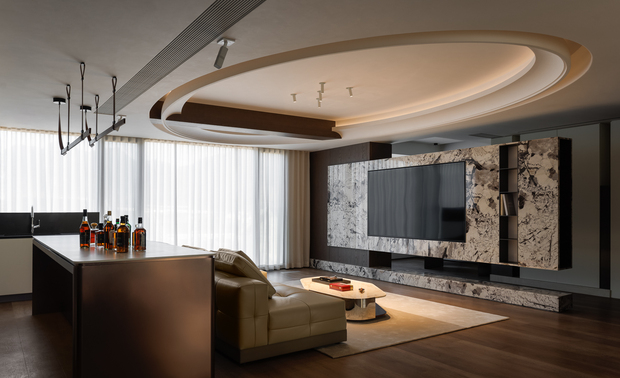 以环形悬浮吊顶打造视觉焦点,大理石背景墙糅合金属质感,吧台与客厅相融,勾勒出轻奢且具互动性的现代起居空间。
