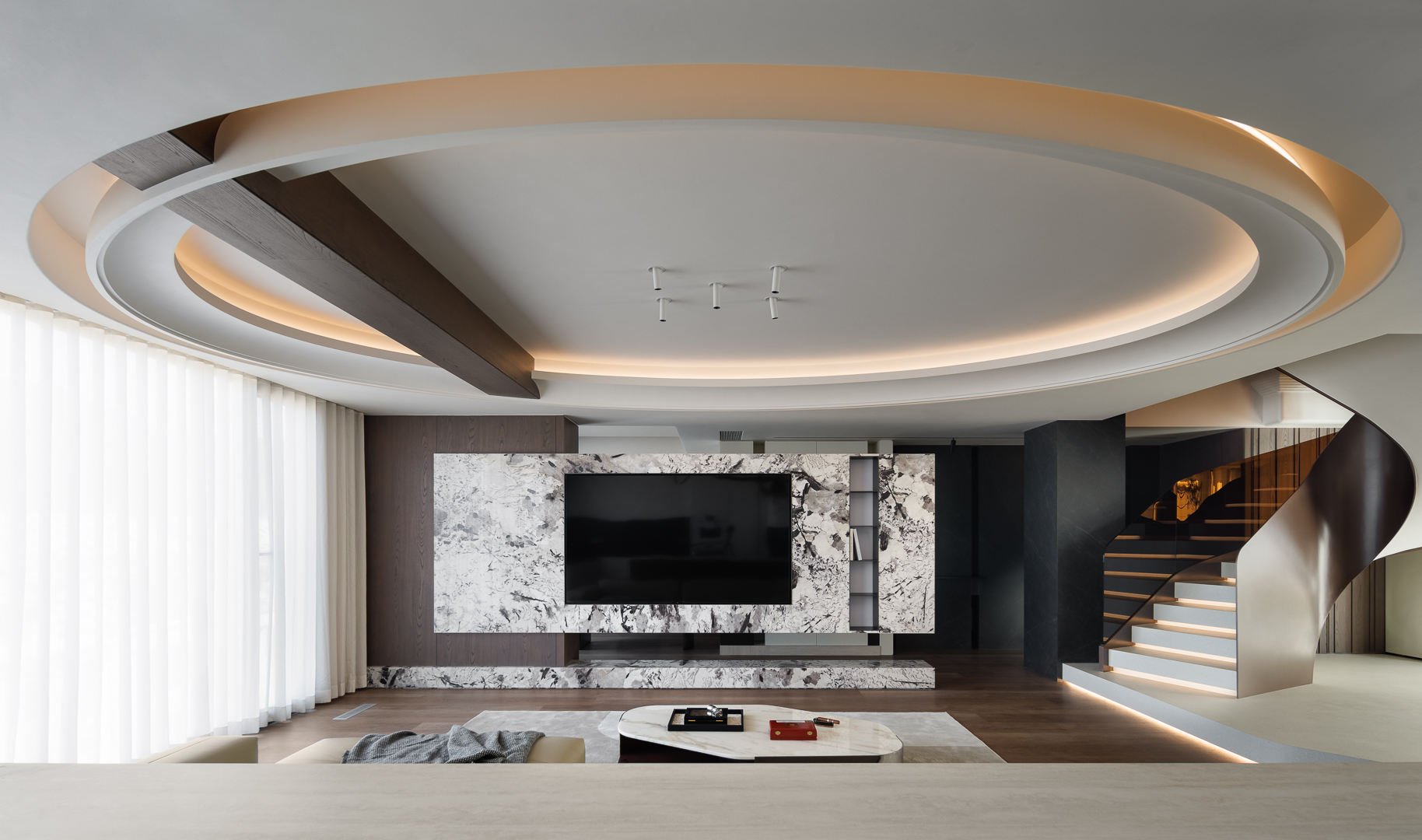 以多层环形吊顶打造空间韵律,大理石电视墙碰撞木质饰面,旋梯衔接动线,勾勒出轻奢且具流动感的现代客厅美学。