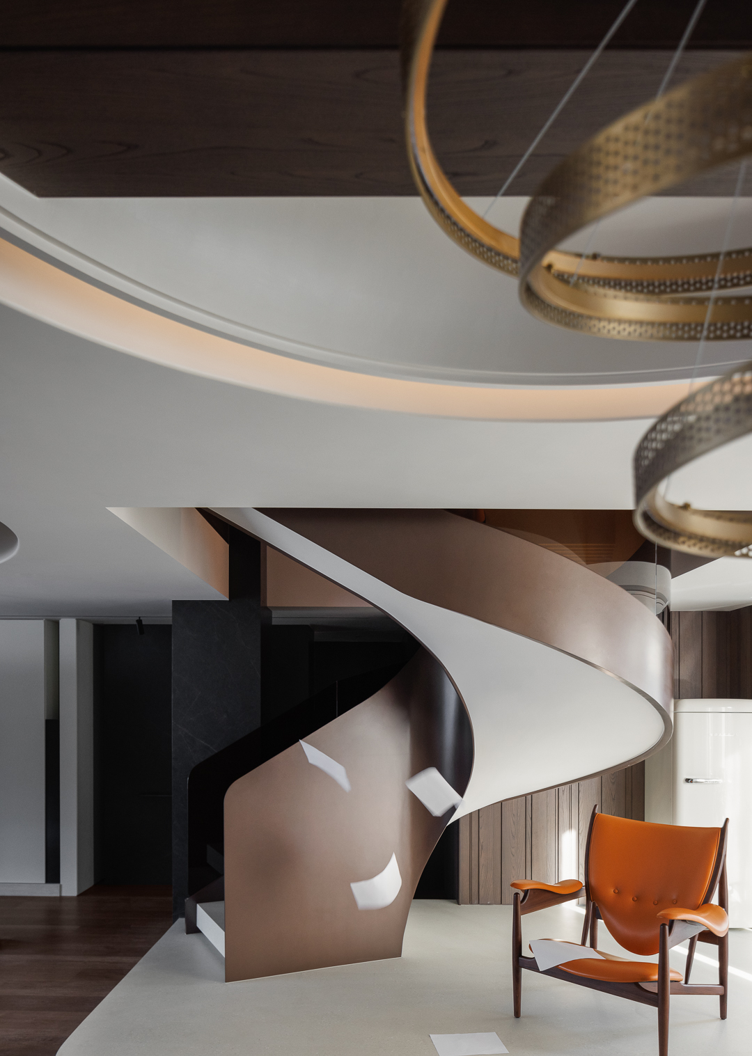 以金属旋梯为空间视觉锚点,环形艺术吊灯与流线型吊顶呼应,暖棕皮质单椅提亮色调,打造轻奢且具艺术张力的过渡区域。