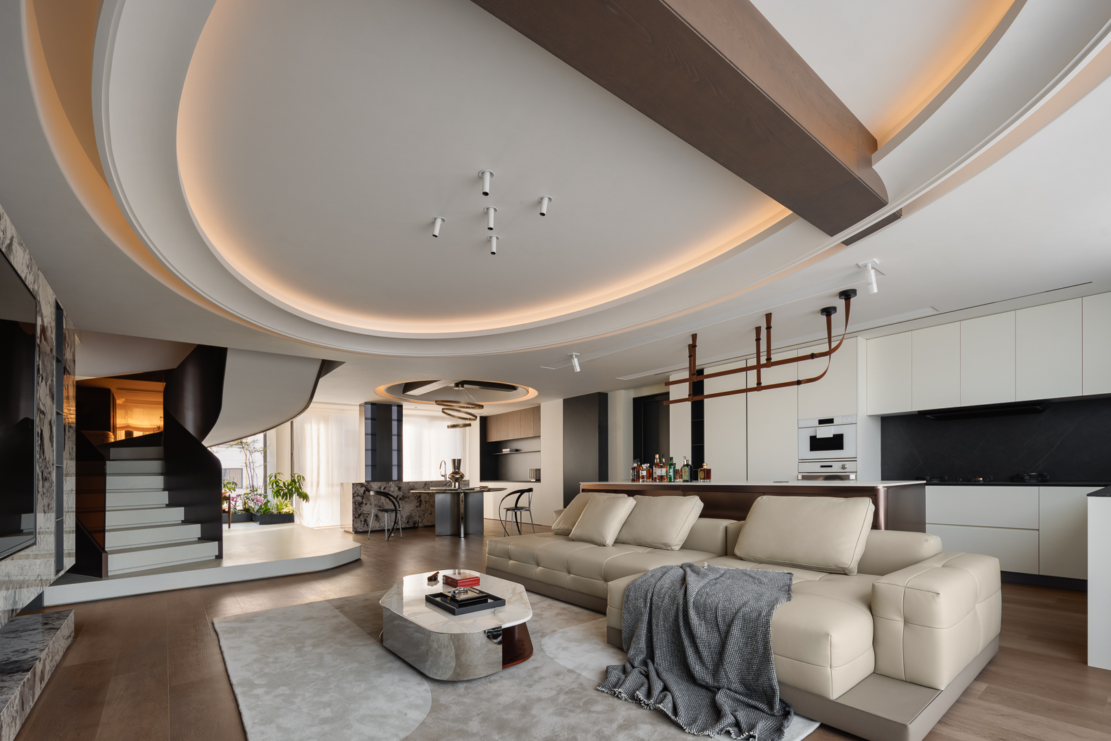 以环形叠级吊顶塑空间层次感,旋梯与餐厨区相融消弭边界,柔质皮质沙发中和冷硬材质,打造轻奢通透的现代起居场域。