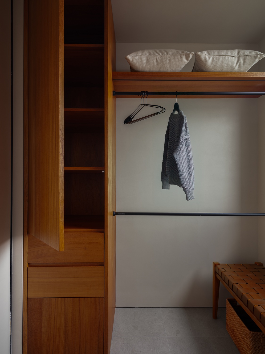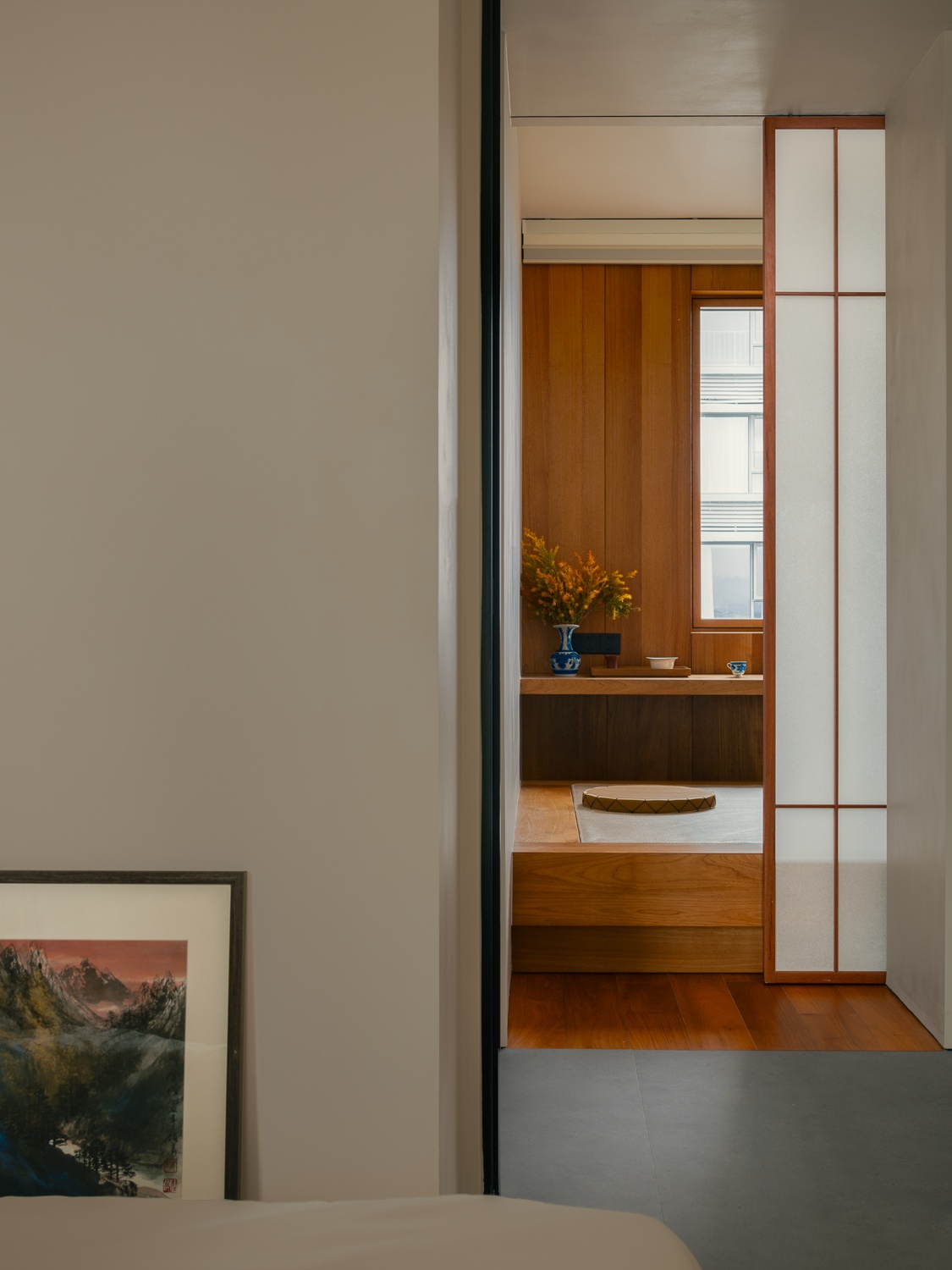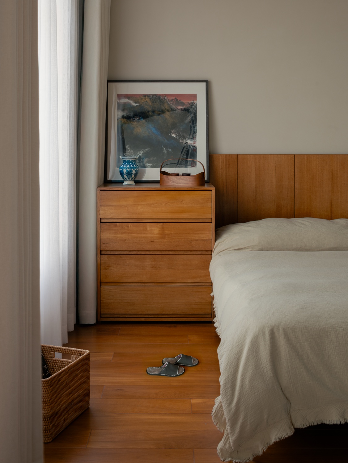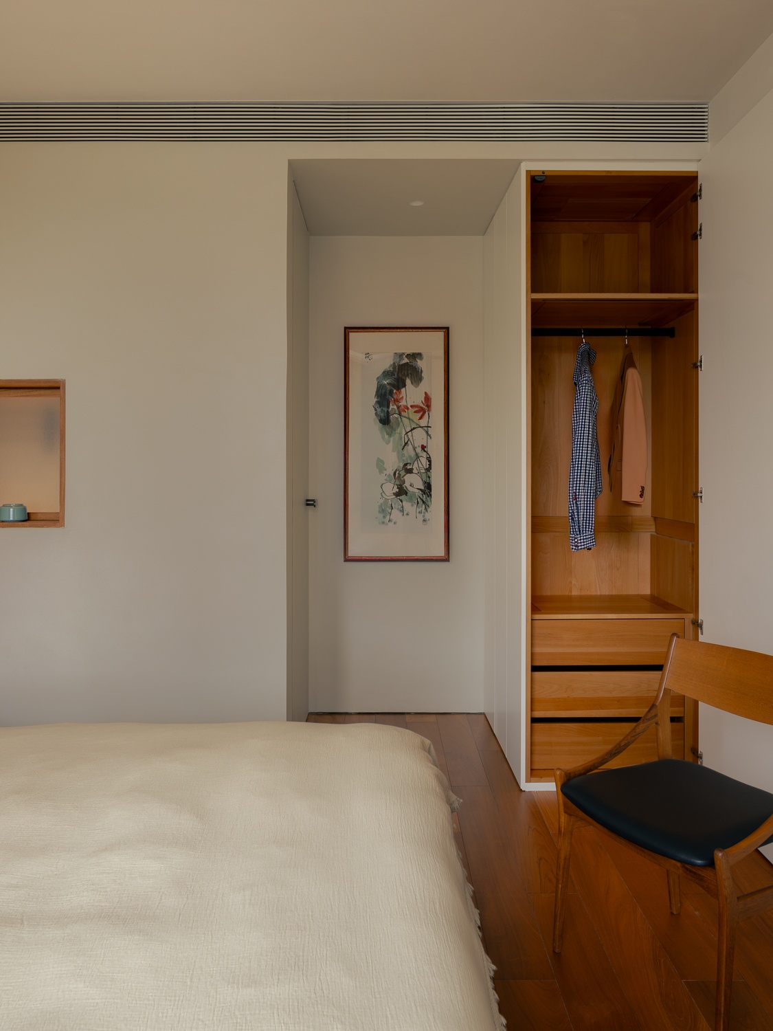 空间意境:拆除不必要的隔墙并对调厨房与餐厅空间位置后,我们得到了一个功能完整的厨房空间,一张具备储物功能与使用功能的中岛台,与一个明亮舒适的圆桌就餐区域。作为除客厅外的第二待客区,岛台成为家庭社交的枢纽,清晨的旭阳与夜晚朦胧的灯火在这里交替登场,在氤氲缭绕的烟火气里,展开一日又一日的生活日常。抽屉反复抽拉的痕迹,桌面浸染的印渍,座椅扶手被反复盘磨的光亮,布面磨损后毛绒绒的质感……这些不那么完美的印记记录着日常的点滴,如同为旧时光打下的补丁,代表着人与场景交互,并共同成长的过程。空间拒绝“完工即定格”的绝对性,柚木、亚麻、章子纸构成的材质矩阵,本质上是为时光准备的画布。那些从老宅中拆来的旧物,在新场景中焕然新生,如同生命的延续。重新装裱的旧画作,以不同的方式出现在新场景的空隙里,老瓷器仍然在角落里沉默,旧花器伴着张扬的枝丫熠熠生辉……在快消时代,这个空间却固执地保留着“未完成”状态,墙面的空白等待张贴,空置的桌面渐次丰盈,提前规划的储物为未来的日常做好准备……设计并没有用过多的装饰去填满空间,而是将悬念留给未来的日常,予其骨骼,待其血肉丰盈,如此,生活的常态被刻入空间的缝隙,场景也因此有了生命。封闭长辈房原有的入口后,自然打断过长的廊道设置,扩大内卫的使用空间。新入口自然嵌入起居厅背景墙,形成“隐于市”的入室仪式,靠近客厅落地窗的位置也让每一次进入私人空间的过程,更具可欣赏的美感。当设计褪去所有表演性的修辞,裸露出的本质是对生活本真的敬畏。这里的每一道木纹都在等待掌温的浸润,每寸墙面都预留了记忆的挂钩,那些被精心计算的收纳系统和看似随意的旧物陈列,共同编织成一张柔软的网,接住所有向下沉淀的时光。