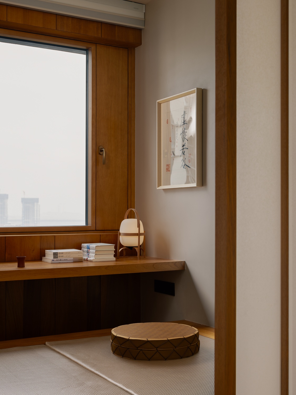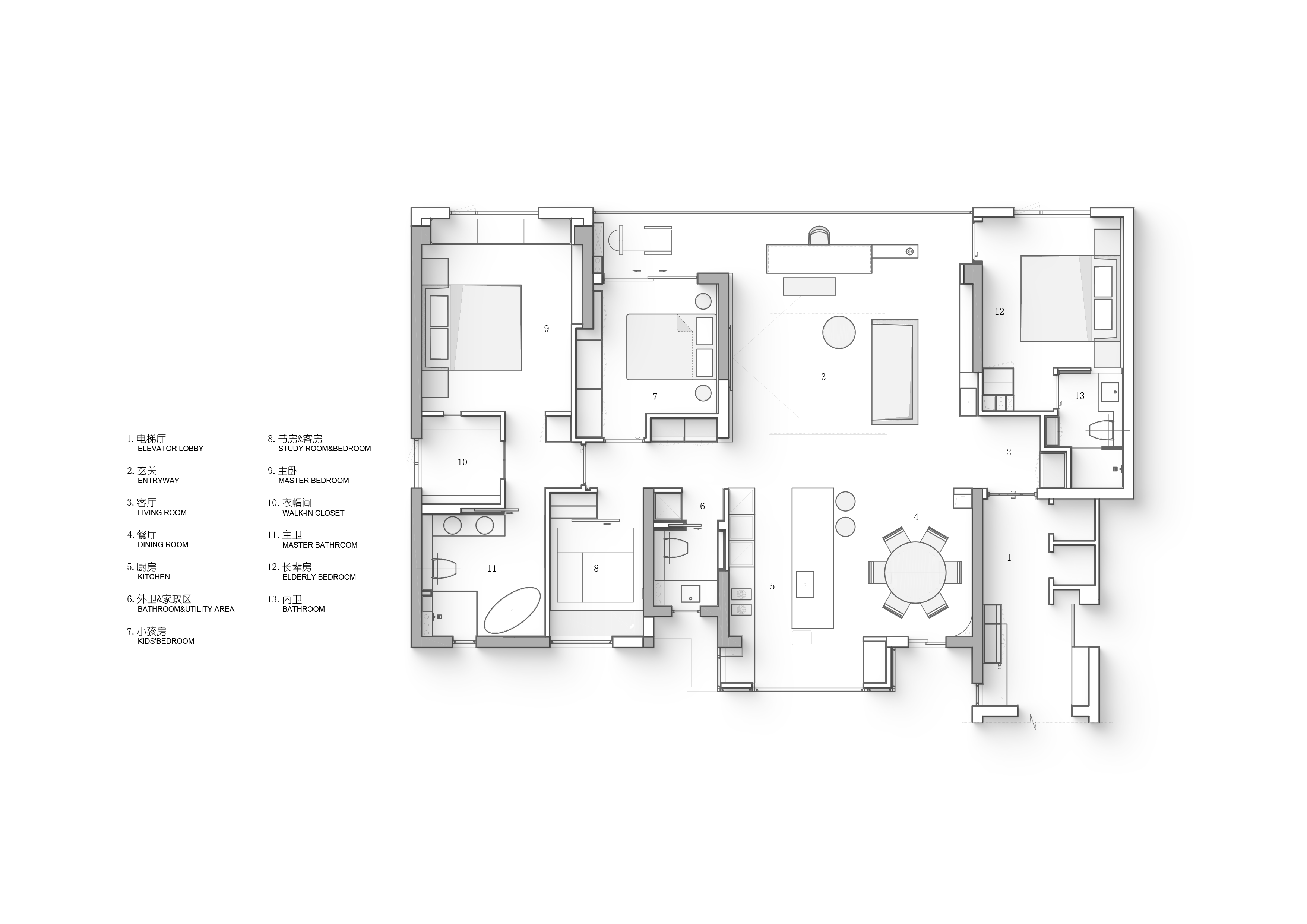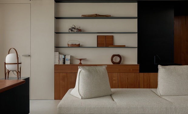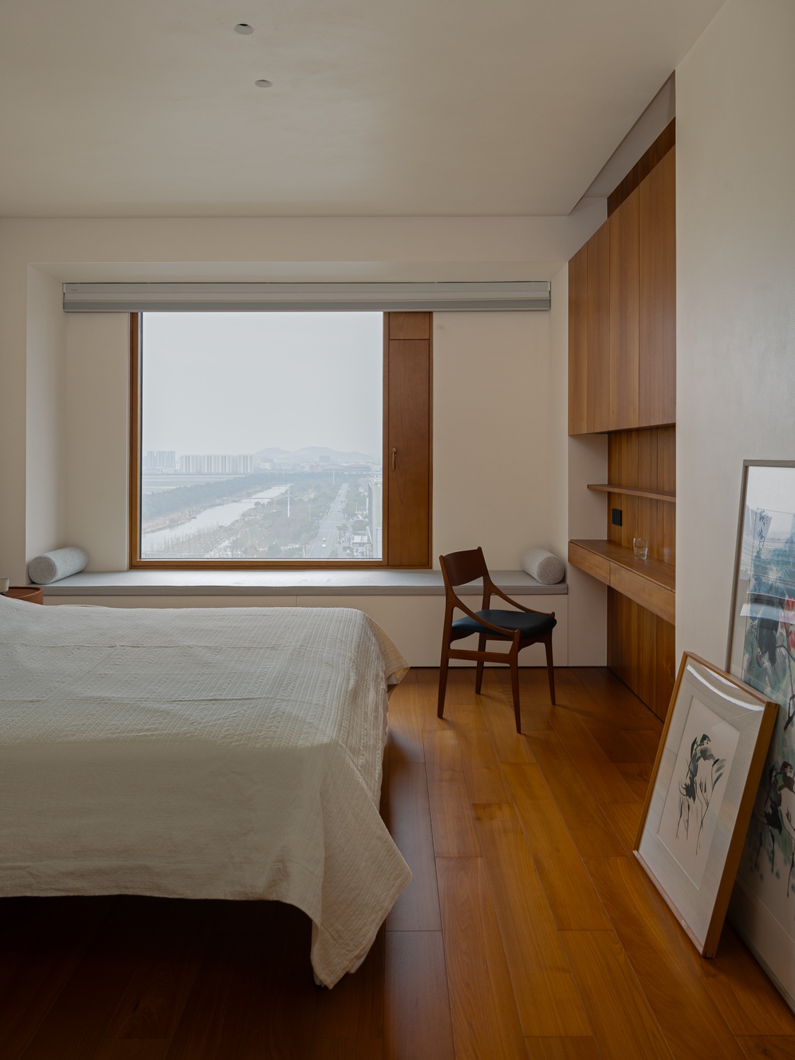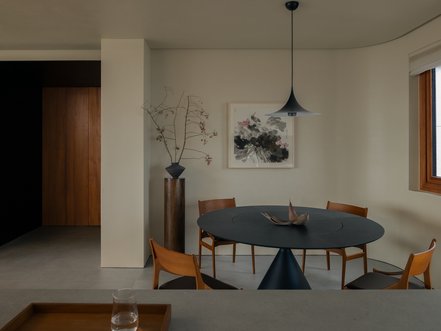 空间意境:拆除不必要的隔墙并对调厨房与餐厅空间位置后,我们得到了一个功能完整的厨房空间,一张具备储物功能与使用功能的中岛台,与一个明亮舒适的圆桌就餐区域。作为除客厅外的第二待客区,岛台成为家庭社交的枢纽,清晨的旭阳与夜晚朦胧的灯火在这里交替登场,在氤氲缭绕的烟火气里,展开一日又一日的生活日常。抽屉反复抽拉的痕迹,桌面浸染的印渍,座椅扶手被反复盘磨的光亮,布面磨损后毛绒绒的质感……这些不那么完美的印记记录着日常的点滴,如同为旧时光打下的补丁,代表着人与场景交互,并共同成长的过程。空间拒绝“完工即定格”的绝对性,柚木、亚麻、章子纸构成的材质矩阵,本质上是为时光准备的画布。那些从老宅中拆来的旧物,在新场景中焕然新生,如同生命的延续。重新装裱的旧画作,以不同的方式出现在新场景的空隙里,老瓷器仍然在角落里沉默,旧花器伴着张扬的枝丫熠熠生辉……在快消时代,这个空间却固执地保留着“未完成”状态,墙面的空白等待张贴,空置的桌面渐次丰盈,提前规划的储物为未来的日常做好准备……设计并没有用过多的装饰去填满空间,而是将悬念留给未来的日常,予其骨骼,待其血肉丰盈,如此,生活的常态被刻入空间的缝隙,场景也因此有了生命。封闭长辈房原有的入口后,自然打断过长的廊道设置,扩大内卫的使用空间。新入口自然嵌入起居厅背景墙,形成“隐于市”的入室仪式,靠近客厅落地窗的位置也让每一次进入私人空间的过程,更具可欣赏的美感。当设计褪去所有表演性的修辞,裸露出的本质是对生活本真的敬畏。这里的每一道木纹都在等待掌温的浸润,每寸墙面都预留了记忆的挂钩,那些被精心计算的收纳系统和看似随意的旧物陈列,共同编织成一张柔软的网,接住所有向下沉淀的时光。