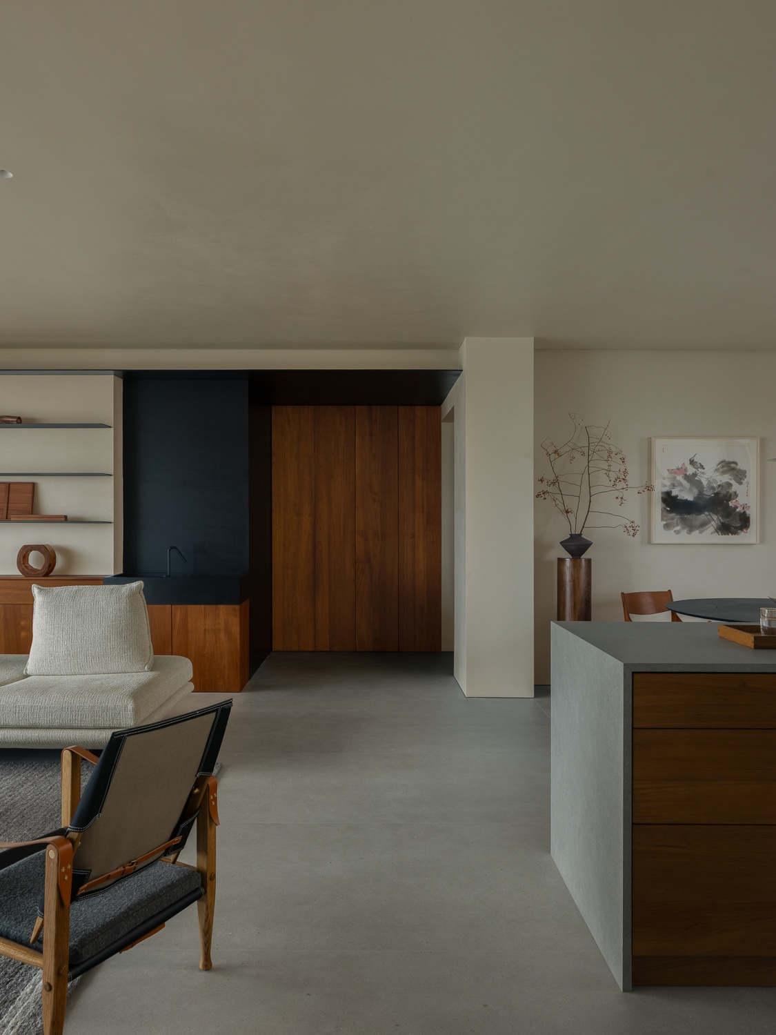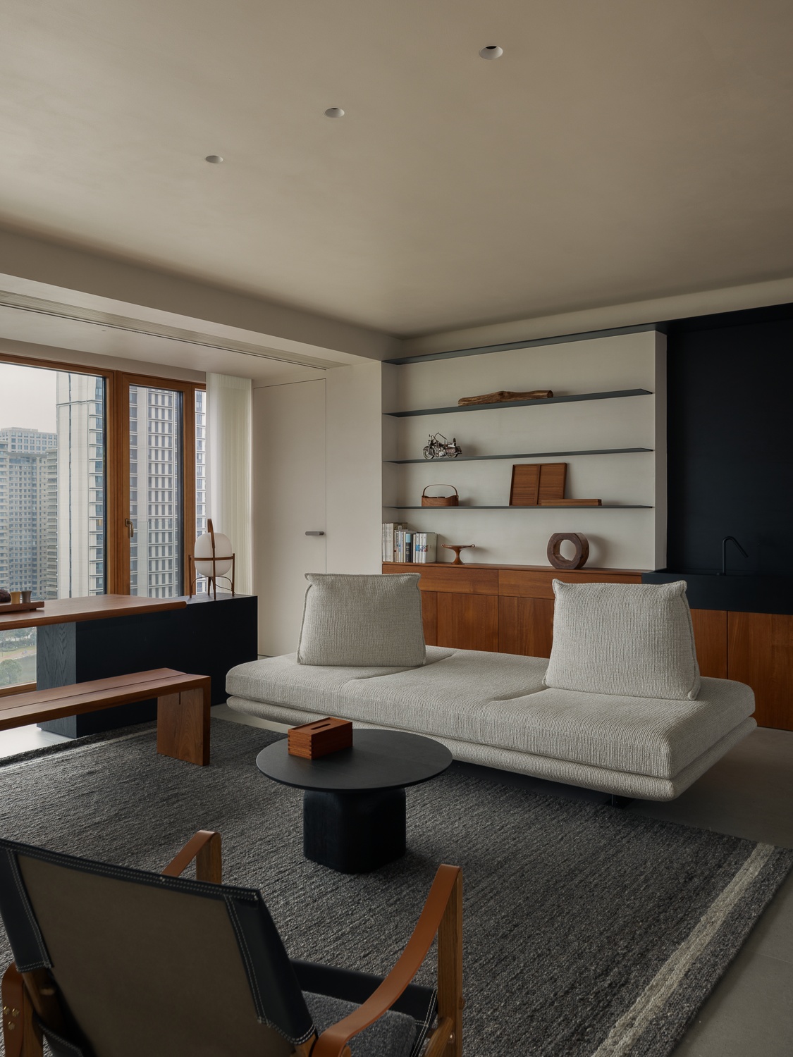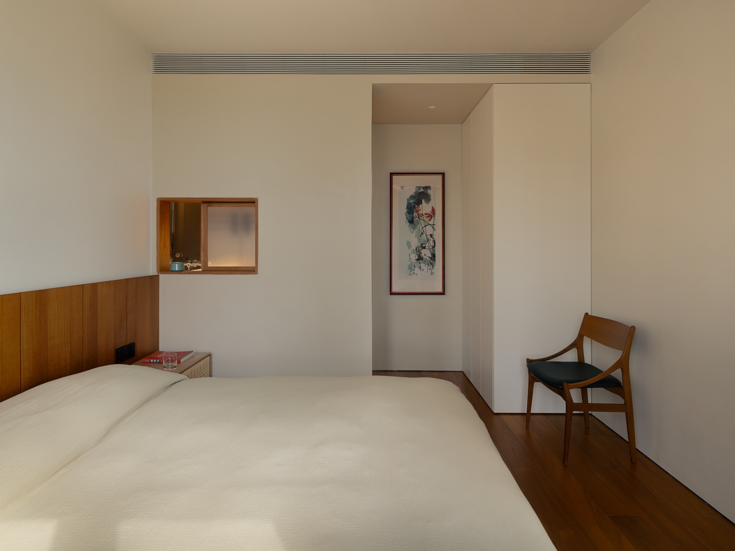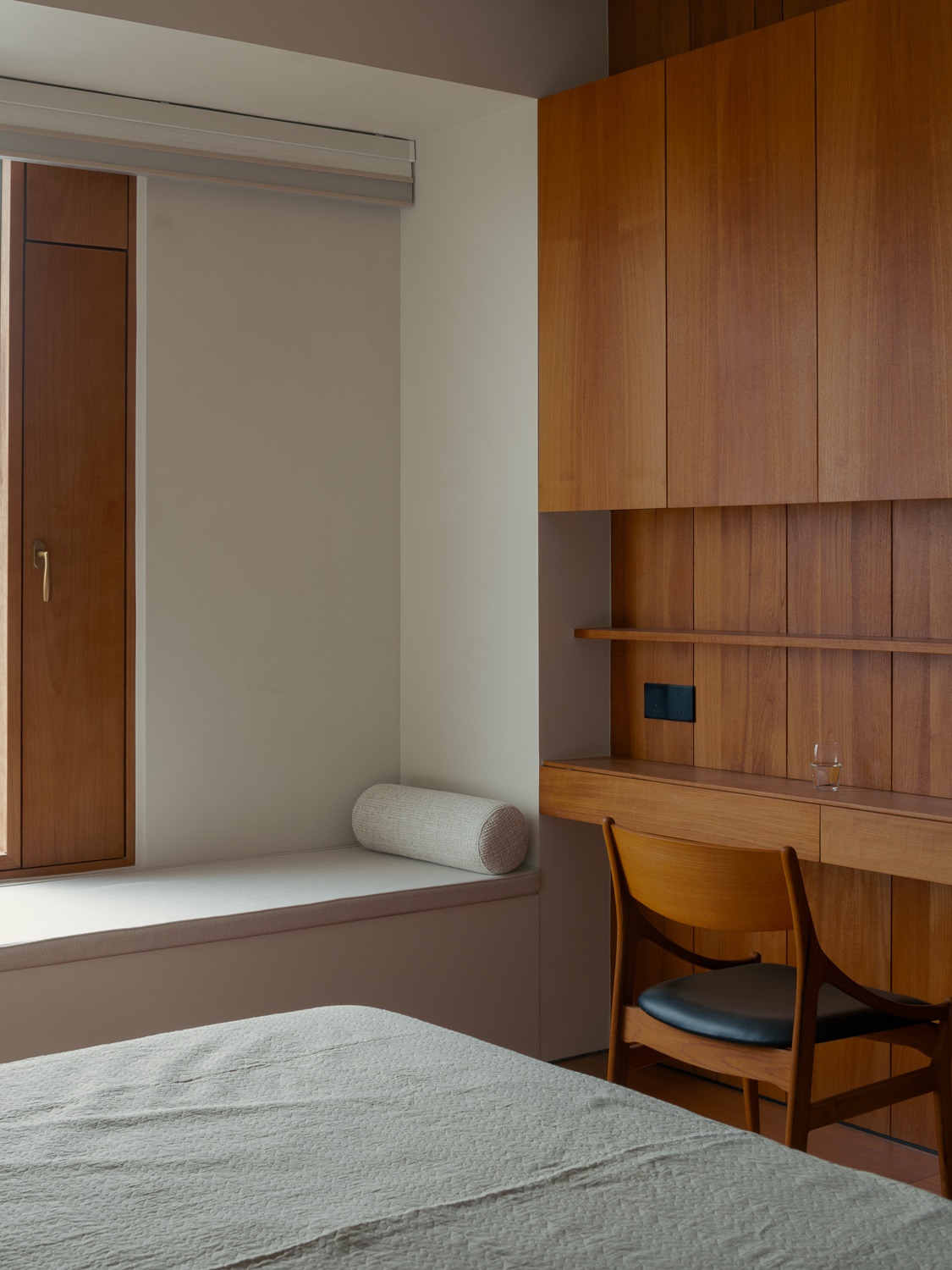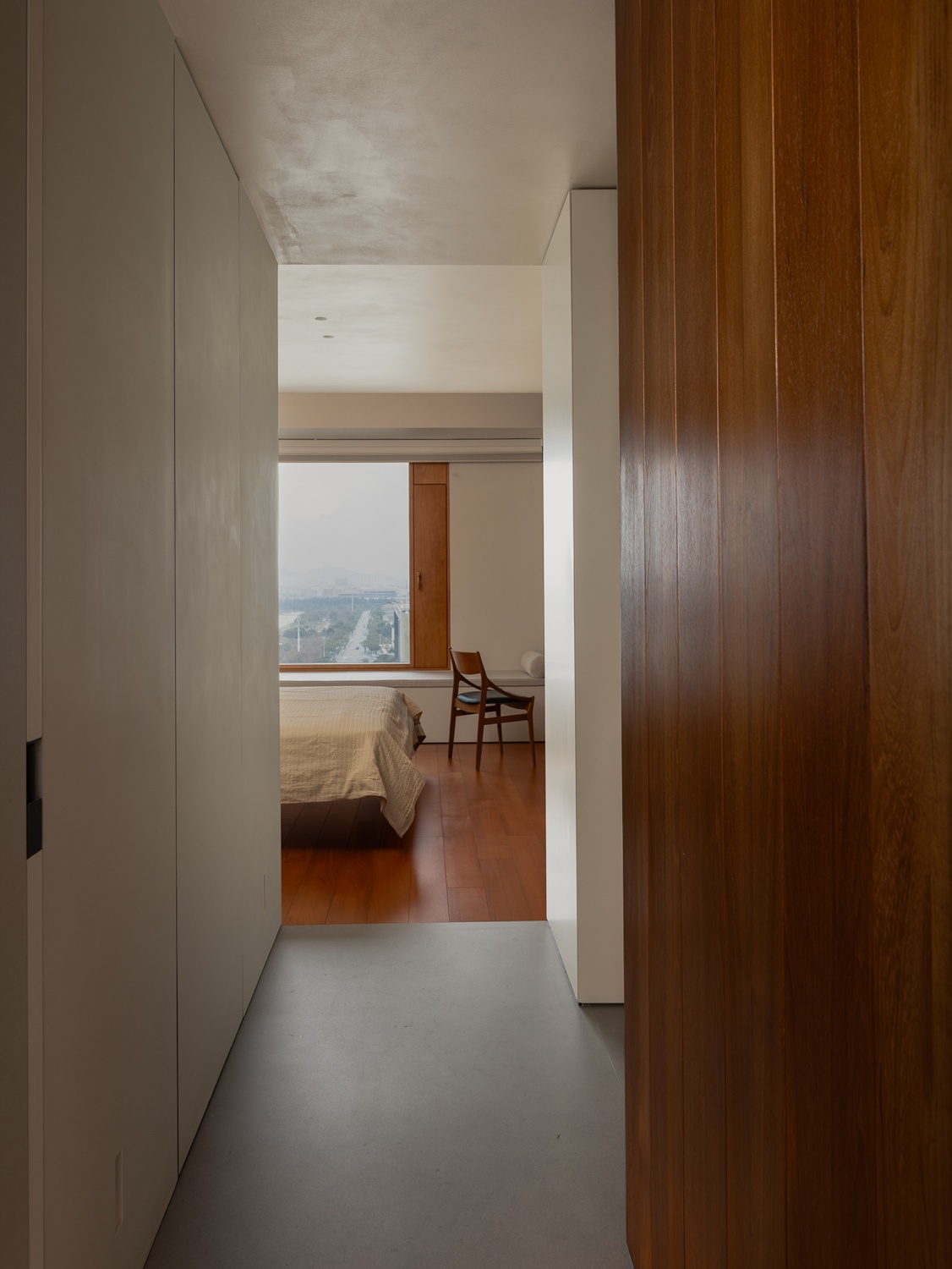 空间意境:拆除不必要的隔墙并对调厨房与餐厅空间位置后,我们得到了一个功能完整的厨房空间,一张具备储物功能与使用功能的中岛台,与一个明亮舒适的圆桌就餐区域。作为除客厅外的第二待客区,岛台成为家庭社交的枢纽,清晨的旭阳与夜晚朦胧的灯火在这里交替登场,在氤氲缭绕的烟火气里,展开一日又一日的生活日常。抽屉反复抽拉的痕迹,桌面浸染的印渍,座椅扶手被反复盘磨的光亮,布面磨损后毛绒绒的质感……这些不那么完美的印记记录着日常的点滴,如同为旧时光打下的补丁,代表着人与场景交互,并共同成长的过程。空间拒绝“完工即定格”的绝对性,柚木、亚麻、章子纸构成的材质矩阵,本质上是为时光准备的画布。那些从老宅中拆来的旧物,在新场景中焕然新生,如同生命的延续。重新装裱的旧画作,以不同的方式出现在新场景的空隙里,老瓷器仍然在角落里沉默,旧花器伴着张扬的枝丫熠熠生辉……在快消时代,这个空间却固执地保留着“未完成”状态,墙面的空白等待张贴,空置的桌面渐次丰盈,提前规划的储物为未来的日常做好准备……设计并没有用过多的装饰去填满空间,而是将悬念留给未来的日常,予其骨骼,待其血肉丰盈,如此,生活的常态被刻入空间的缝隙,场景也因此有了生命。封闭长辈房原有的入口后,自然打断过长的廊道设置,扩大内卫的使用空间。新入口自然嵌入起居厅背景墙,形成“隐于市”的入室仪式,靠近客厅落地窗的位置也让每一次进入私人空间的过程,更具可欣赏的美感。当设计褪去所有表演性的修辞,裸露出的本质是对生活本真的敬畏。这里的每一道木纹都在等待掌温的浸润,每寸墙面都预留了记忆的挂钩,那些被精心计算的收纳系统和看似随意的旧物陈列,共同编织成一张柔软的网,接住所有向下沉淀的时光。