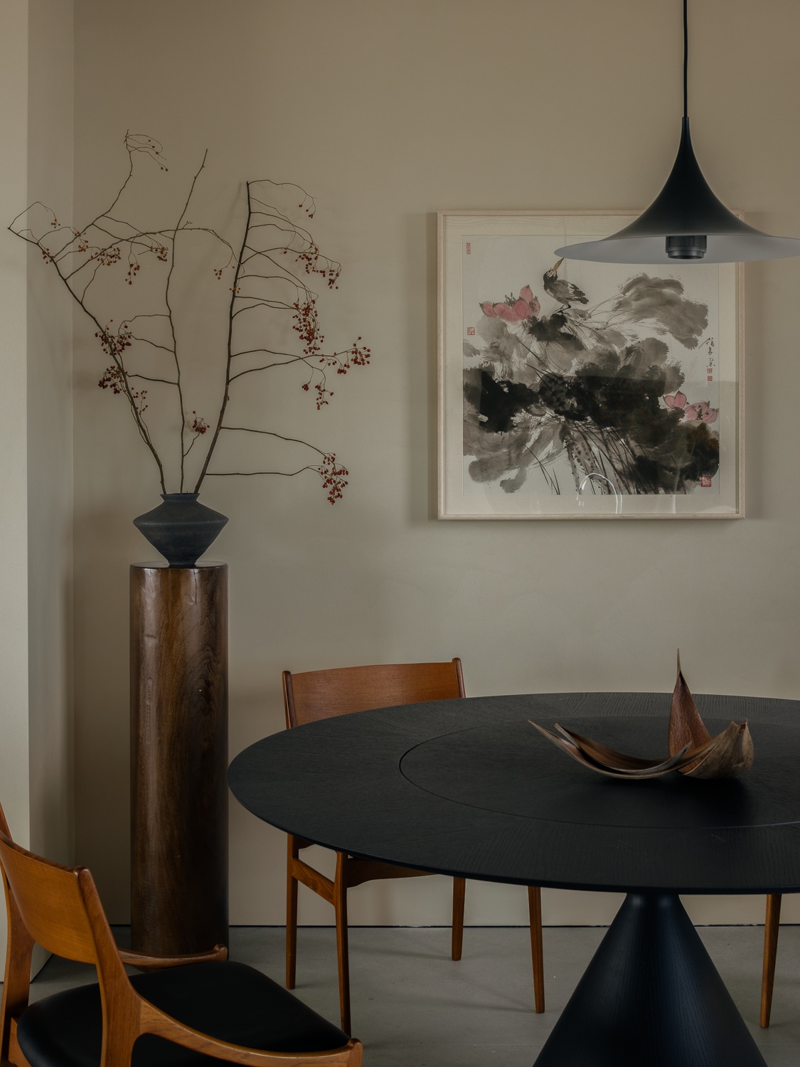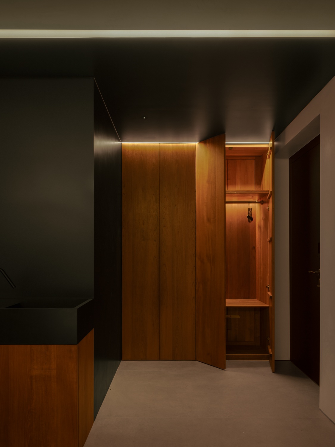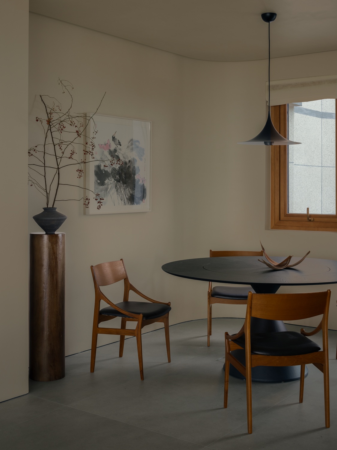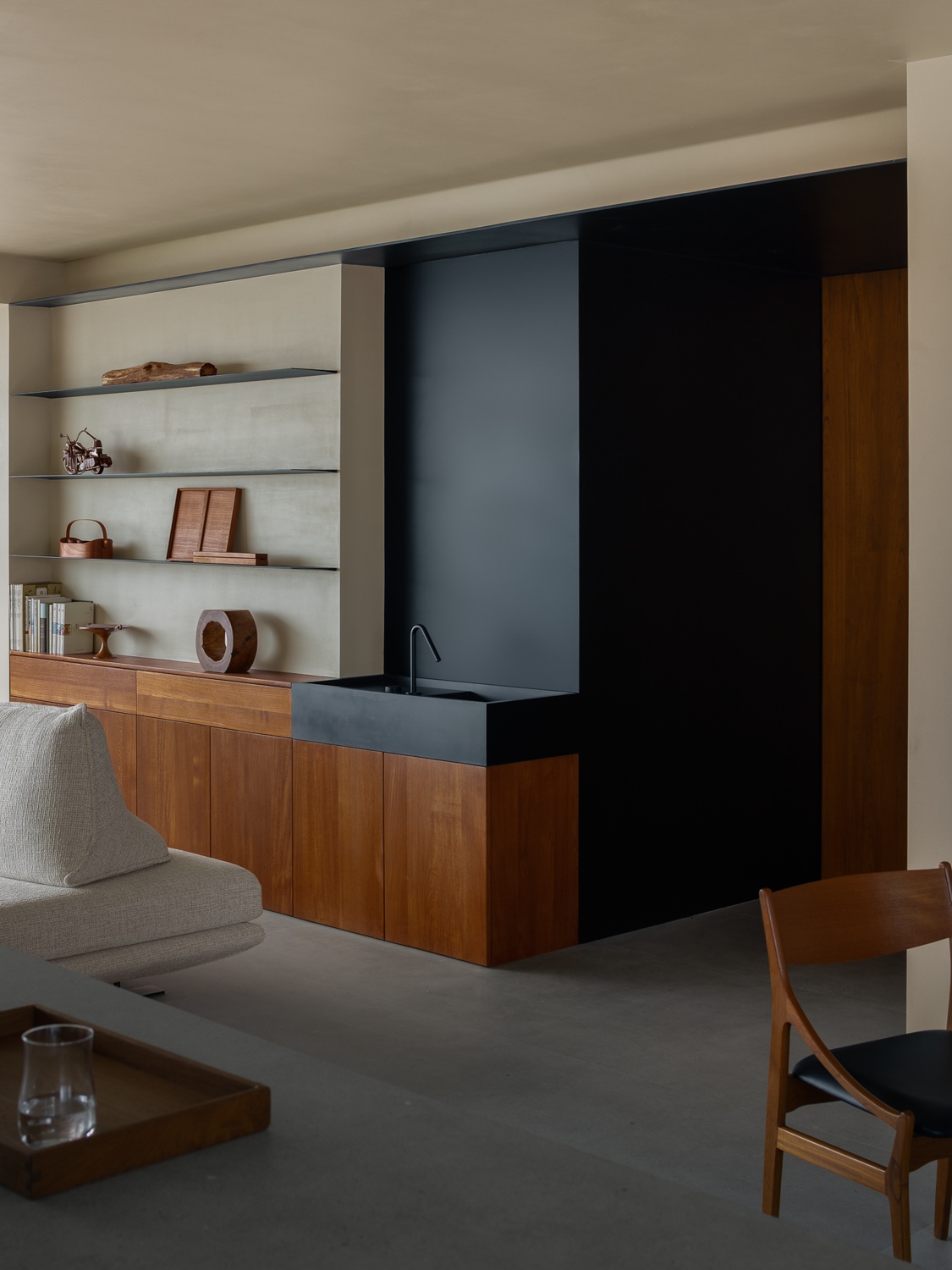 空间意境:拆除不必要的隔墙并对调厨房与餐厅空间位置后,我们得到了一个功能完整的厨房空间,一张具备储物功能与使用功能的中岛台,与一个明亮舒适的圆桌就餐区域。作为除客厅外的第二待客区,岛台成为家庭社交的枢纽,清晨的旭阳与夜晚朦胧的灯火在这里交替登场,在氤氲缭绕的烟火气里,展开一日又一日的生活日常。抽屉反复抽拉的痕迹,桌面浸染的印渍,座椅扶手被反复盘磨的光亮,布面磨损后毛绒绒的质感……这些不那么完美的印记记录着日常的点滴,如同为旧时光打下的补丁,代表着人与场景交互,并共同成长的过程。空间拒绝“完工即定格”的绝对性,柚木、亚麻、章子纸构成的材质矩阵,本质上是为时光准备的画布。那些从老宅中拆来的旧物,在新场景中焕然新生,如同生命的延续。重新装裱的旧画作,以不同的方式出现在新场景的空隙里,老瓷器仍然在角落里沉默,旧花器伴着张扬的枝丫熠熠生辉……在快消时代,这个空间却固执地保留着“未完成”状态,墙面的空白等待张贴,空置的桌面渐次丰盈,提前规划的储物为未来的日常做好准备……设计并没有用过多的装饰去填满空间,而是将悬念留给未来的日常,予其骨骼,待其血肉丰盈,如此,生活的常态被刻入空间的缝隙,场景也因此有了生命。封闭长辈房原有的入口后,自然打断过长的廊道设置,扩大内卫的使用空间。新入口自然嵌入起居厅背景墙,形成“隐于市”的入室仪式,靠近客厅落地窗的位置也让每一次进入私人空间的过程,更具可欣赏的美感。当设计褪去所有表演性的修辞,裸露出的本质是对生活本真的敬畏。这里的每一道木纹都在等待掌温的浸润,每寸墙面都预留了记忆的挂钩,那些被精心计算的收纳系统和看似随意的旧物陈列,共同编织成一张柔软的网,接住所有向下沉淀的时光。