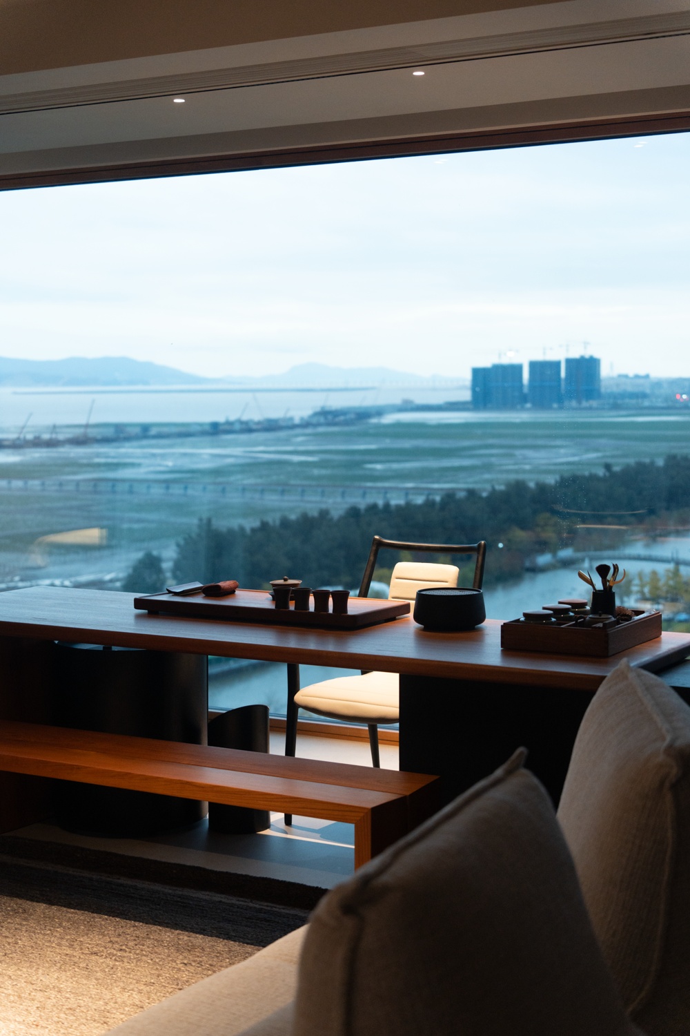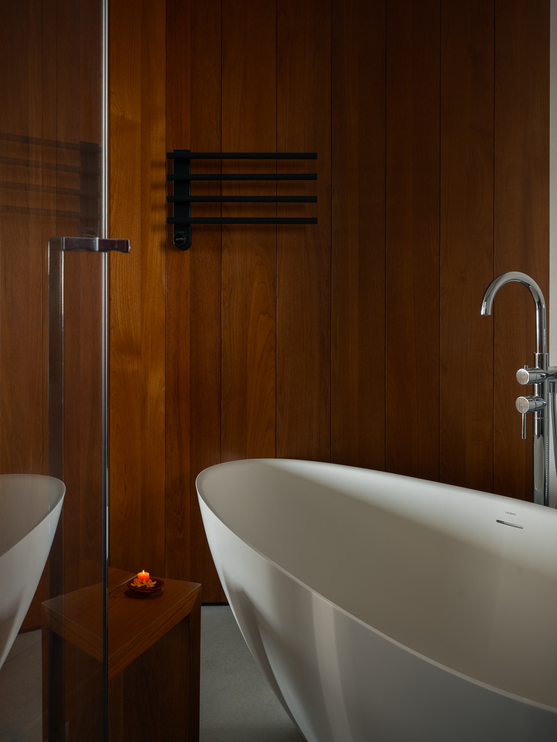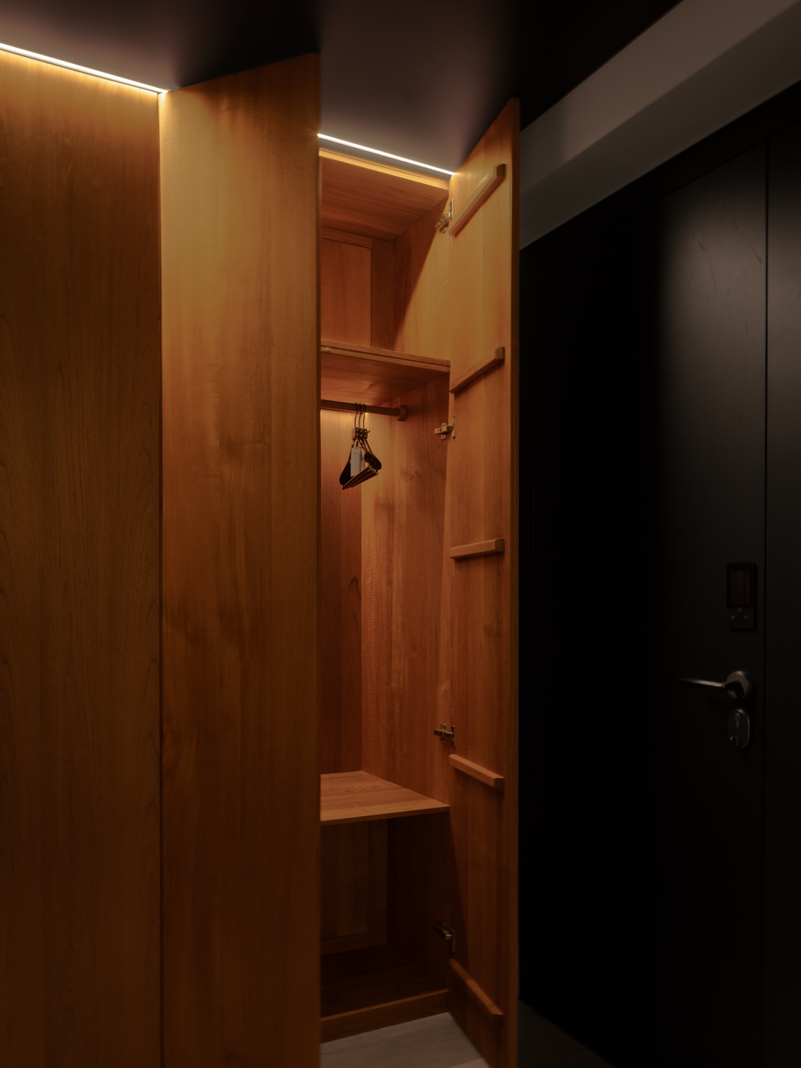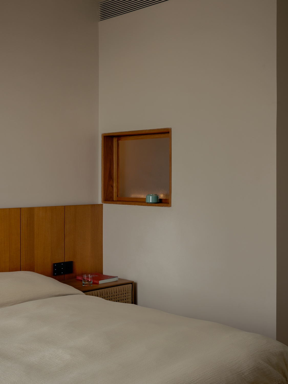 空间意境:拆除不必要的隔墙并对调厨房与餐厅空间位置后,我们得到了一个功能完整的厨房空间,一张具备储物功能与使用功能的中岛台,与一个明亮舒适的圆桌就餐区域。作为除客厅外的第二待客区,岛台成为家庭社交的枢纽,清晨的旭阳与夜晚朦胧的灯火在这里交替登场,在氤氲缭绕的烟火气里,展开一日又一日的生活日常。抽屉反复抽拉的痕迹,桌面浸染的印渍,座椅扶手被反复盘磨的光亮,布面磨损后毛绒绒的质感……这些不那么完美的印记记录着日常的点滴,如同为旧时光打下的补丁,代表着人与场景交互,并共同成长的过程。空间拒绝“完工即定格”的绝对性,柚木、亚麻、章子纸构成的材质矩阵,本质上是为时光准备的画布。那些从老宅中拆来的旧物,在新场景中焕然新生,如同生命的延续。重新装裱的旧画作,以不同的方式出现在新场景的空隙里,老瓷器仍然在角落里沉默,旧花器伴着张扬的枝丫熠熠生辉……在快消时代,这个空间却固执地保留着“未完成”状态,墙面的空白等待张贴,空置的桌面渐次丰盈,提前规划的储物为未来的日常做好准备……设计并没有用过多的装饰去填满空间,而是将悬念留给未来的日常,予其骨骼,待其血肉丰盈,如此,生活的常态被刻入空间的缝隙,场景也因此有了生命。封闭长辈房原有的入口后,自然打断过长的廊道设置,扩大内卫的使用空间。新入口自然嵌入起居厅背景墙,形成“隐于市”的入室仪式,靠近客厅落地窗的位置也让每一次进入私人空间的过程,更具可欣赏的美感。当设计褪去所有表演性的修辞,裸露出的本质是对生活本真的敬畏。这里的每一道木纹都在等待掌温的浸润,每寸墙面都预留了记忆的挂钩,那些被精心计算的收纳系统和看似随意的旧物陈列,共同编织成一张柔软的网,接住所有向下沉淀的时光。