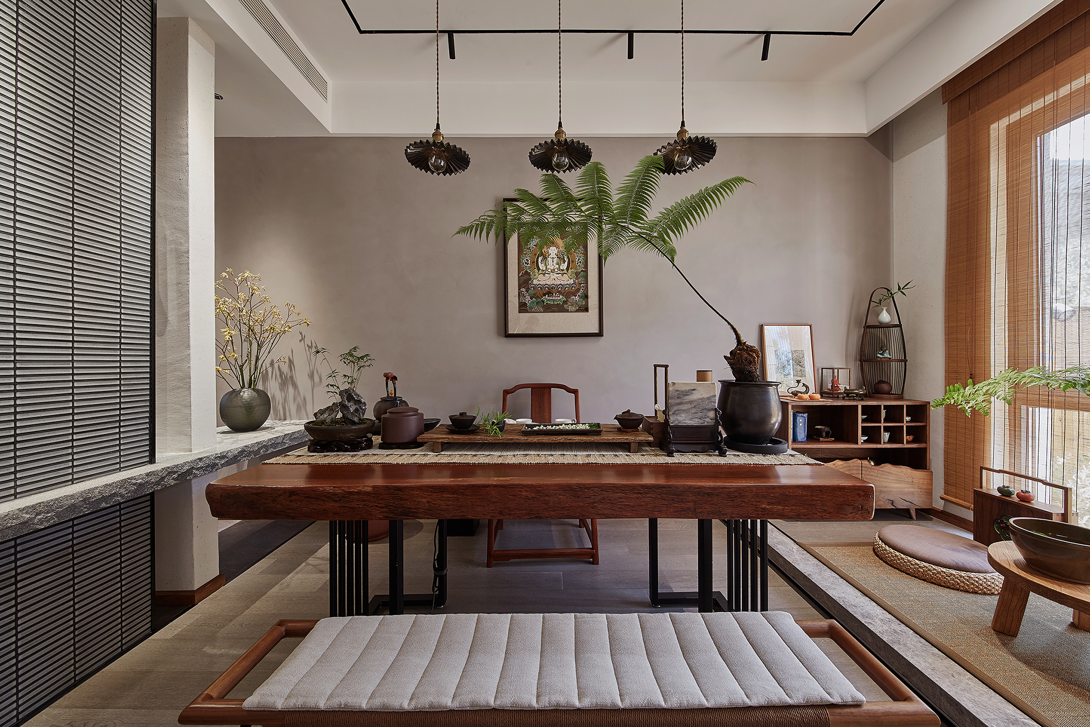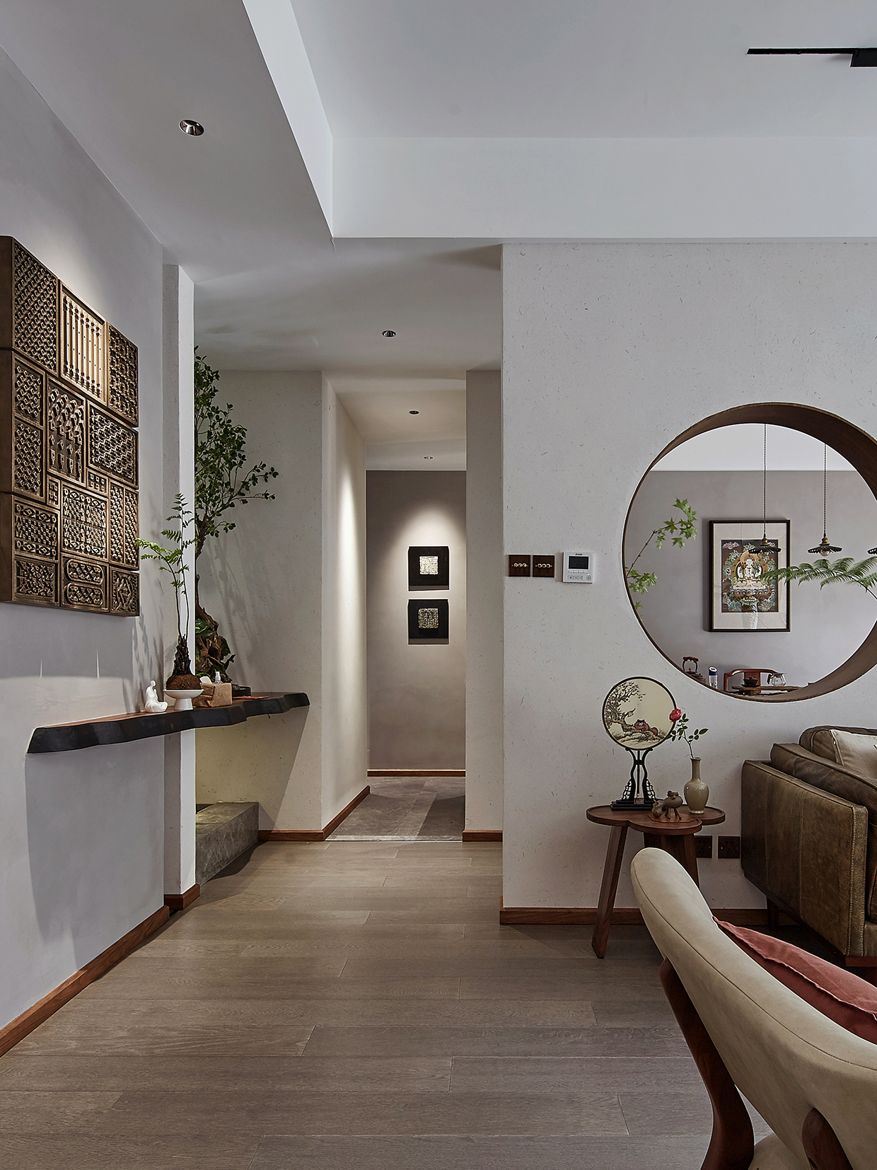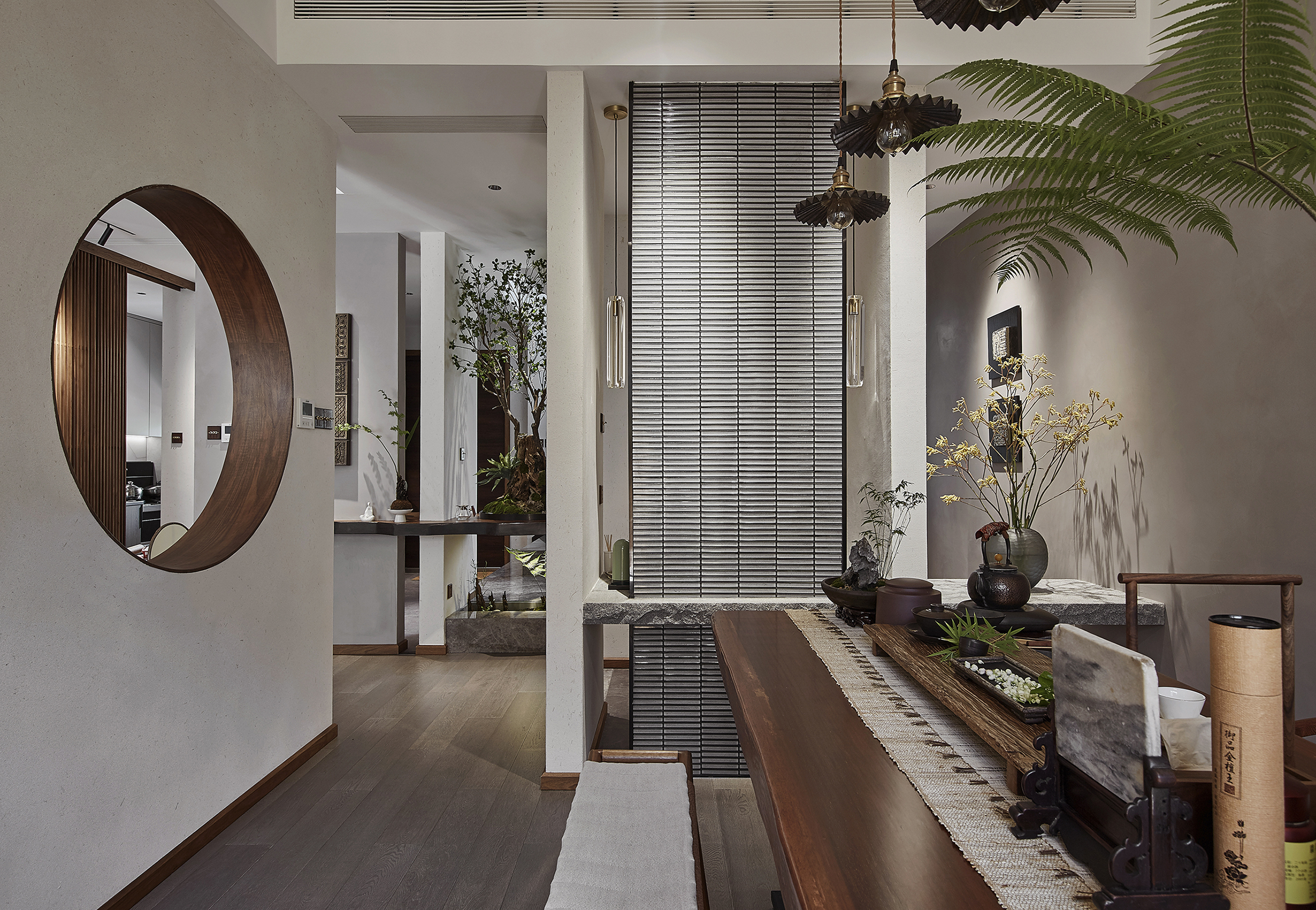 客厅沙发背墙圆形框洞的预留,既借鉴了中式园林的手法,又将茶室的景致框置其中,在不同的视角上框住的景观也发生着动态的变化,情趣油然而生。