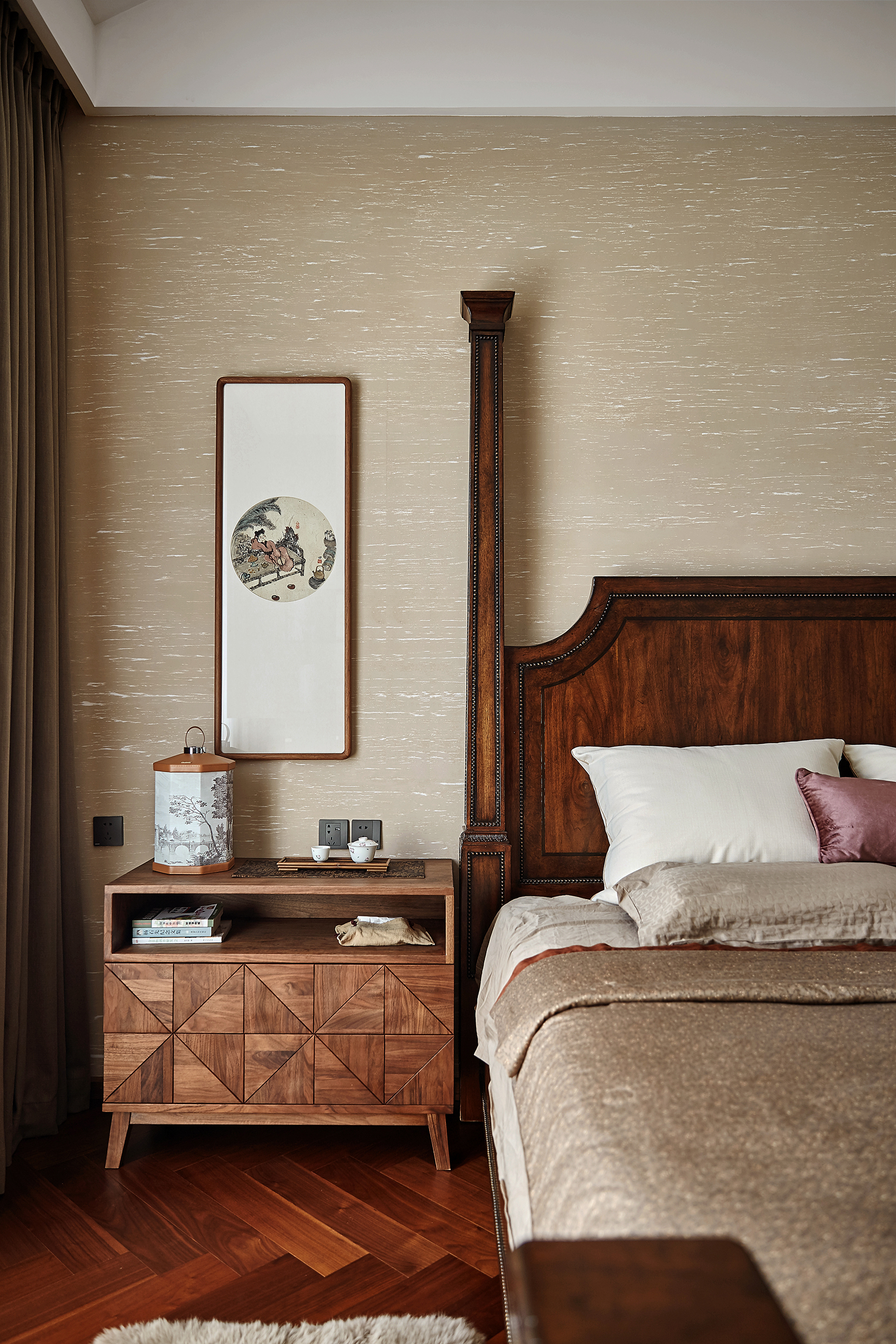 一直认为色彩是最佳的融合剂。 任何时代、任何地域、任何风格的物件,在恰当的色彩下均可协调融合起来。 形如夯土的墙面肌理,衬托出美式双柱床的硬朗。 土黄赋予空间厚重感,田午老师的丹青,采用宋式极简的装裱方式, 与沉稳的空间形成一个强烈的反差、对比,反倒成了空间唯一的点睛之笔。