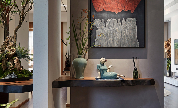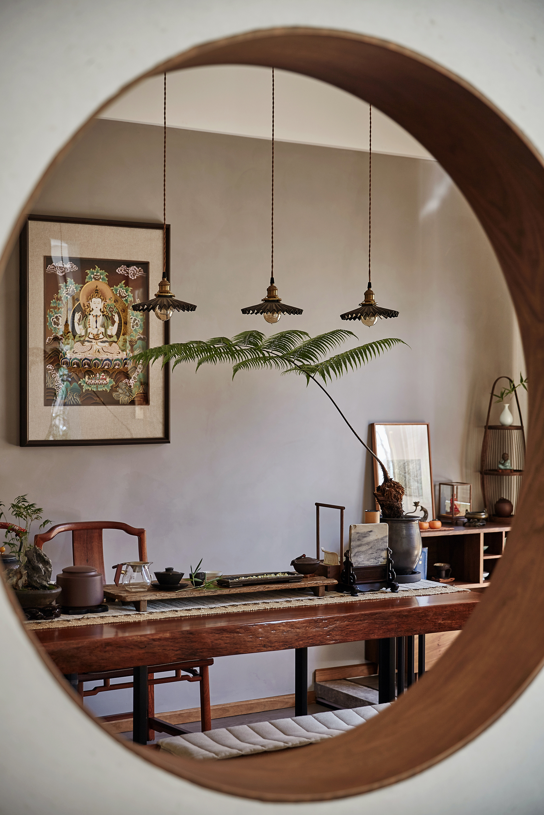在中国古典园林框景手法,景的构成有两种方式。一种是设框取景,一种是对景设框,在优美的景致对面设框,将美景收入景框内。这里即是运用了“对景设框”的手法,在圆形洞口对面,是一束挺翘的蕨类盆景;一杯茶、一本书、一幅画,足矣悦己;景外的人在观你,你在景框中观他,互为景中人,这是家的情趣。