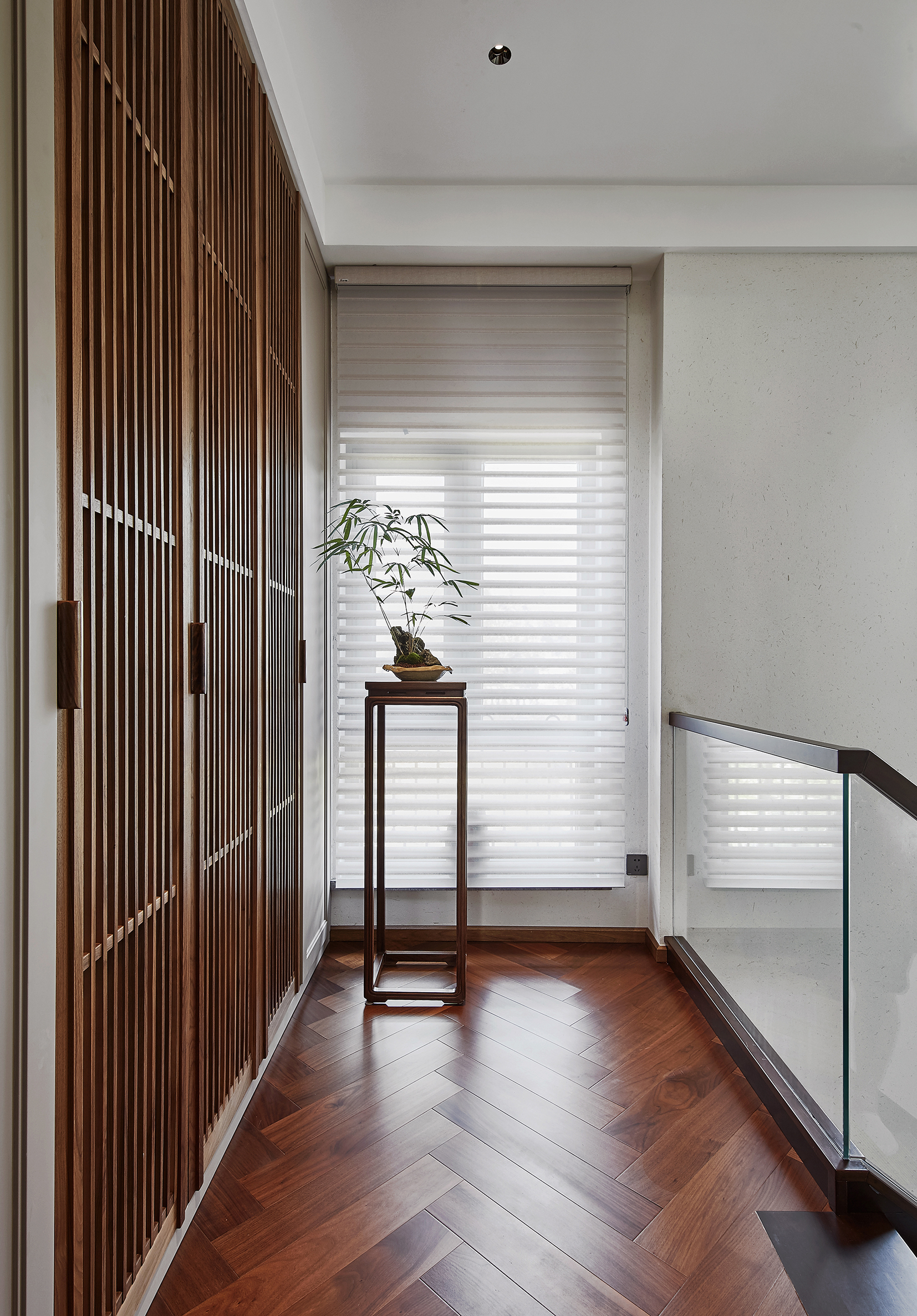 楼梯空间不大,但贵于采光佳;为了尽可能简化装饰元素,设计师采用透亮的白玻扶手。 半隐半透的香格里拉帘成了盆景的最佳装饰背景板。