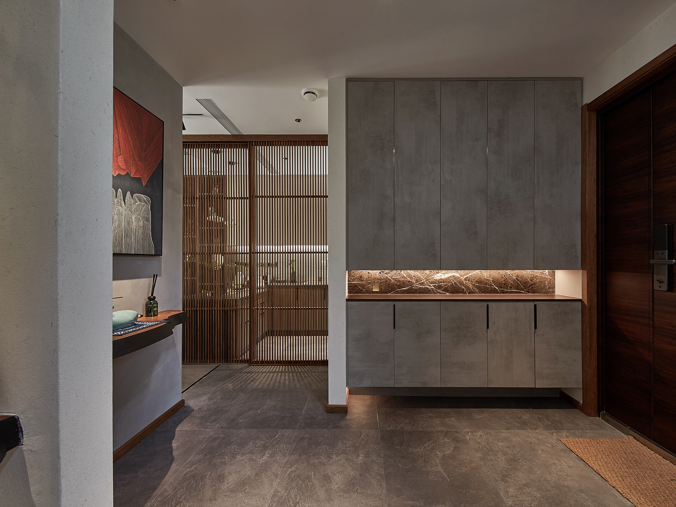增加玄关功能。 利用建筑的解构手法,增加一些虚实关系的隔断,使空间的层次得以提升,增加一些室内造景的可能性