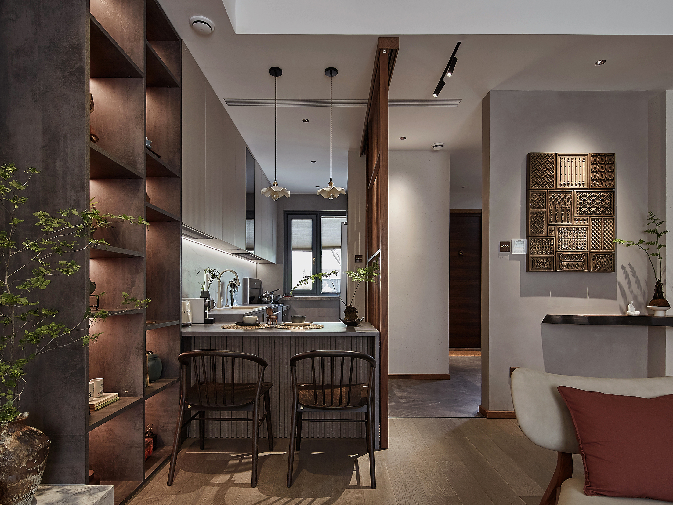 厨房虚实隔断门。 从玄关至室内入口,开放式厨房的入口用两扇中式格栅相隔,这样似隐似透的装饰手法可使厨房在门厅入口得以相对隐蔽地存在,又使空间增加一种虚实相间的视觉效果,增强了空间的美学欣赏价值。计成所著的《园冶》中提到,园林造景要“俗则屏之,嘉则收之”,这里正是借鉴中国古典园林的设计技巧,用隐透的格栅屏风化解了厨房直对门厅转角入口的尴尬。