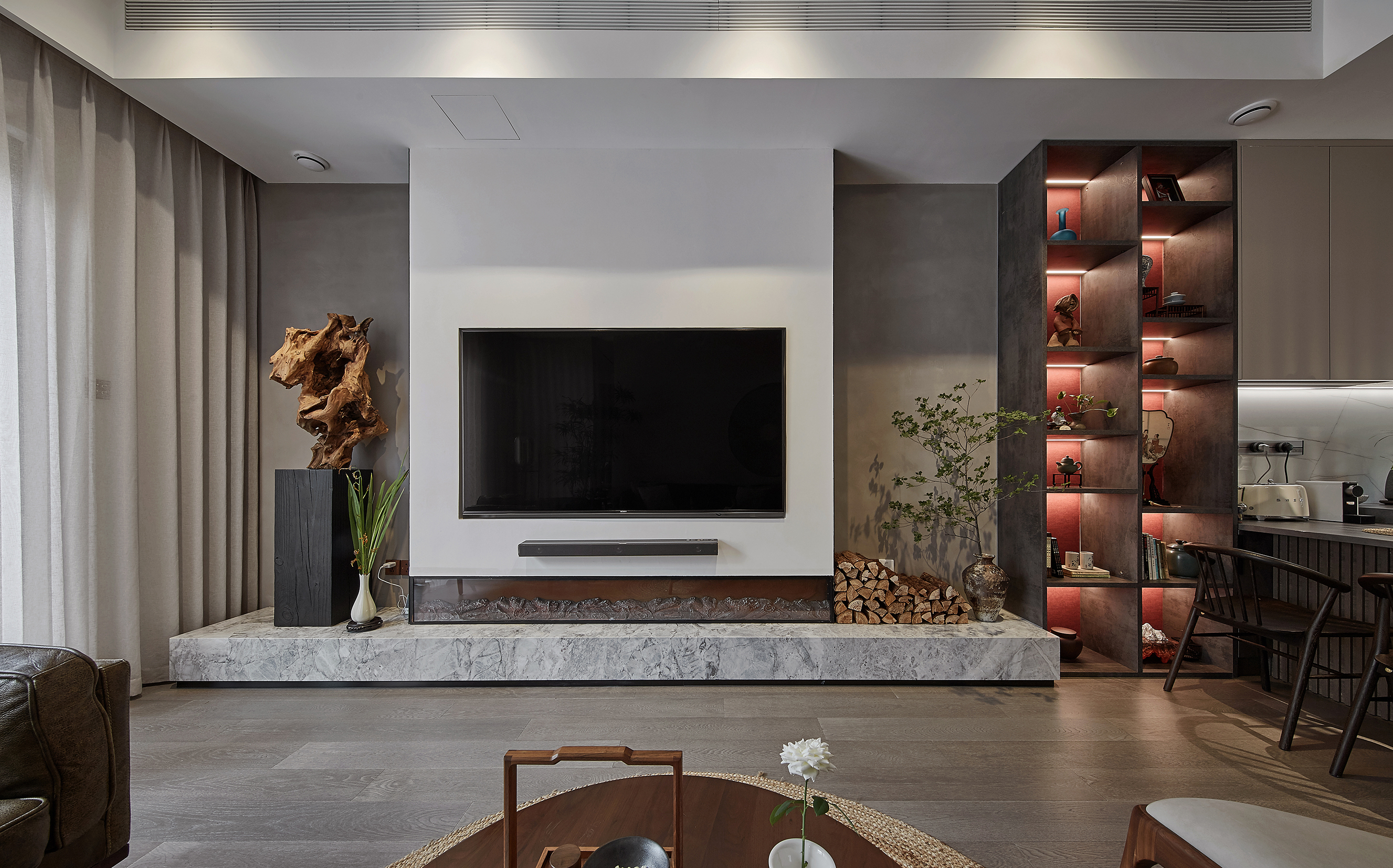 客厅电视墙功能排版组合,从南端延伸至建筑的北端,电视墙、西厨岛台、开放式厨房相互嵌合融于一体;除了严谨的美学尺度划分,尤为重要的是材质、比例的分配与考究。