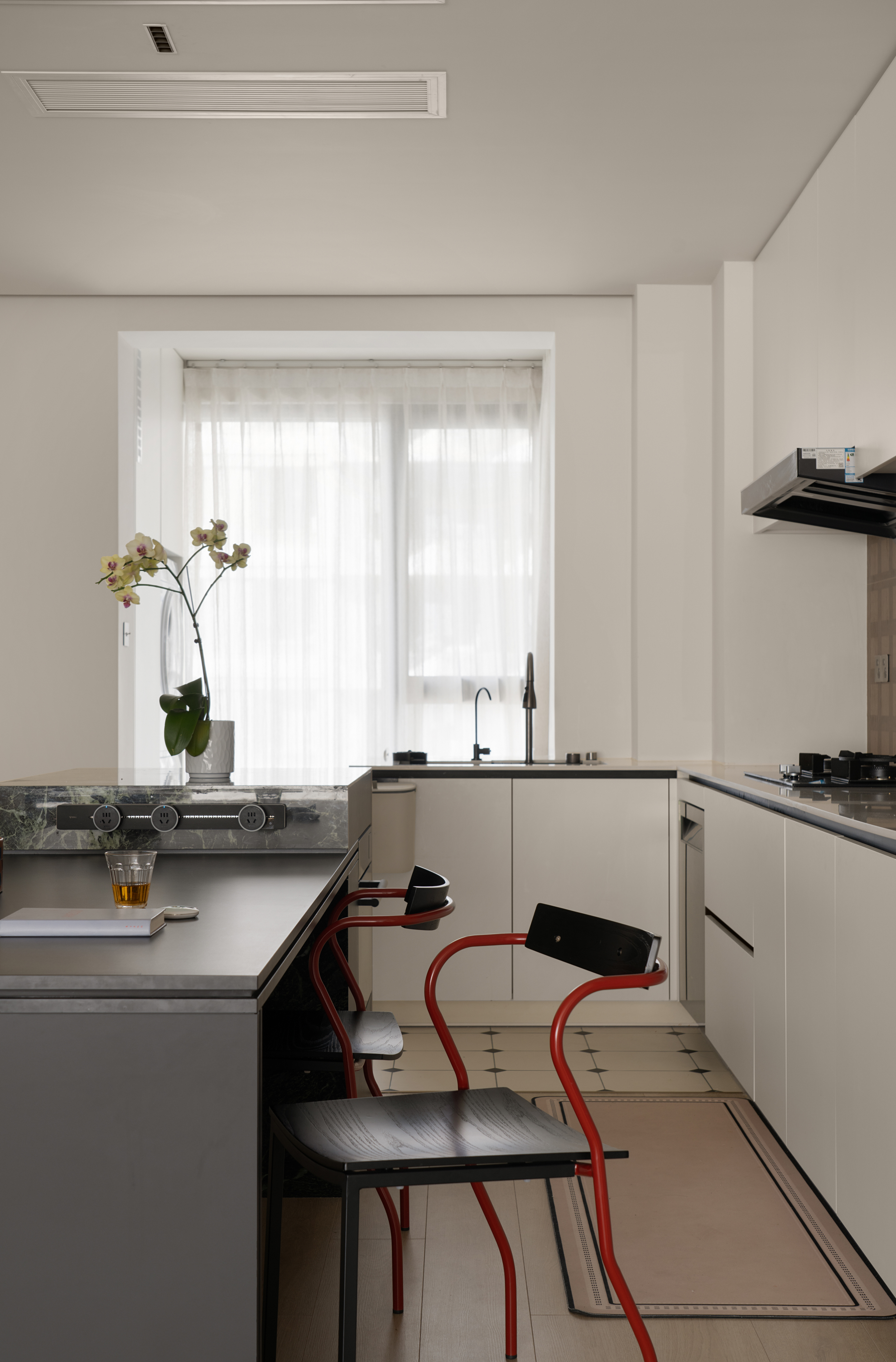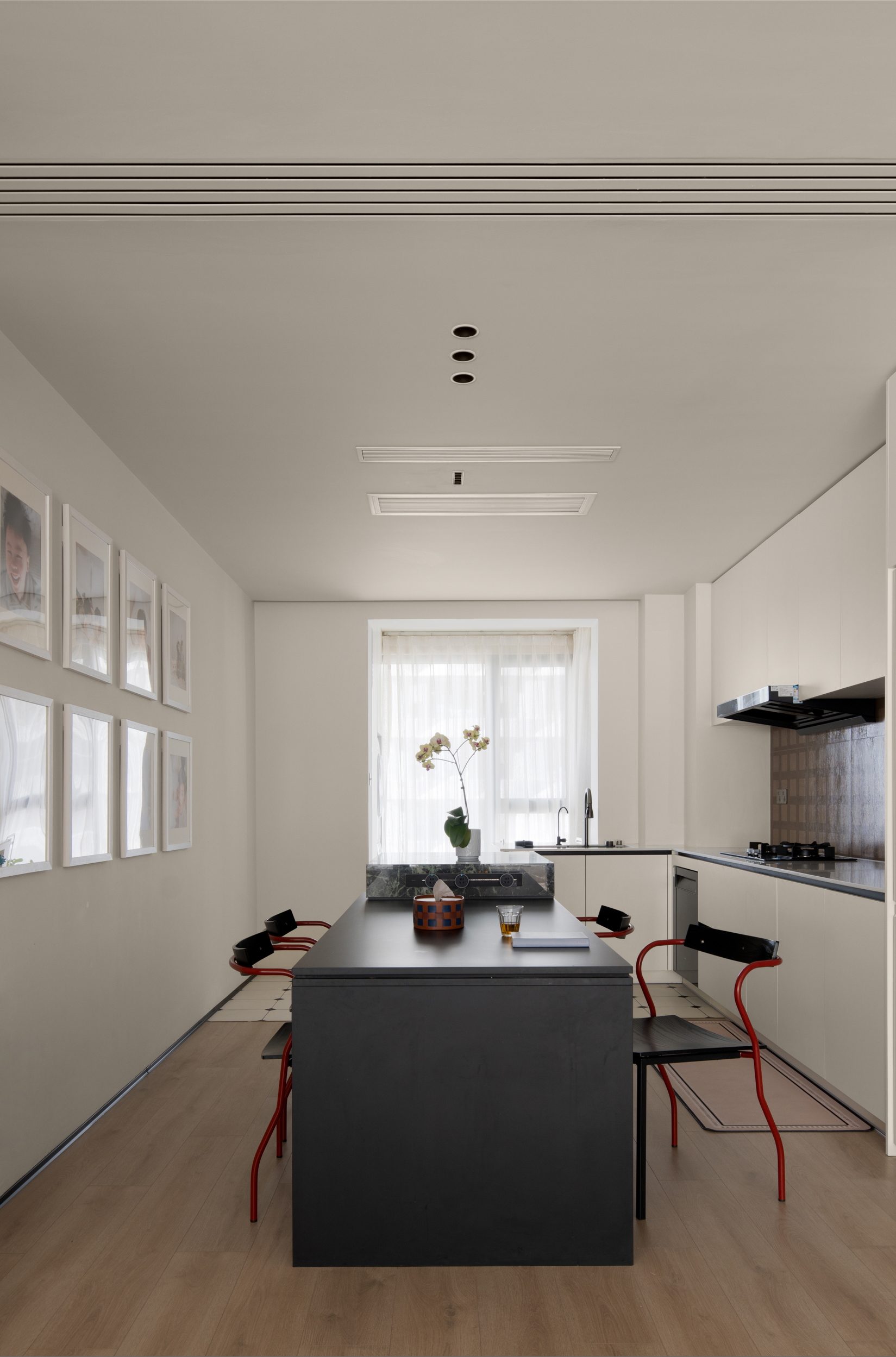 红色包豪斯餐桌椅成为段落间的逗号,哑光黑铁艺灯具划破留白的寂静,如同俳句中的「季语」——用色彩的断片唤醒空间韵律。中古柚木地板蜿蜒的纹理,则暗合陶渊明笔下「虚室有余闲」的东方留白哲学,让光线在明暗褶皱中书写时间的隐喻。 -