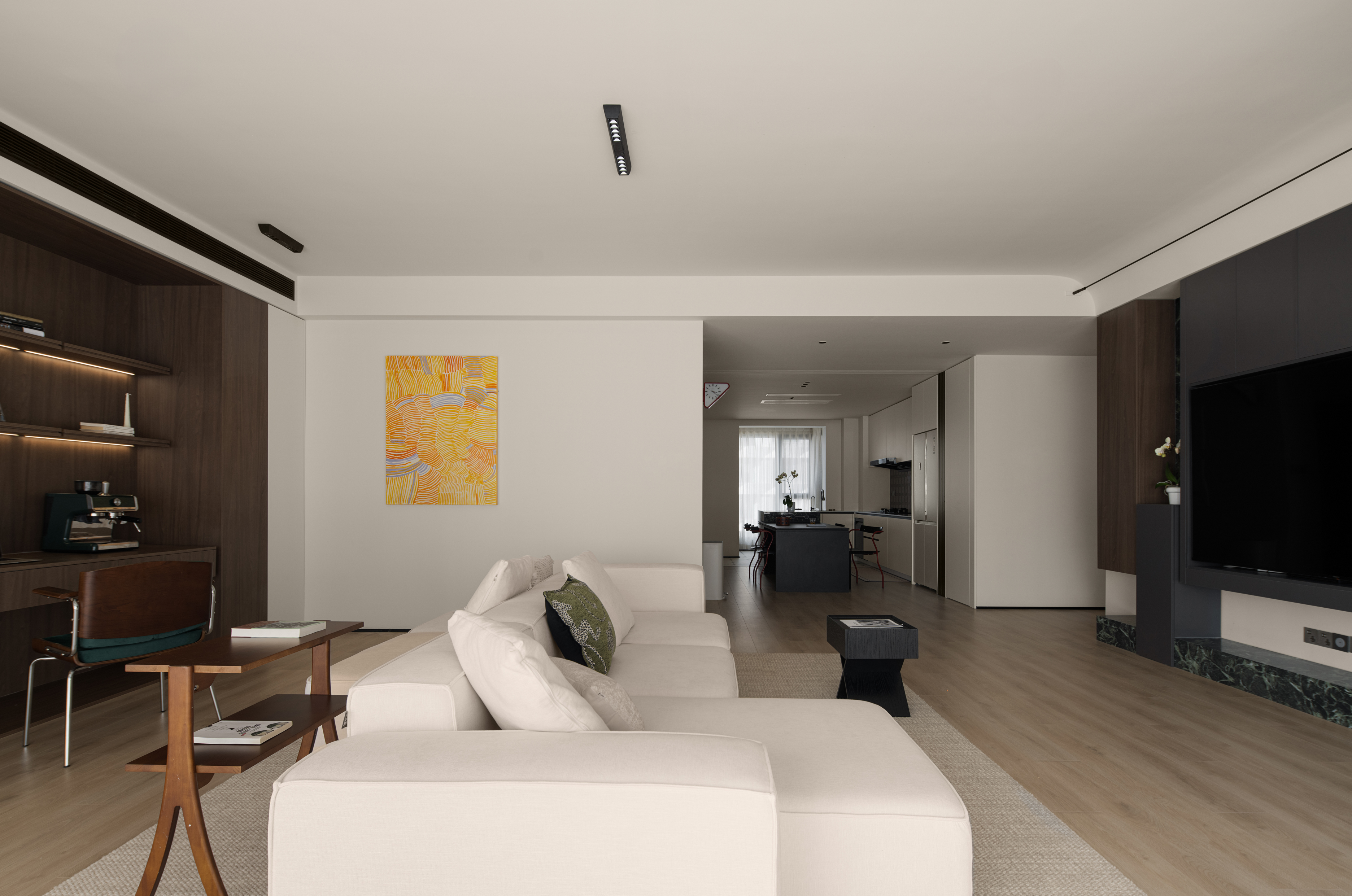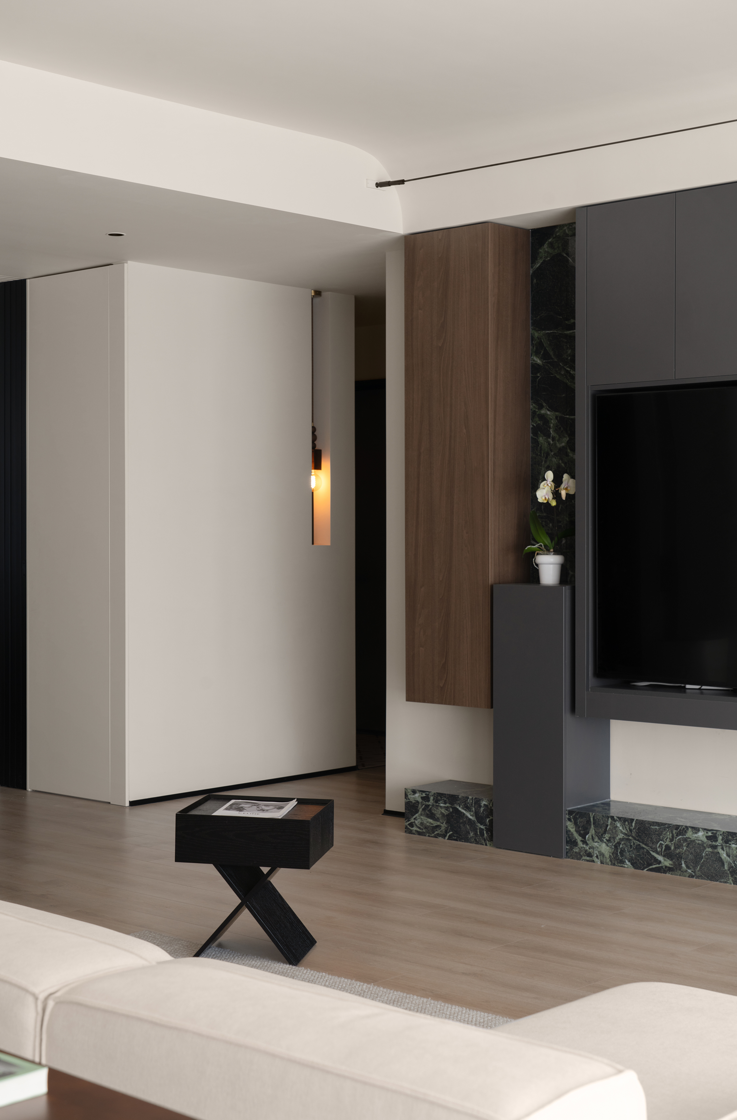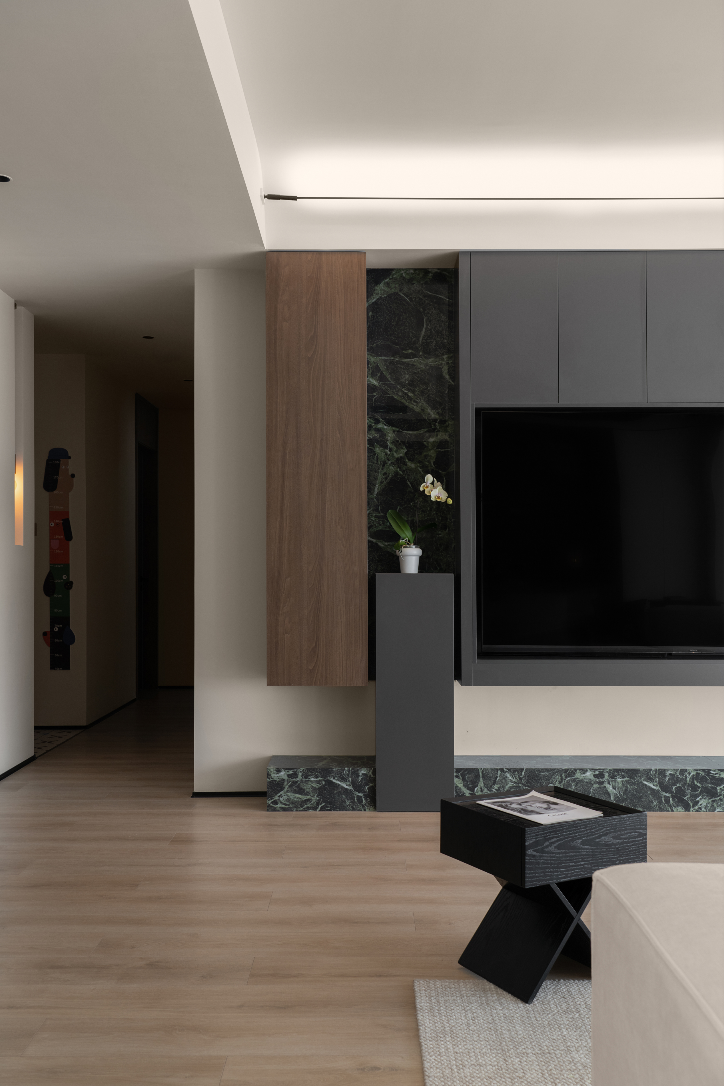 项目定位:本案屋主是位兴趣爱好广泛的女业主,爱好户外的性格也让她更加向往自由无拘的状态,除此之外的居住成员还有两个可爱的小朋友和偶尔过来居住的父母;在综合考虑业主的设计需求,选择以简约纯粹的色彩奠定基调,穿插打破常规的解构主义手法,去营造一个充满艺术美感和极具质感的理想居所。
