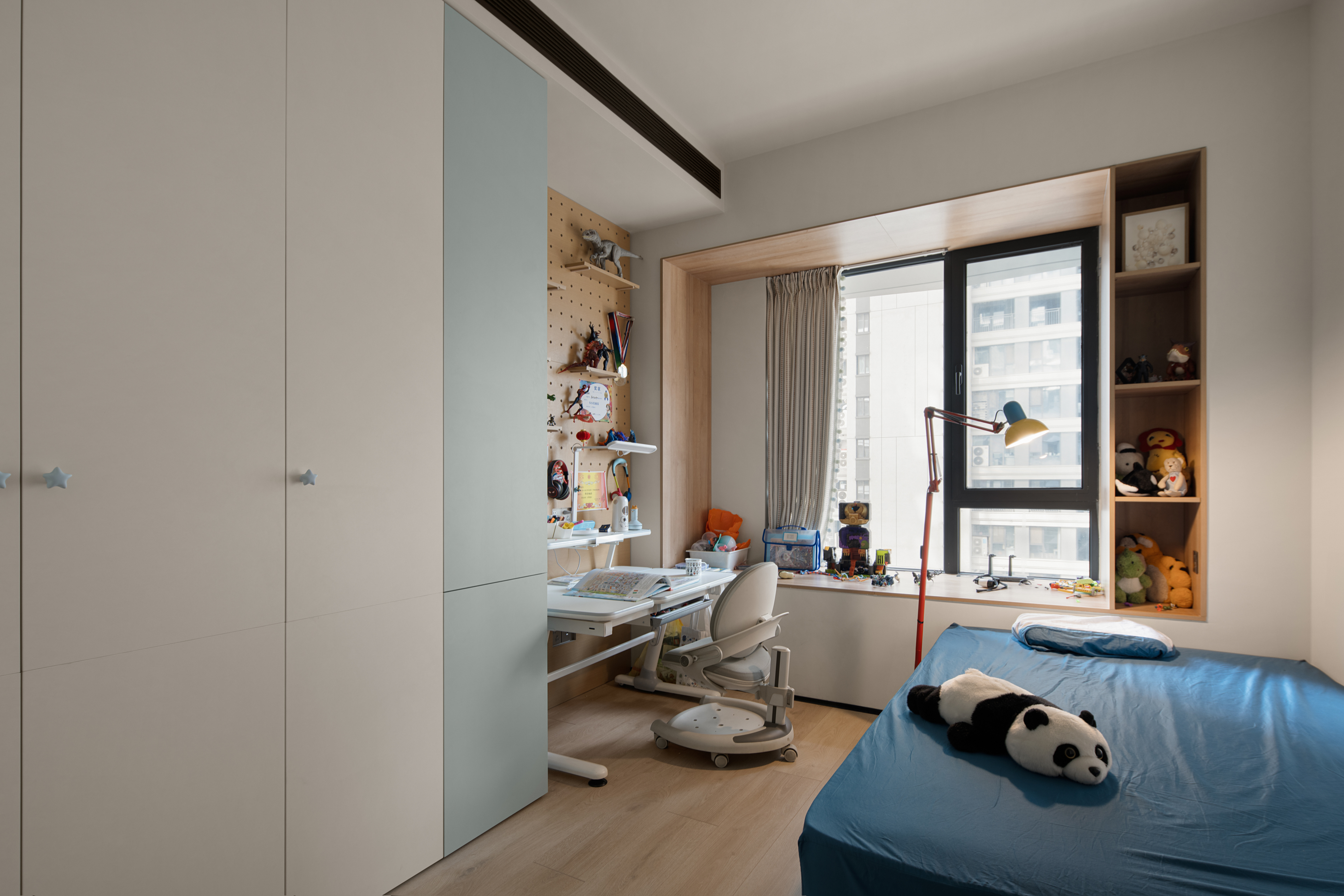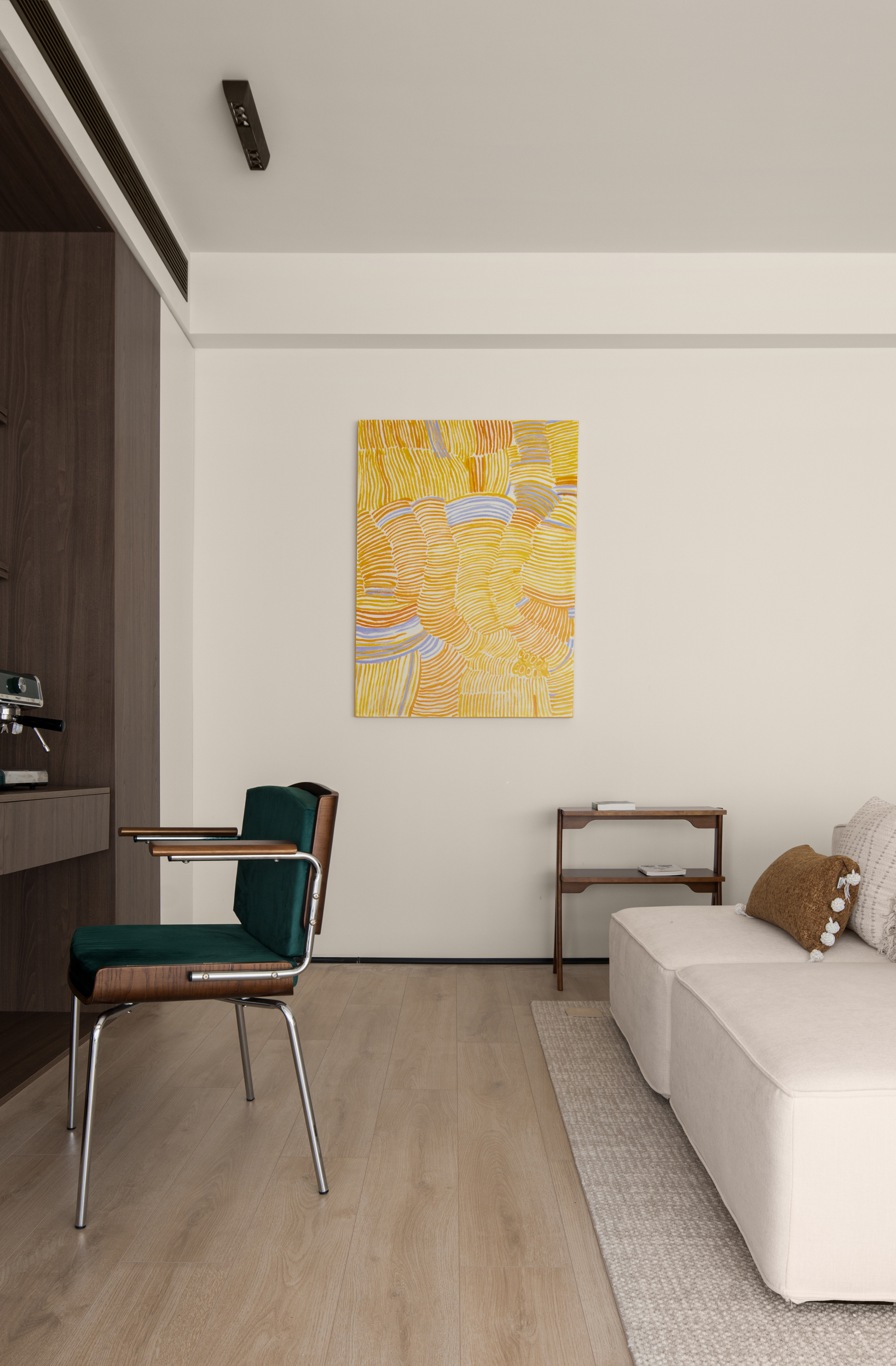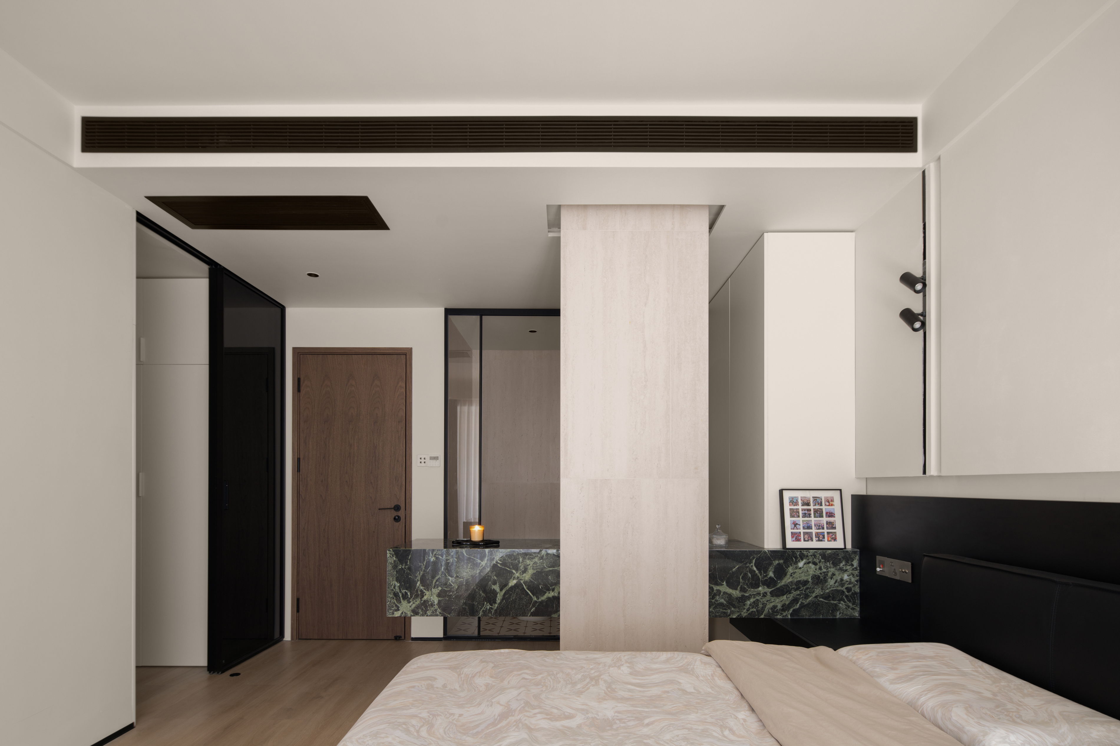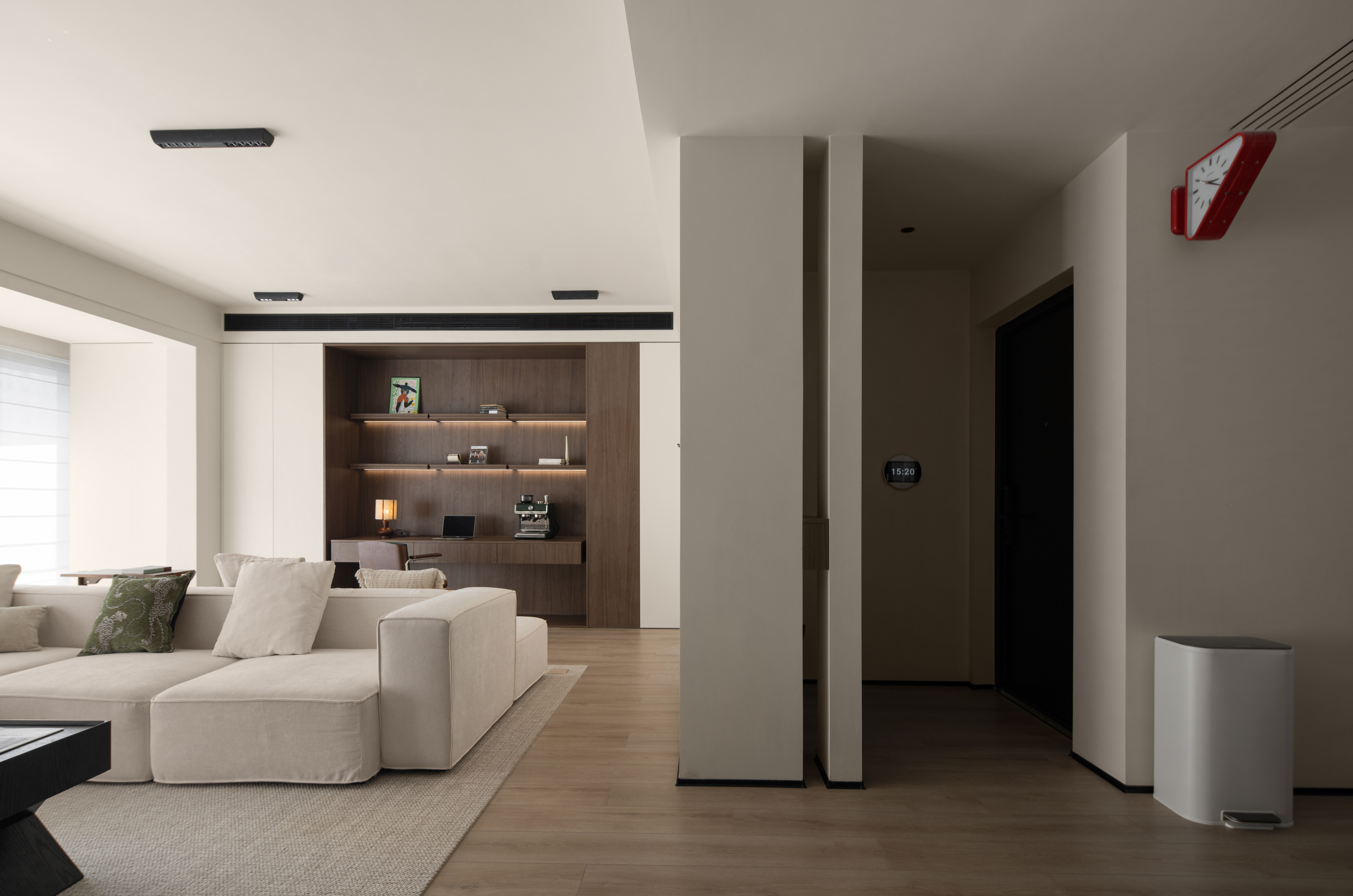 项目定位:本案屋主是位兴趣爱好广泛的女业主,爱好户外的性格也让她更加向往自由无拘的状态,除此之外的居住成员还有两个可爱的小朋友和偶尔过来居住的父母;在综合考虑业主的设计需求,选择以简约纯粹的色彩奠定基调,穿插打破常规的解构主义手法,去营造一个充满艺术美感和极具质感的理想居所。